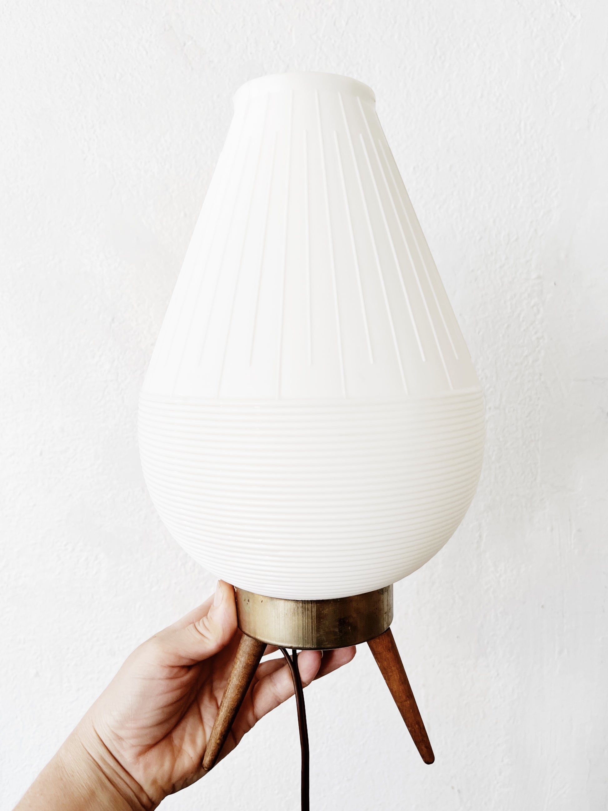 We love these lantern-esque mid century lamps so much. Small tripod teak and metal base holds a molded plastic shade which diffuses light beautifully. Switch is underneath. Takes a standard bulb. In lovely condition