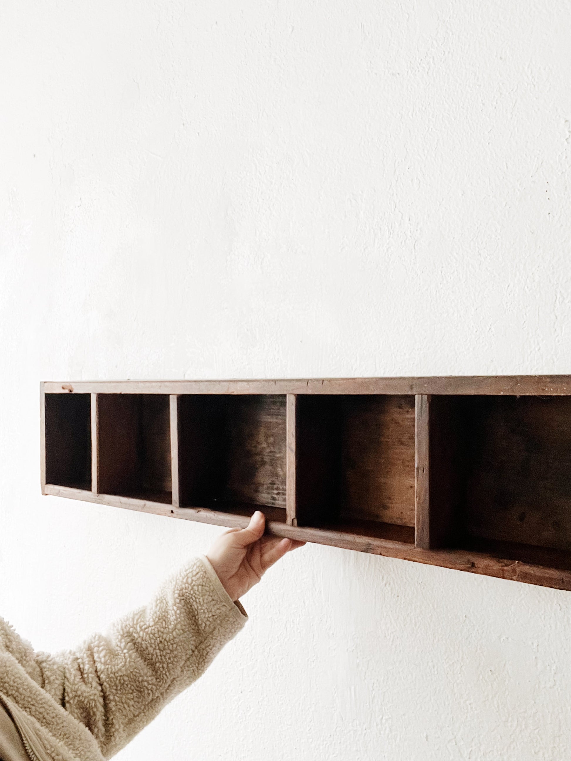 A real oldie here. Primitive dark fir wood is smoothed with age and showcases what’s inside like little gems in a jewel box. Hang this in either direction to suit your needs. It stands equally as well on the floor. Some minimal paint specking but adds to the overall look