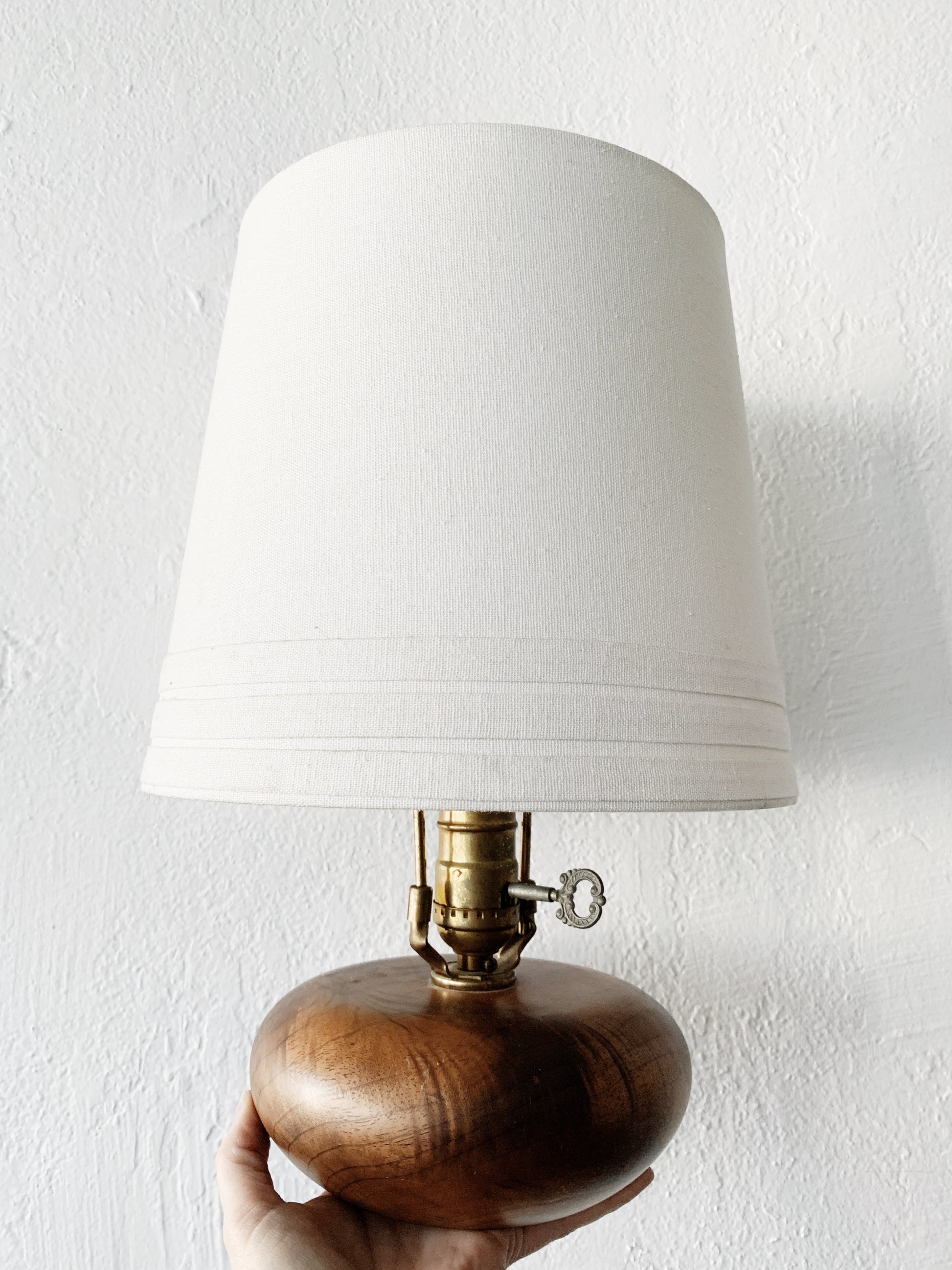 Gorgeous vintage handmade wood orb lamp with skeleton key switch. Lovely! Works great. Comes with the brass harp, finial and shade.