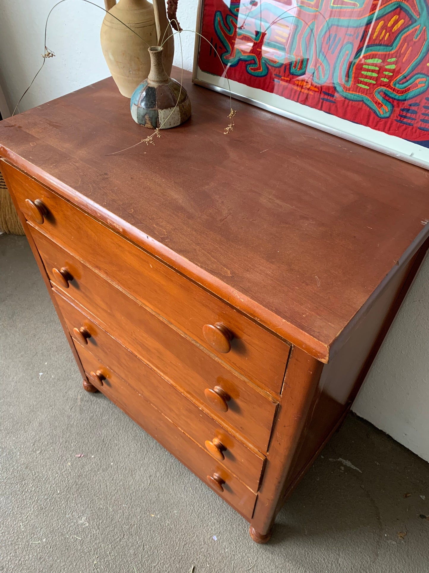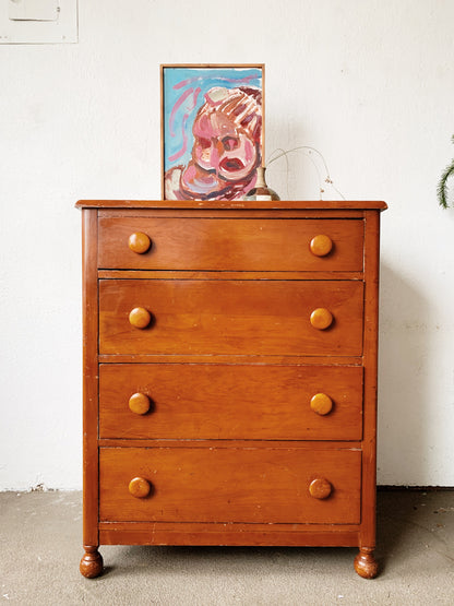 A super solid chest of drawers in honey maple. On the petite side. Overall a lovely vintage dresser with minor age markings. Love the bun feet and round knobs.
