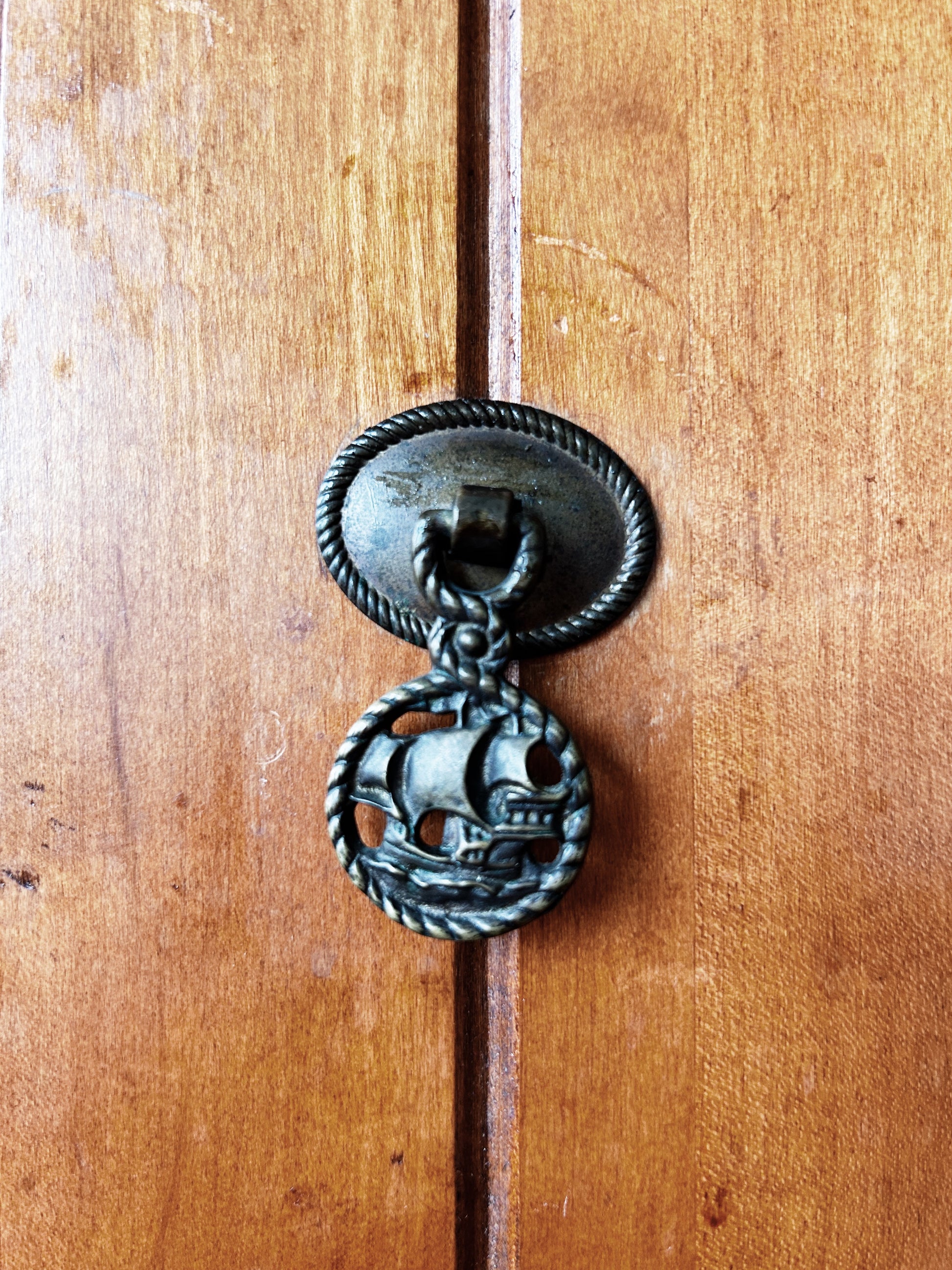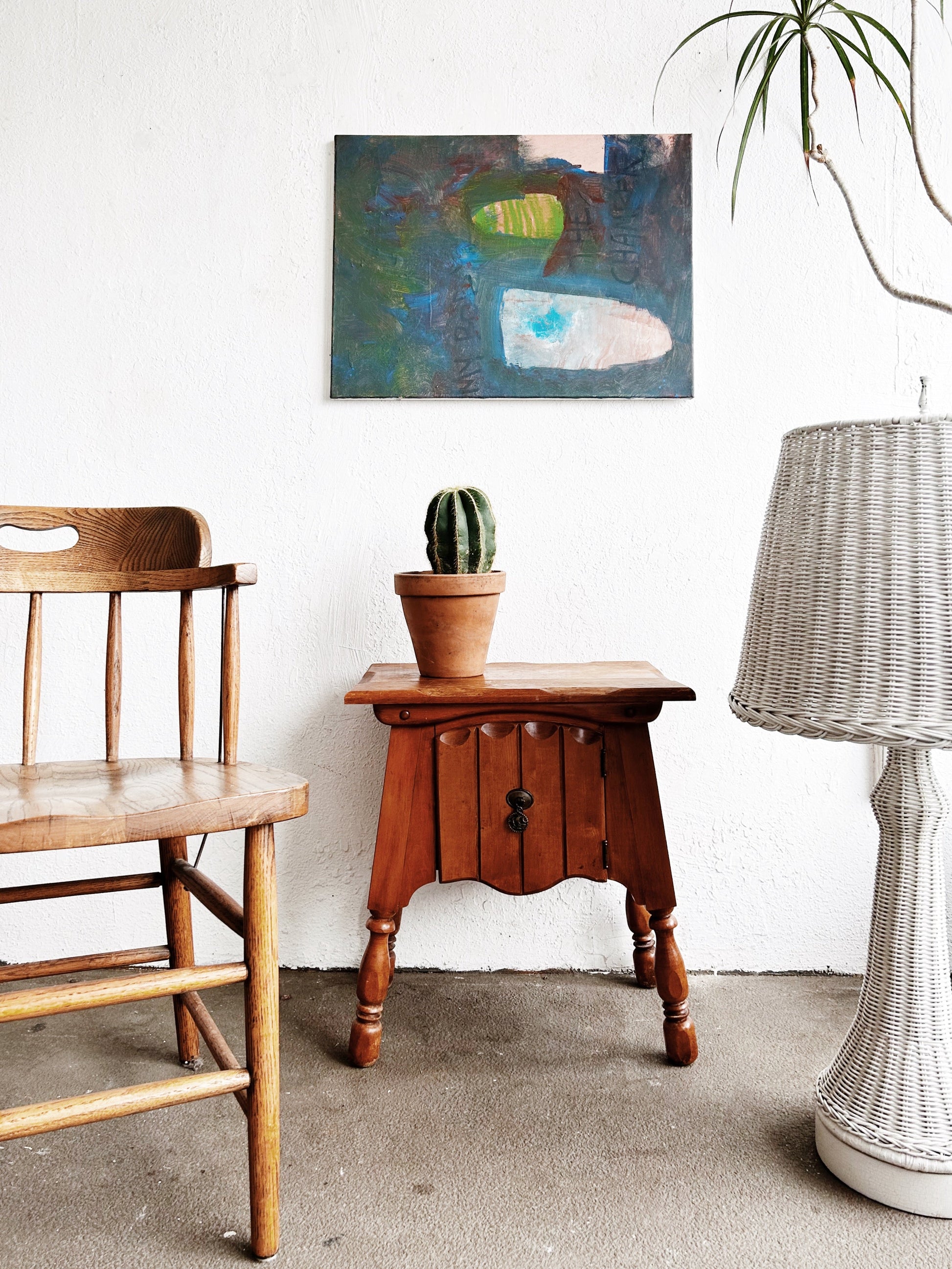 Cutest little 1940’s Rancho style telephone cabinet with brass ship door hardware. Solid as a rock, top could be sanded and refinished should you desire.