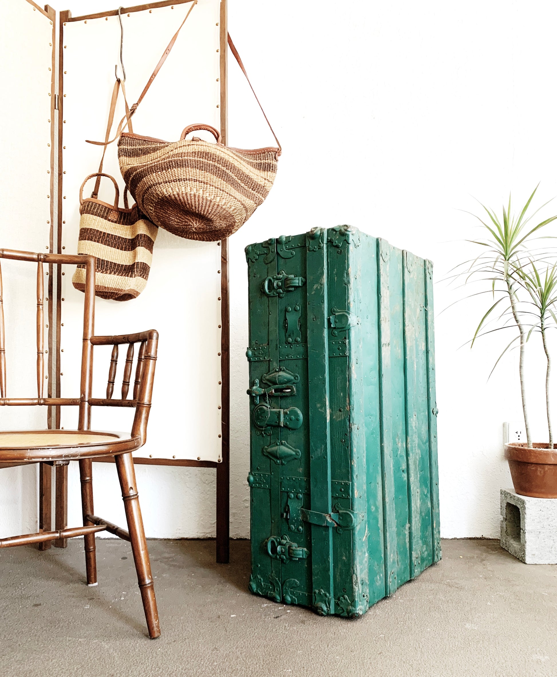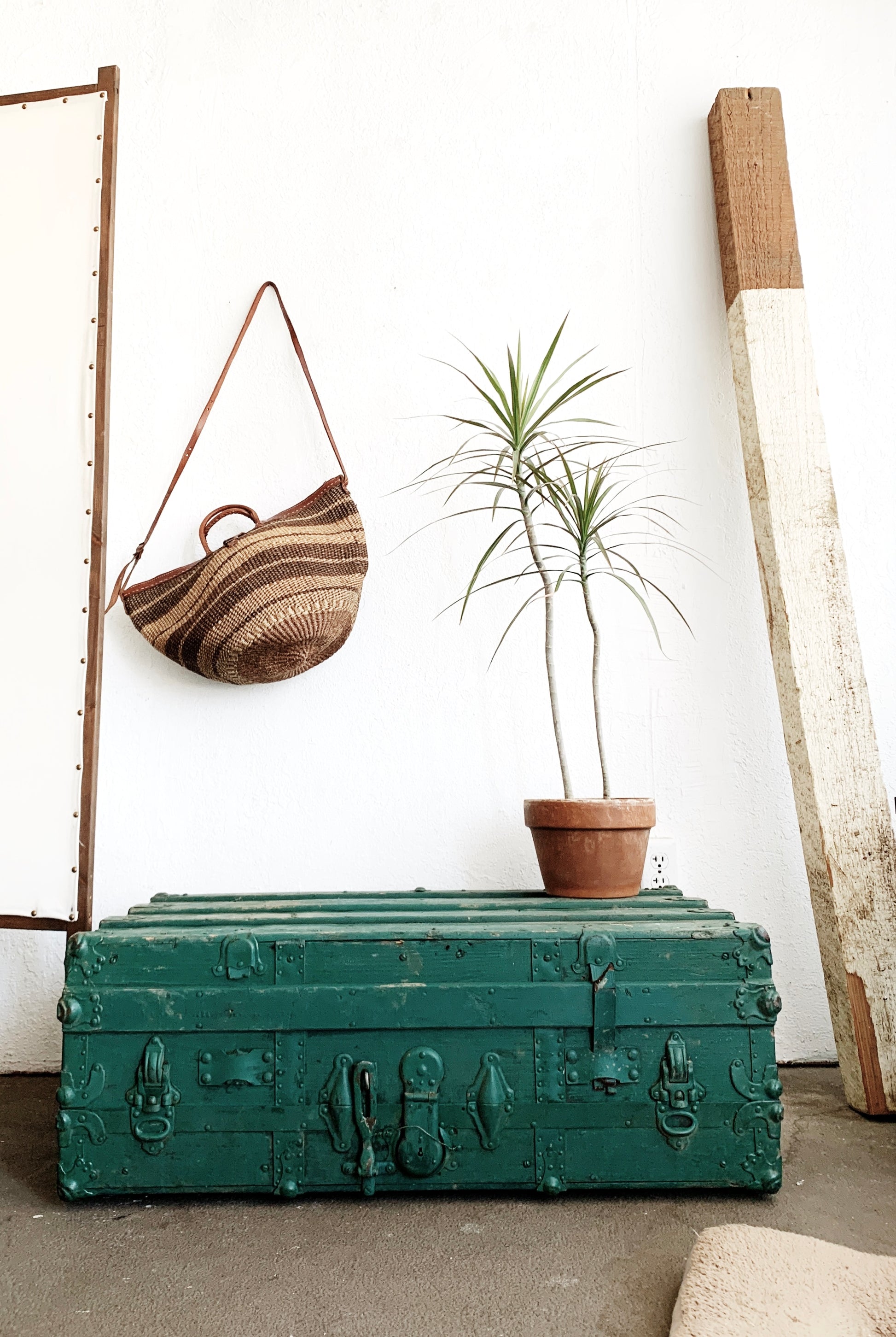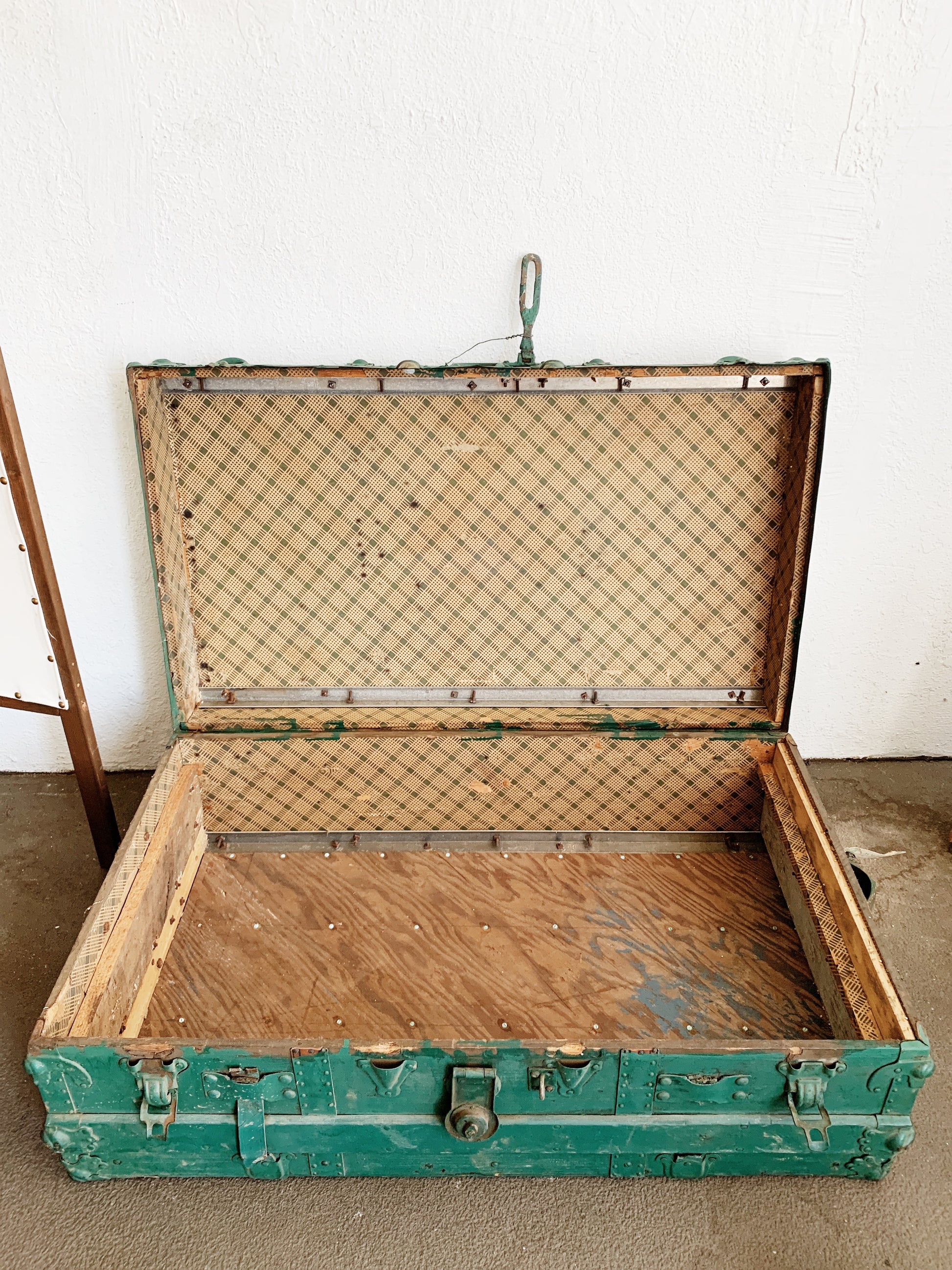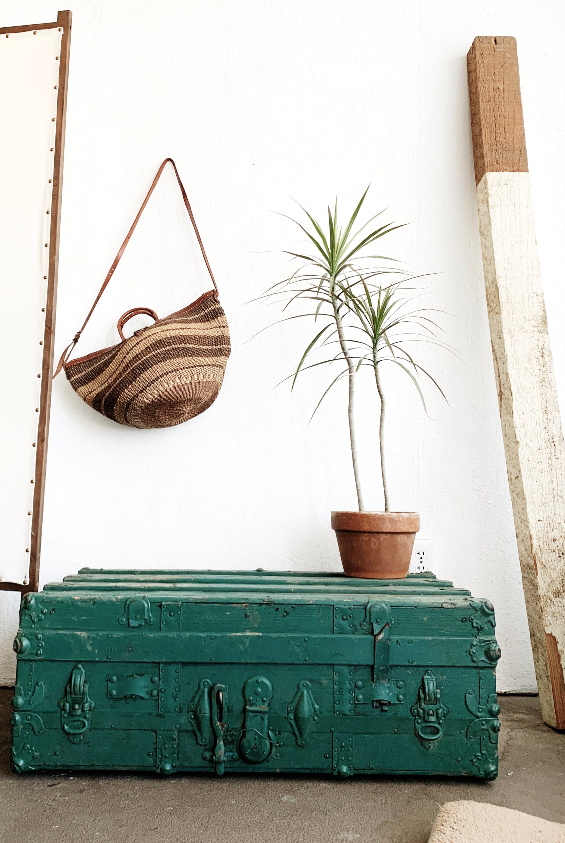 sturdy old wood trunk painted Kelly green. Clean inside and no weird smells. Has one functional leather handle. Latches all work. A nice one ! Makes a great low coffee table or handsome storage chest.