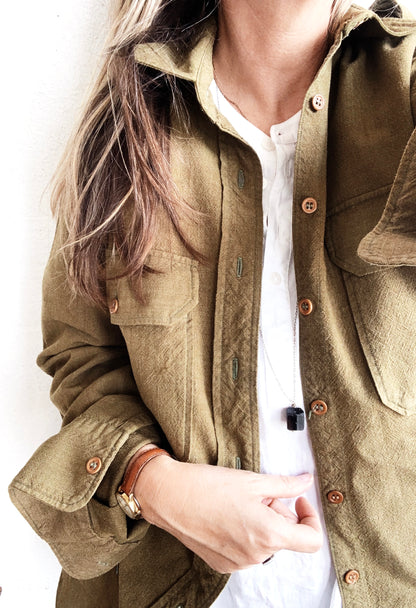 Classic long and lean vintage gabardine button up shirt jacket. Excellent condition. Fit is men’s small, women’s medium.
