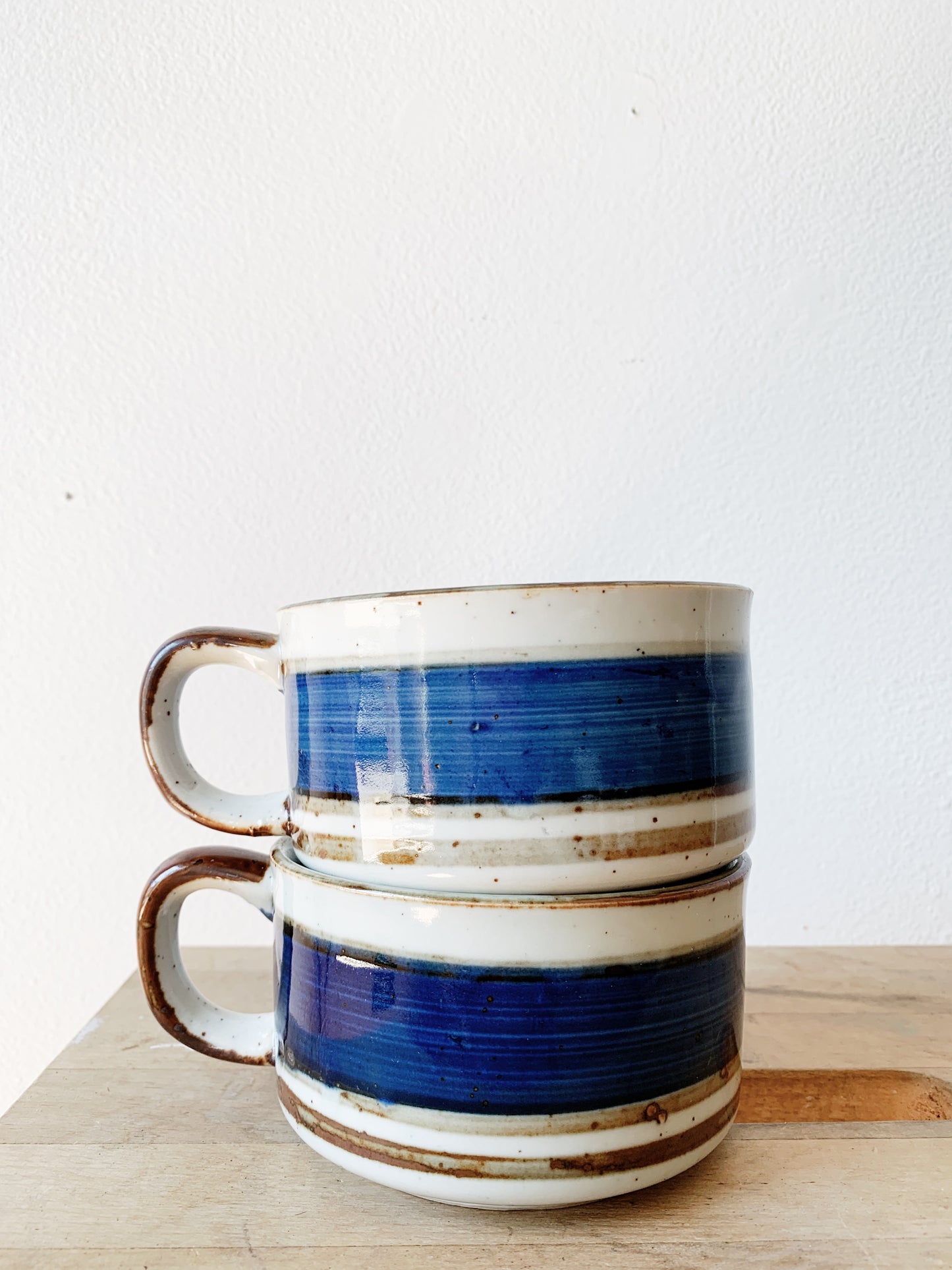 1970’s ceramic blue striped mugs. Soup size! In excellent condition. Approx 16 oz