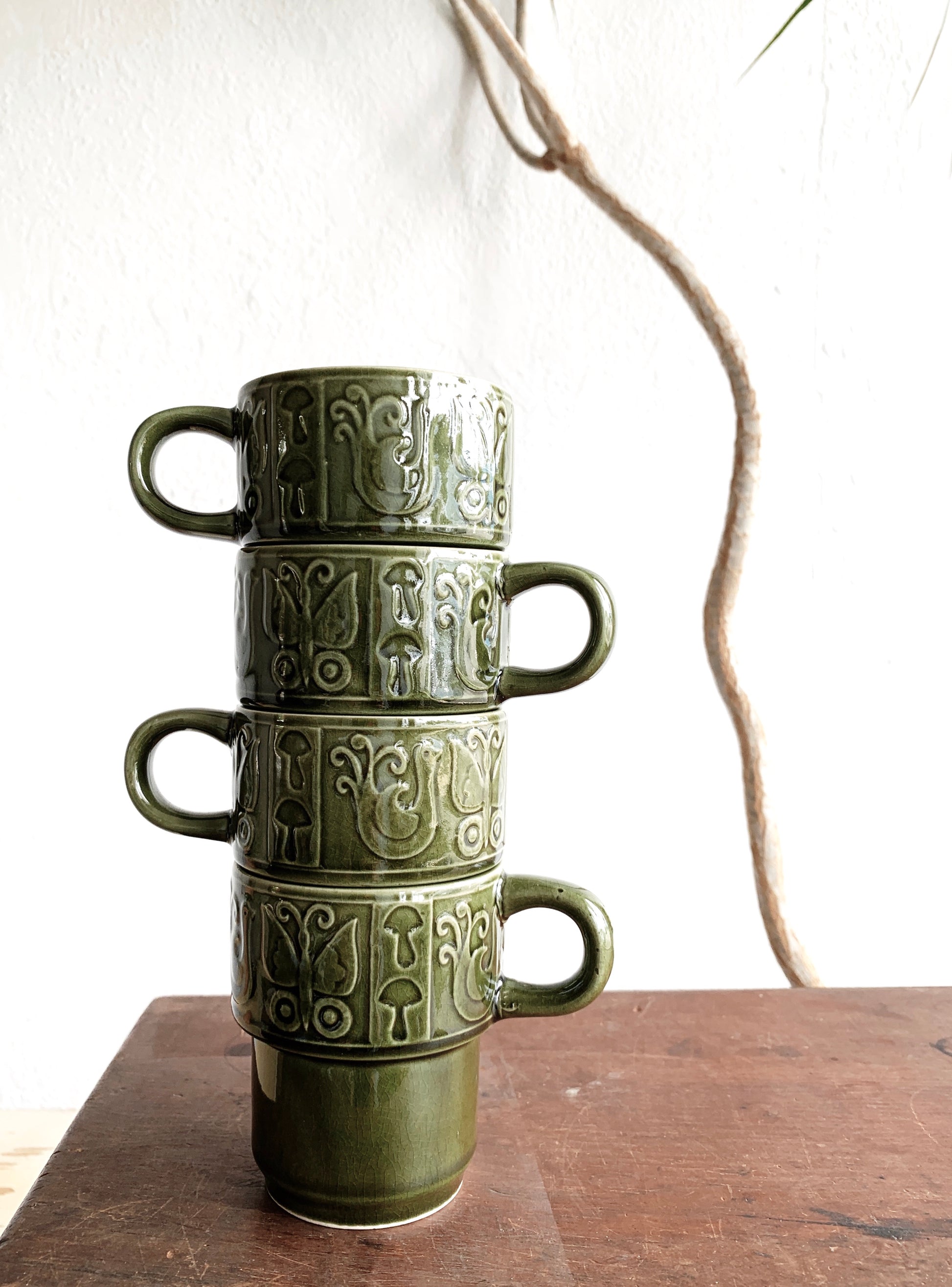 A fantastic set of four Japanese pottery mugs in the best olive green. Little mushrooms, butterflies and doves! Love these