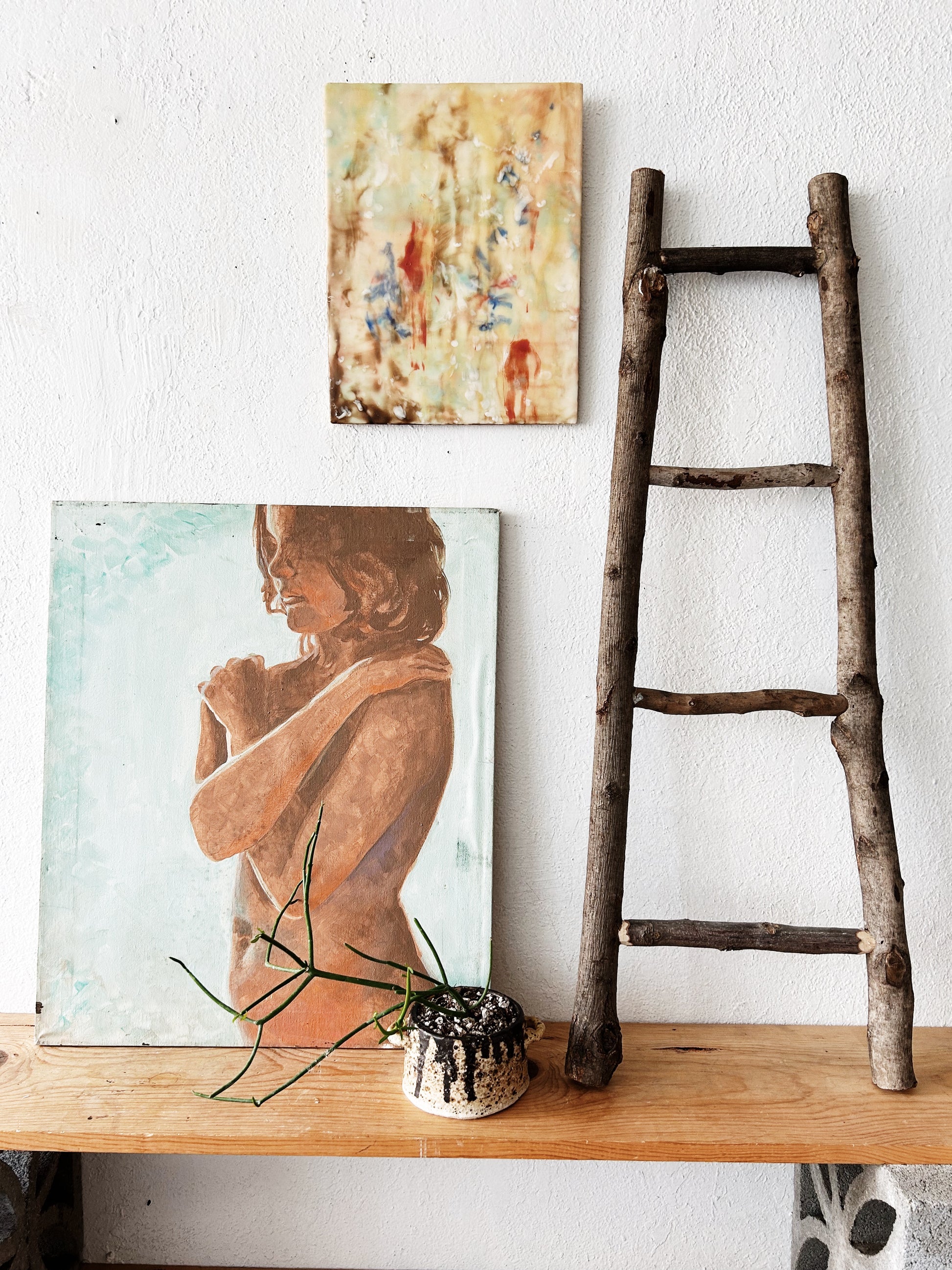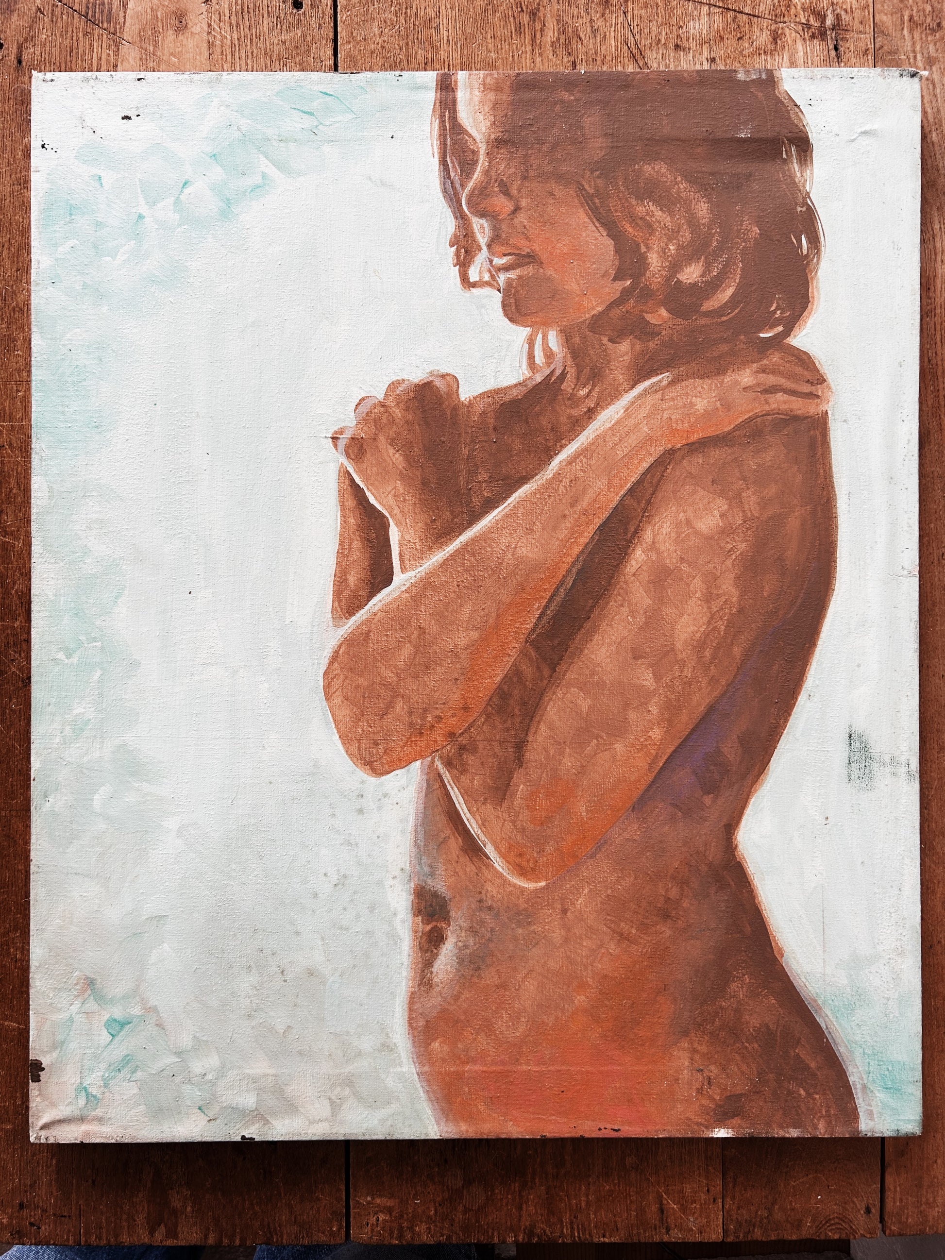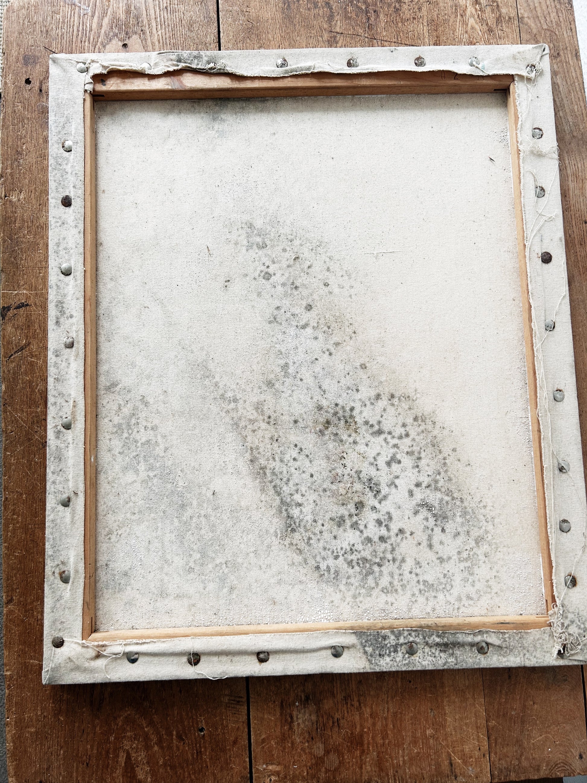 Wonderful 1970’s oil portrait. Stretched canvas over wood frame. Really love the turquoise and browns. Beautifully done but not well cared for, looks like it was exposed to moisture, slight rippling on the right and mildew residue to the back. BUT couldn’t pass her up! Priced accordingly