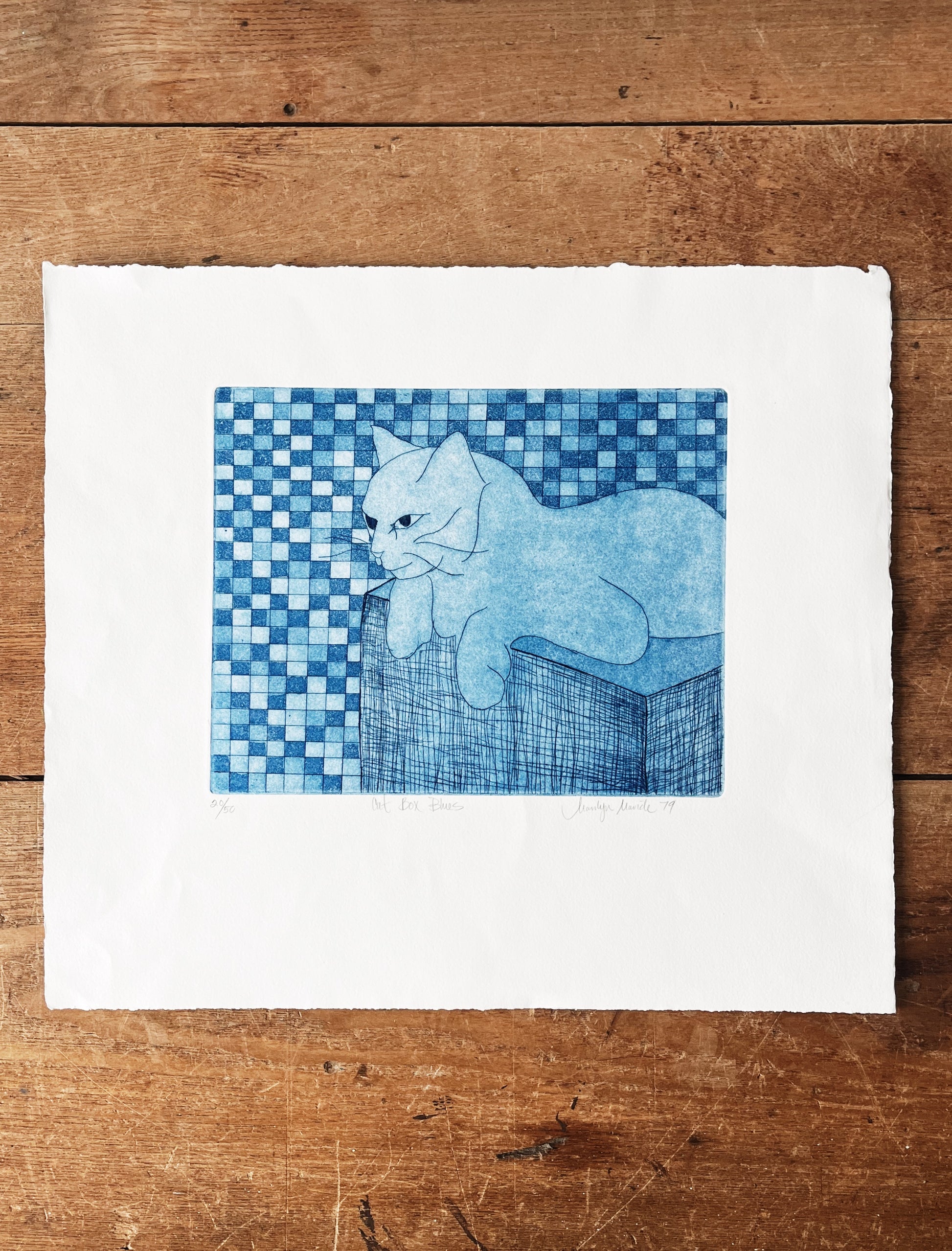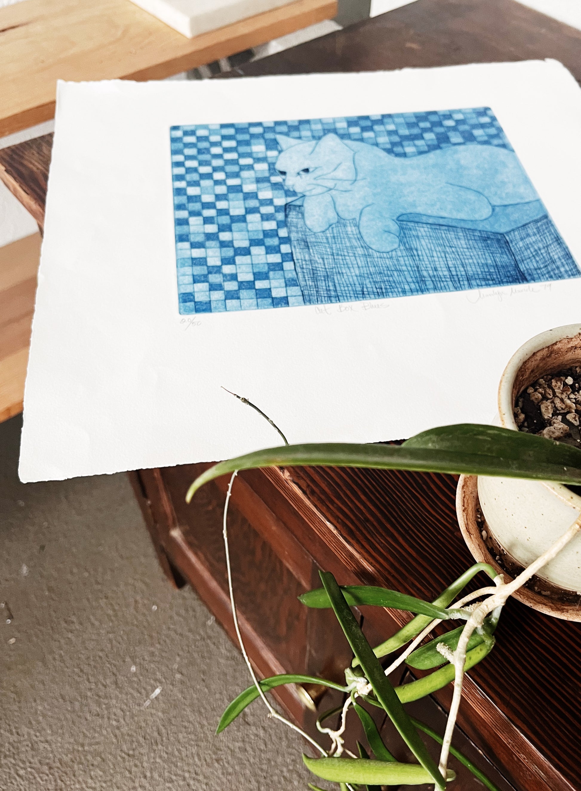 Vintage original etching titled ‘cat box blues’ by prolific Pacific Northwest artist Marilyn Maricle. Printed on thick creamy archival paper with deckled edge. Numbered dated and signed