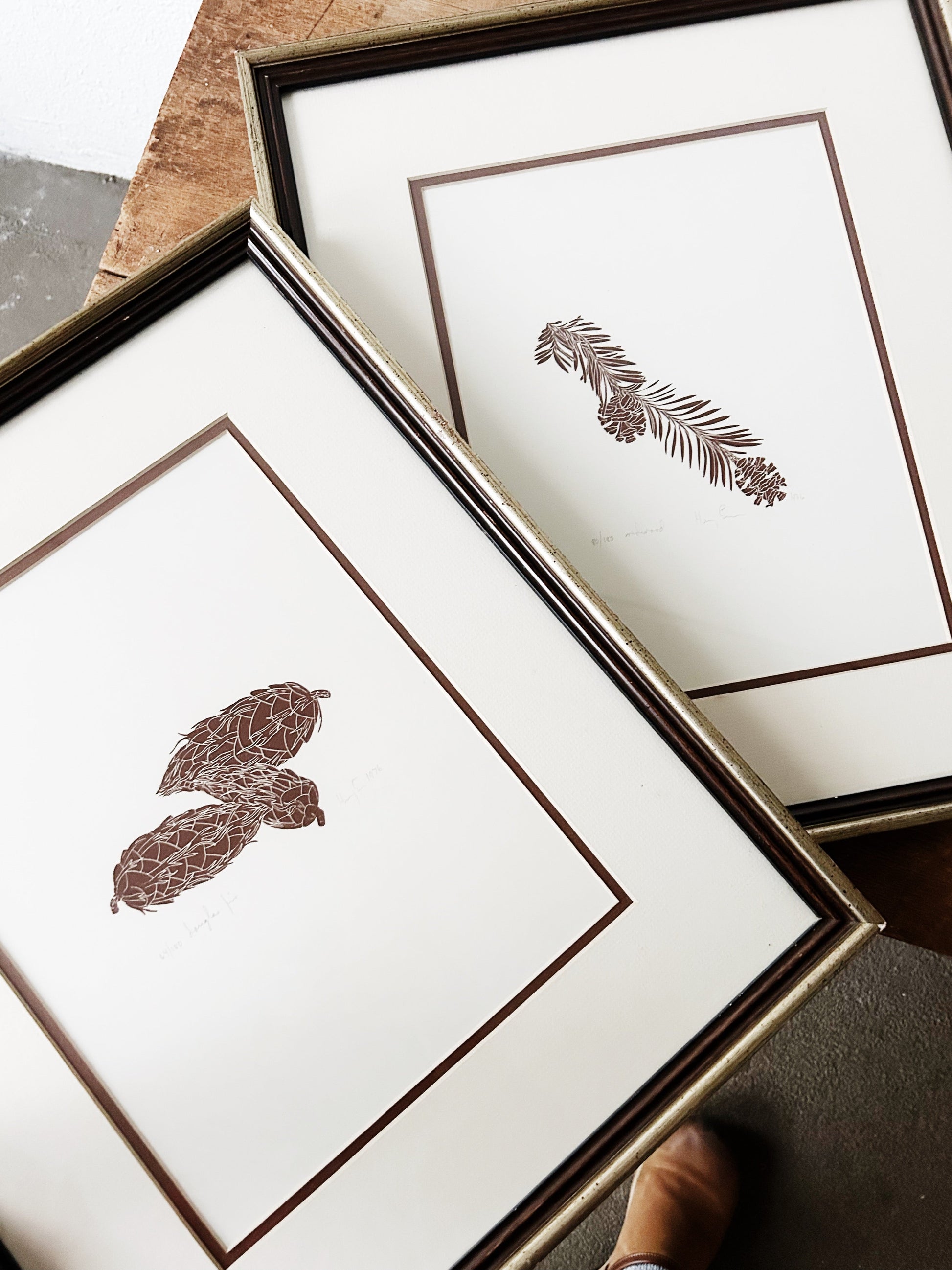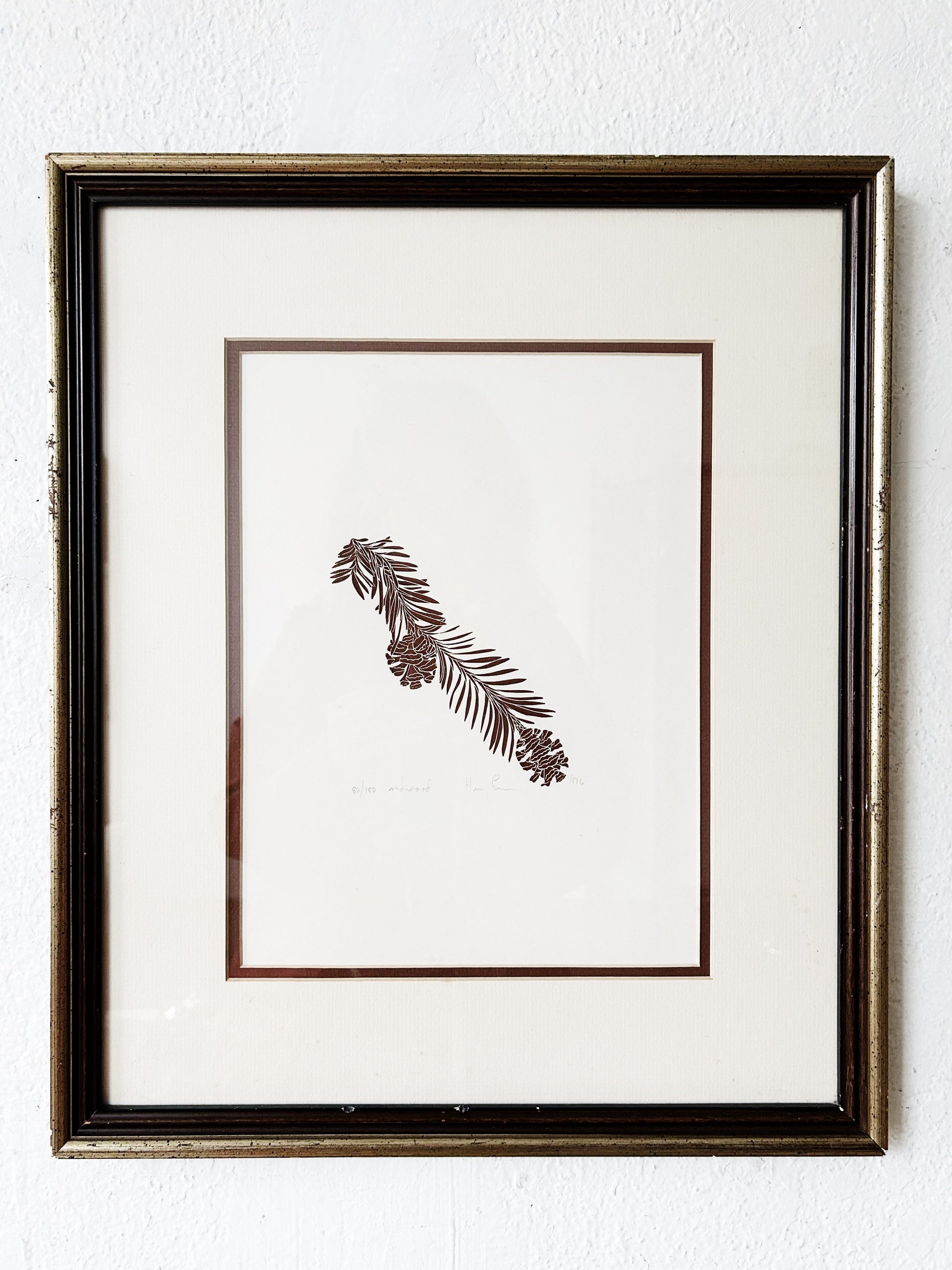 Douglas Fir and Redwood original etching. Signed numbered and dated, 1976. Professionally matted framed with hangers on back. Sold separately, please chose