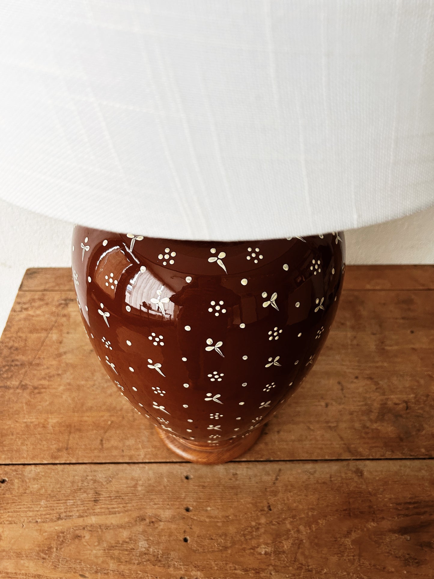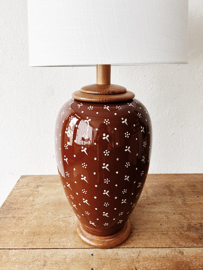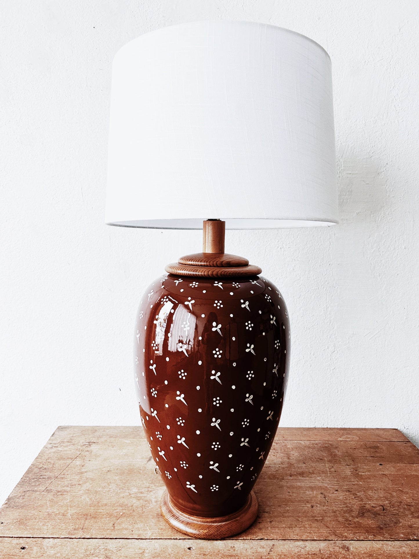 love this 70’s table lamp! Brown painted glass, oak neck and base, and a newer white linen shade. In beautiful condition.