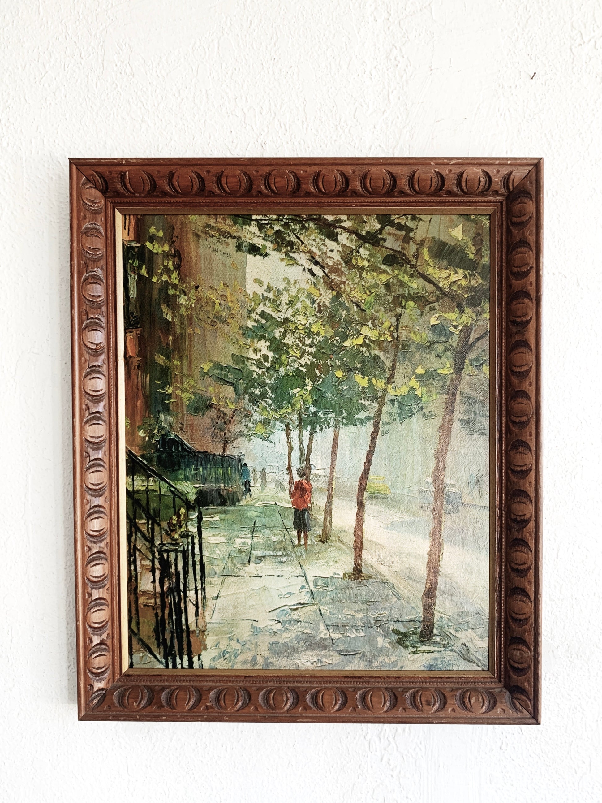 Wonderful 1970’s litho in an equally lovely carved wood frame. Looks just like a painting with oil brushstrokes! Tricked the eye