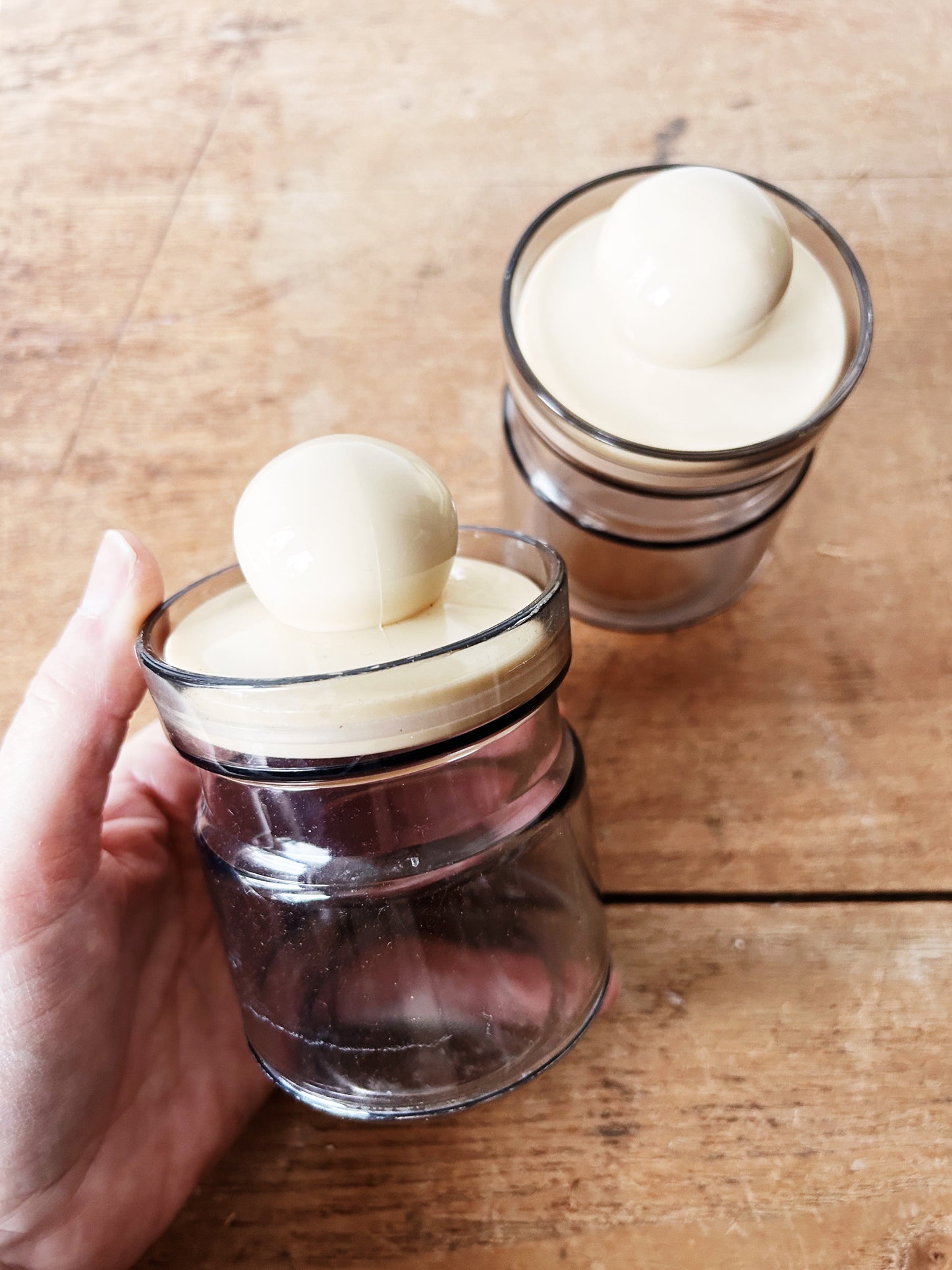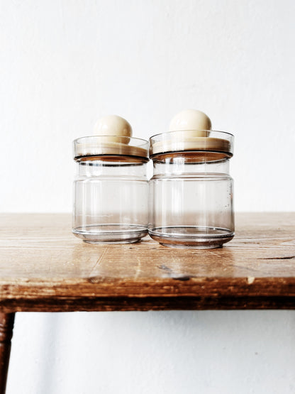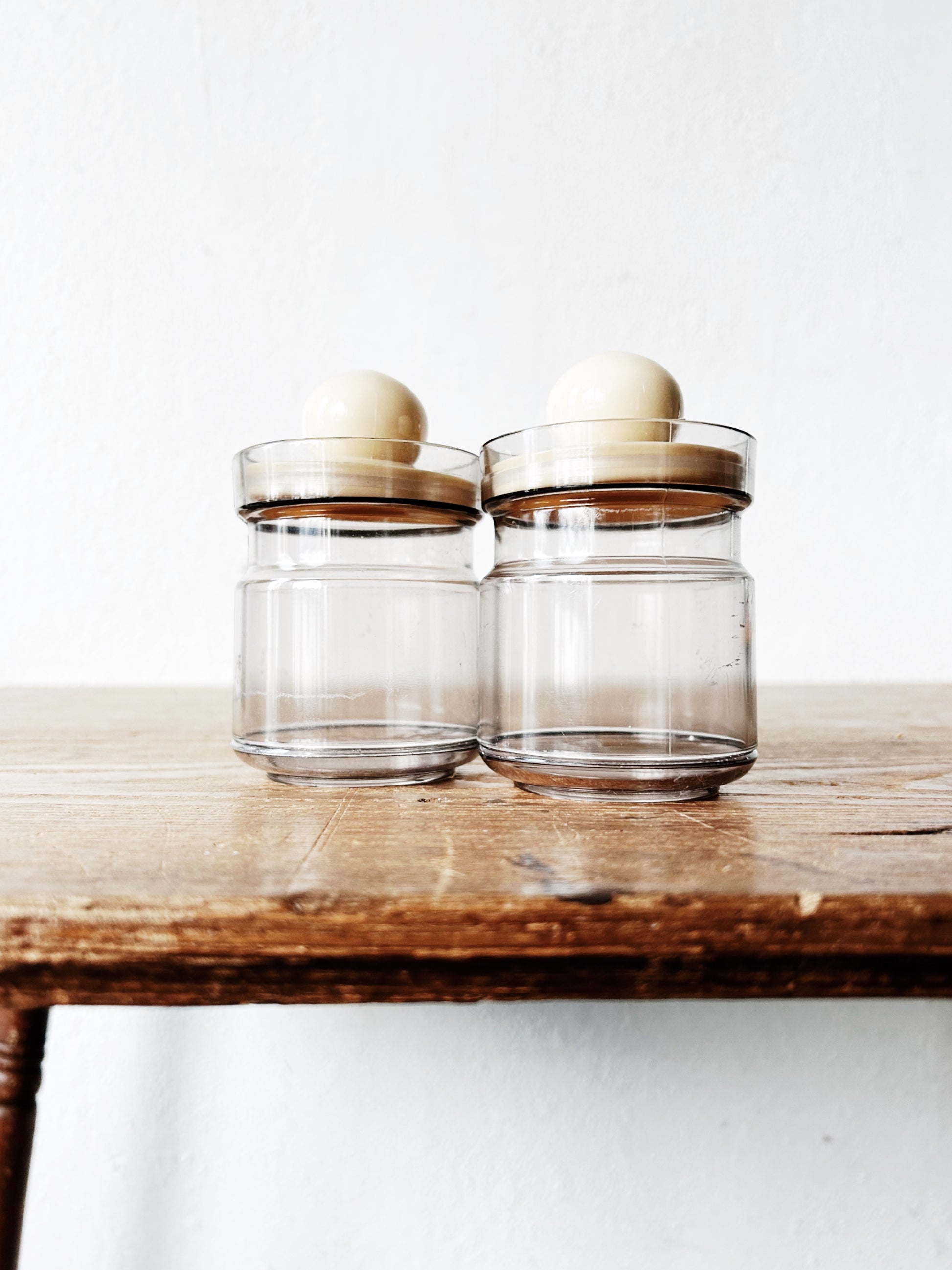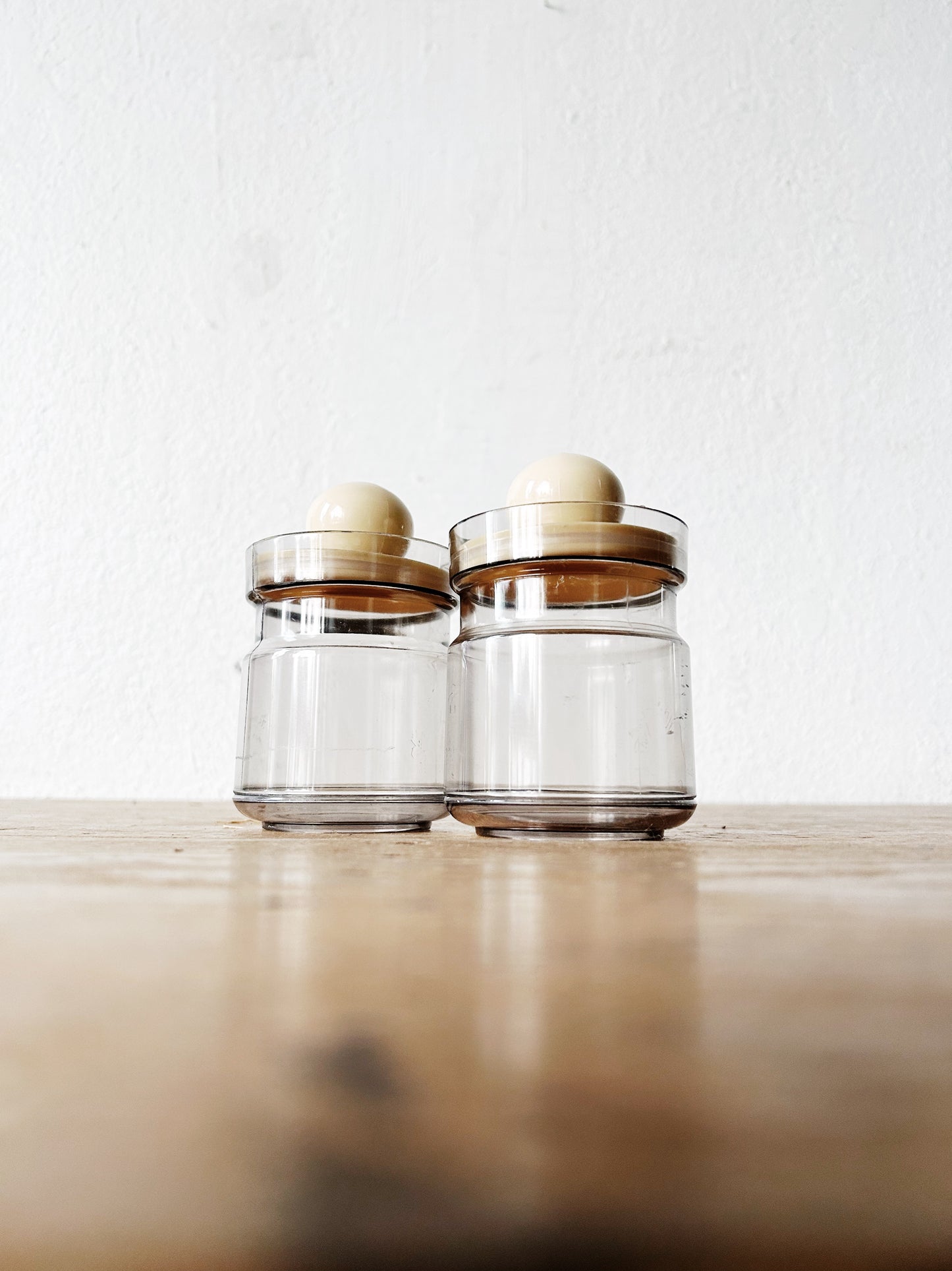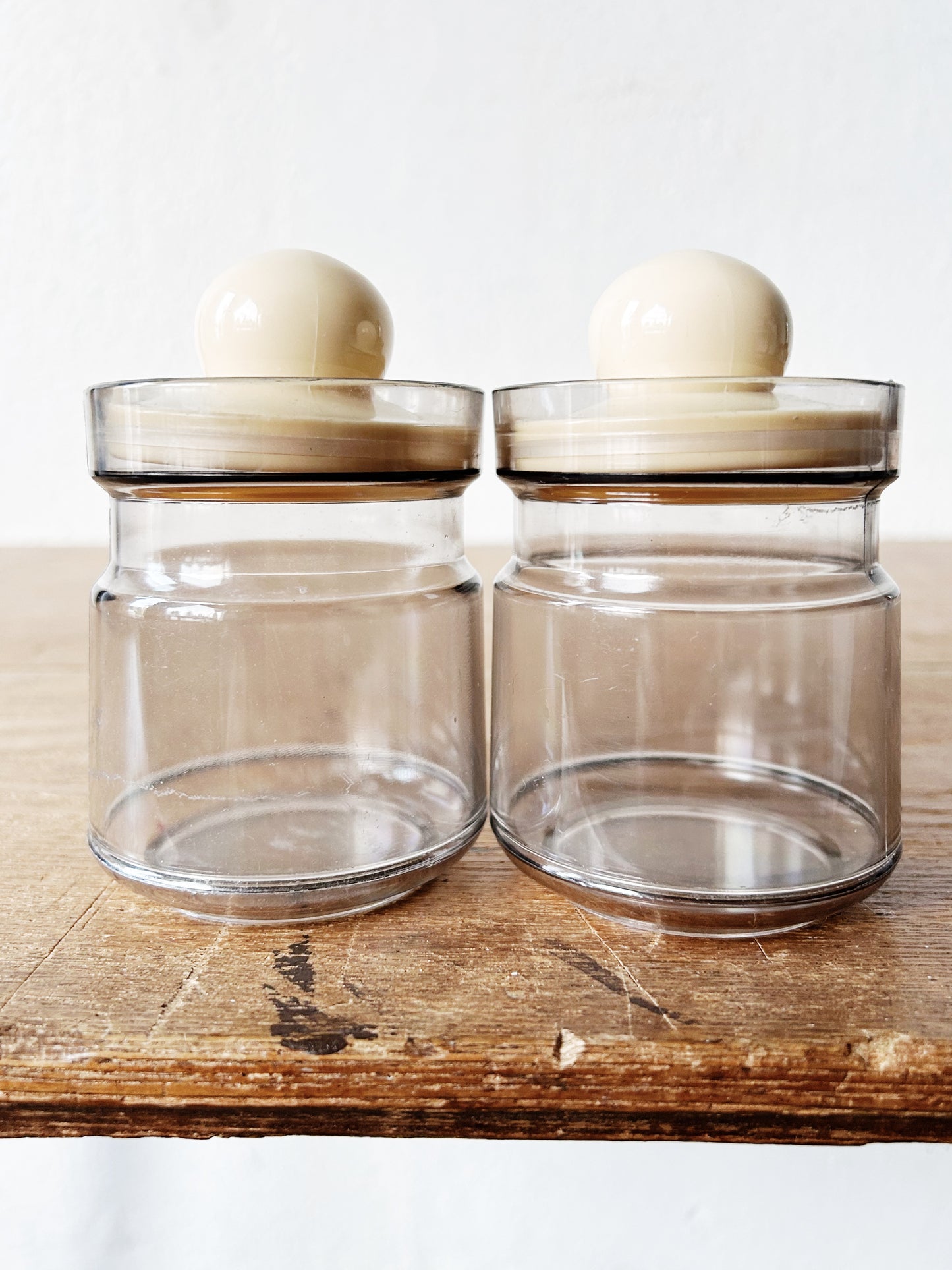 smoky thick acrylic with cream suction lids. Made in Hong Kong. Fun in the bathroom or kitchen