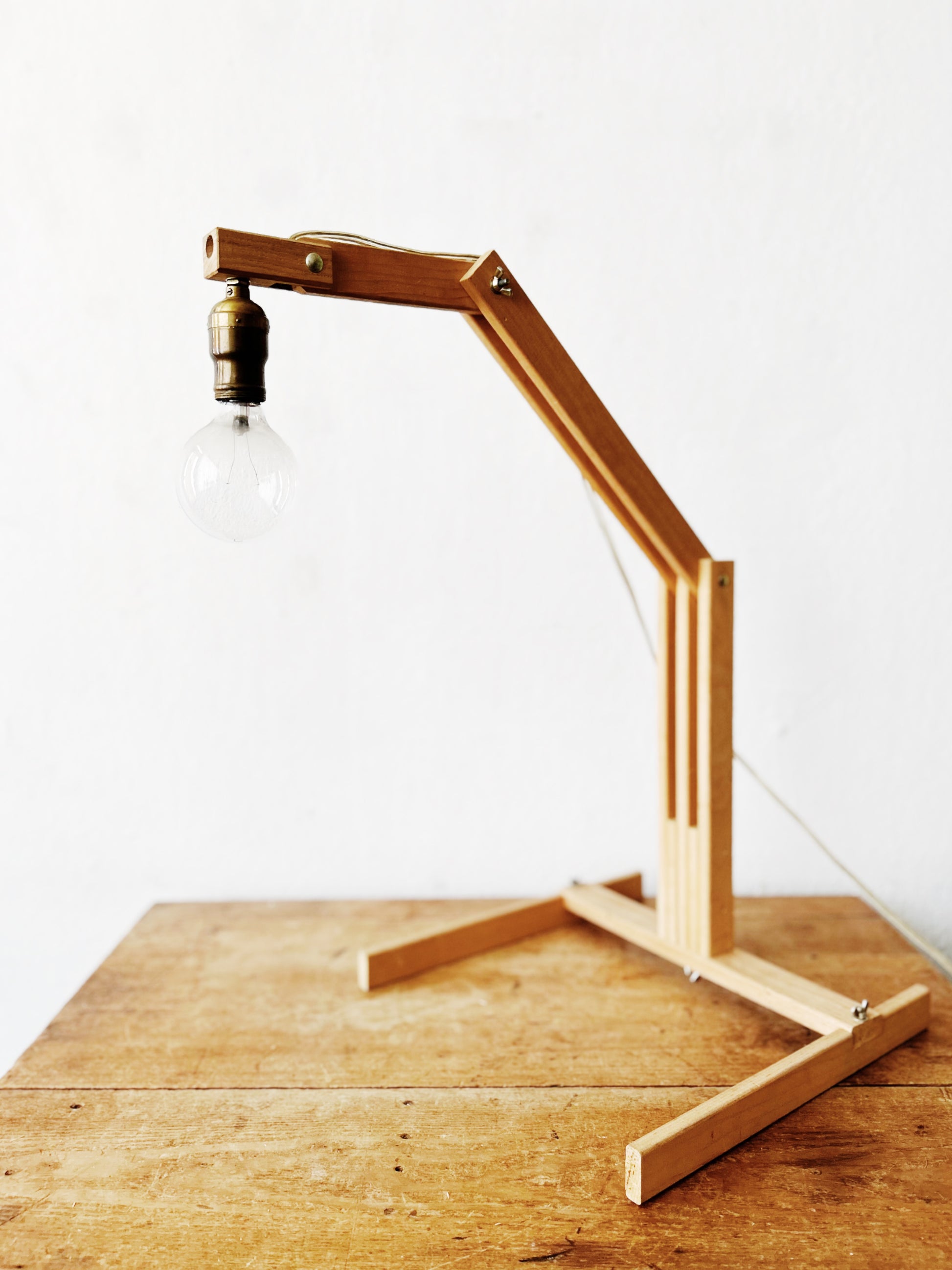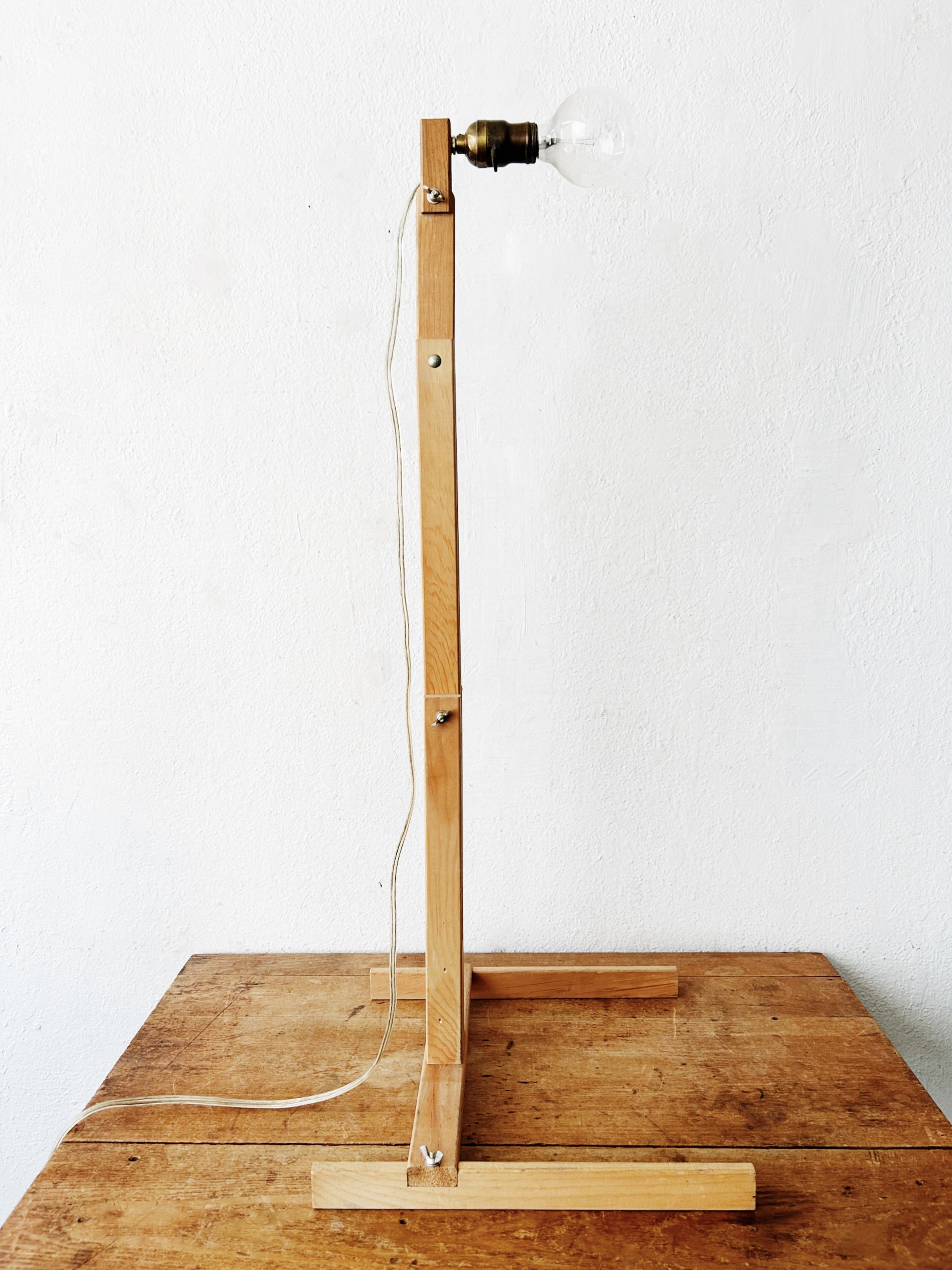Totally rad natural wood lamp from the 1970s. Craft modern style. Completely posable. Has an old antique brass fitting and nice long cord. Easy to add a shade if you please. Works great!