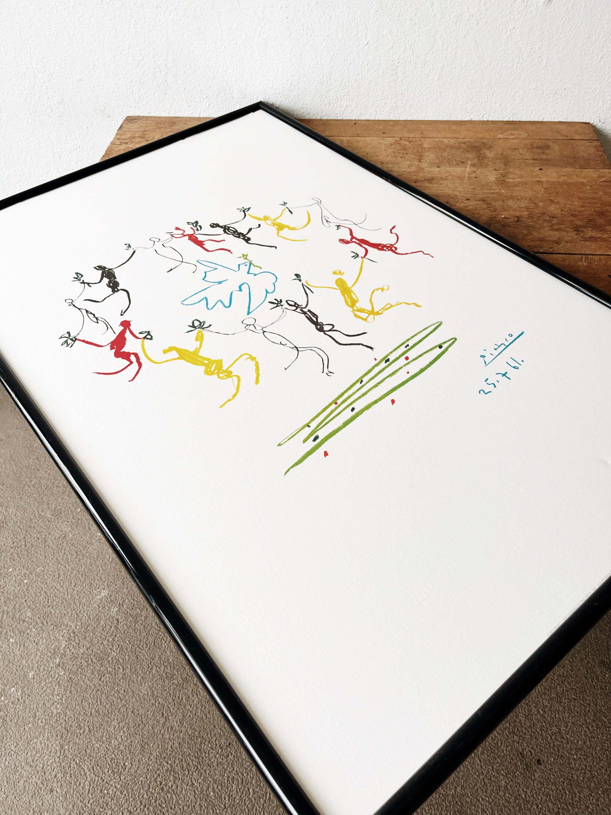 Vintage Picasso Dance of Youth / All Nations Under Peace lithograph from 1974, printed on heavy art paper. Quality lithographic print. Larger in size. Framed in a simple plastic frame without glass.