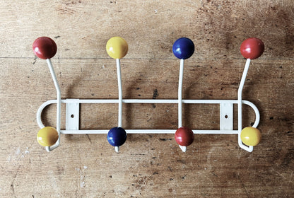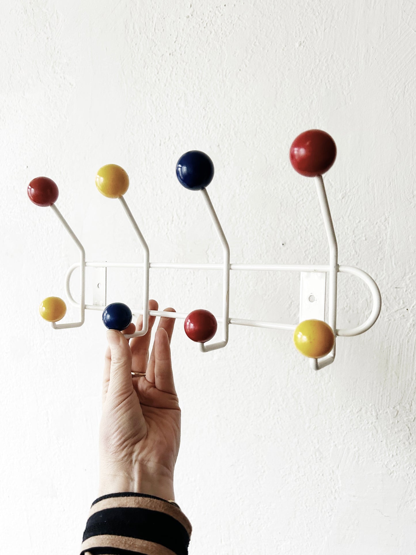 Awesome 1980's Mod hook rack in Memphis Design color trends of white metal base with blue, red, and yellow painted wood balls.
