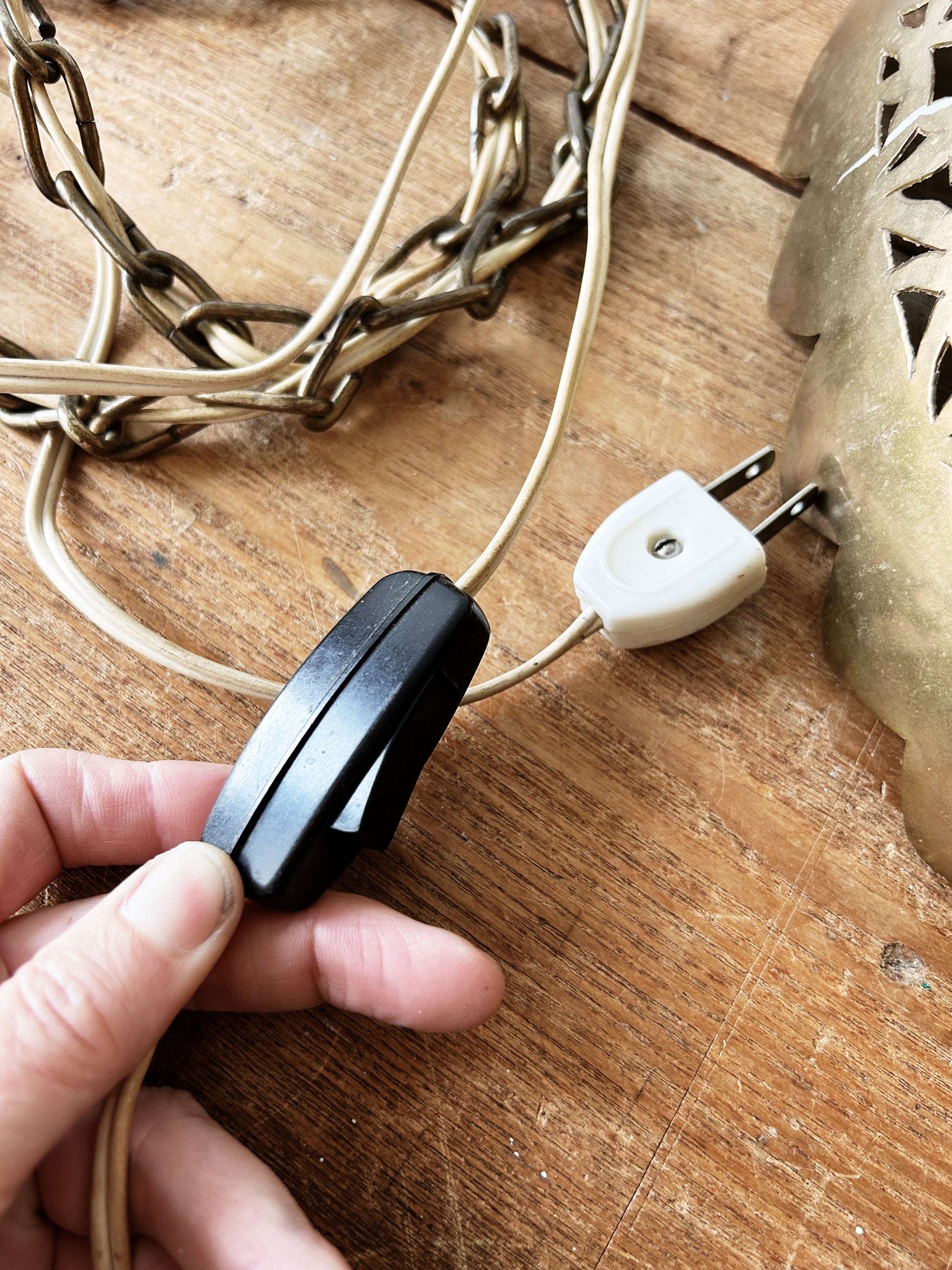 long cord with chain, plug end, rocker switch on cord. standard sized bulb socket