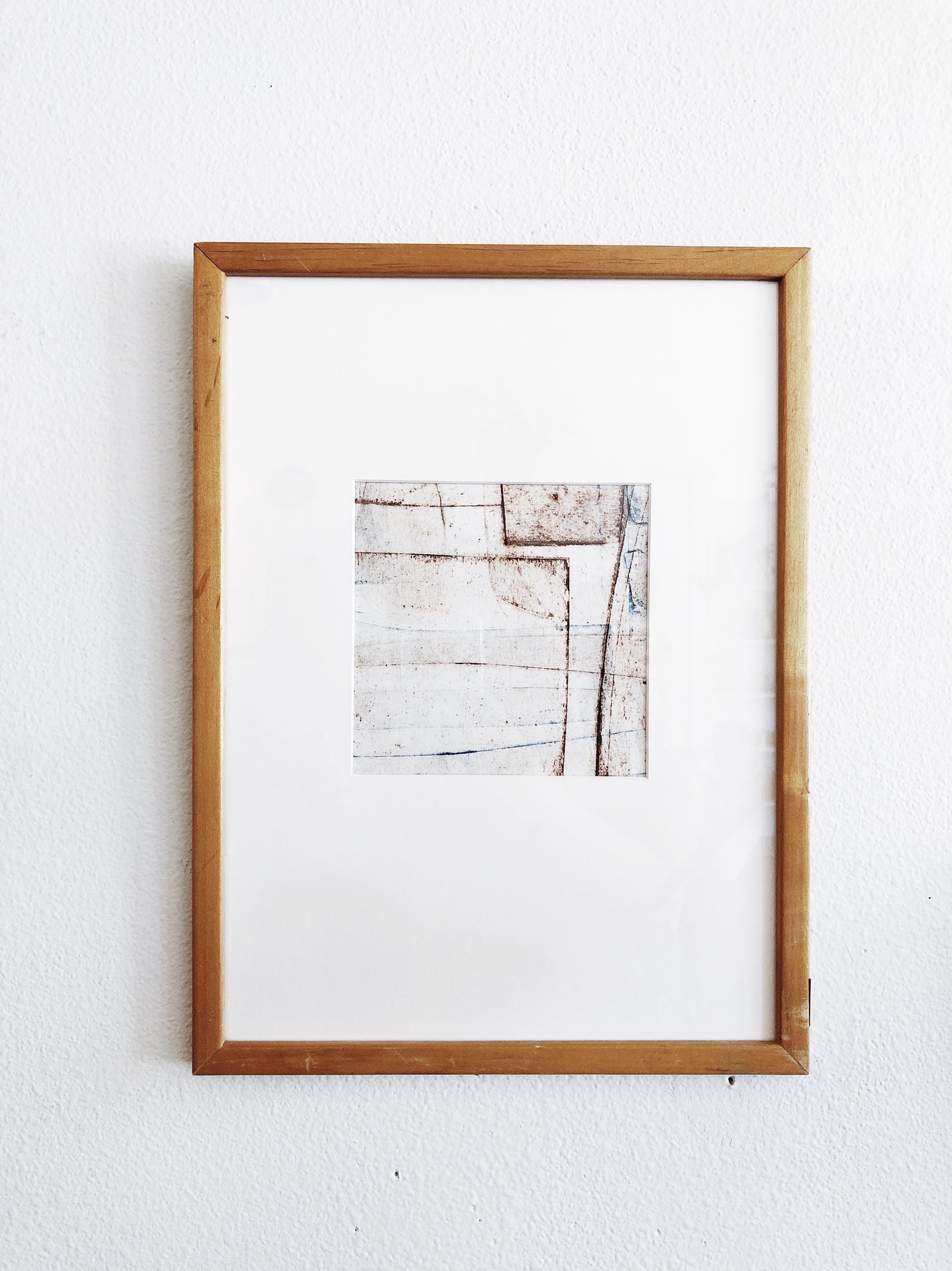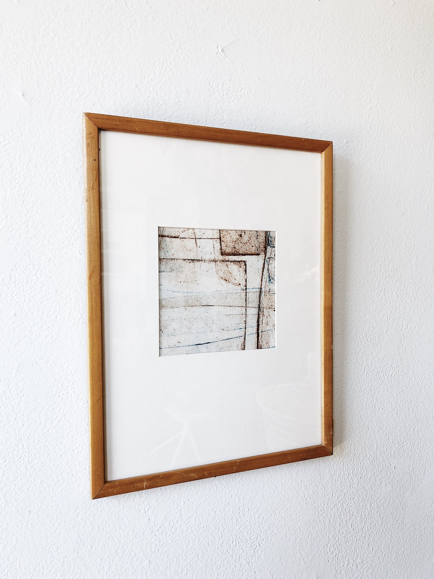 Abstract modernist engraving by local artist Nancy Wilkins. Matted in thick stock and framed in vintage wood.
