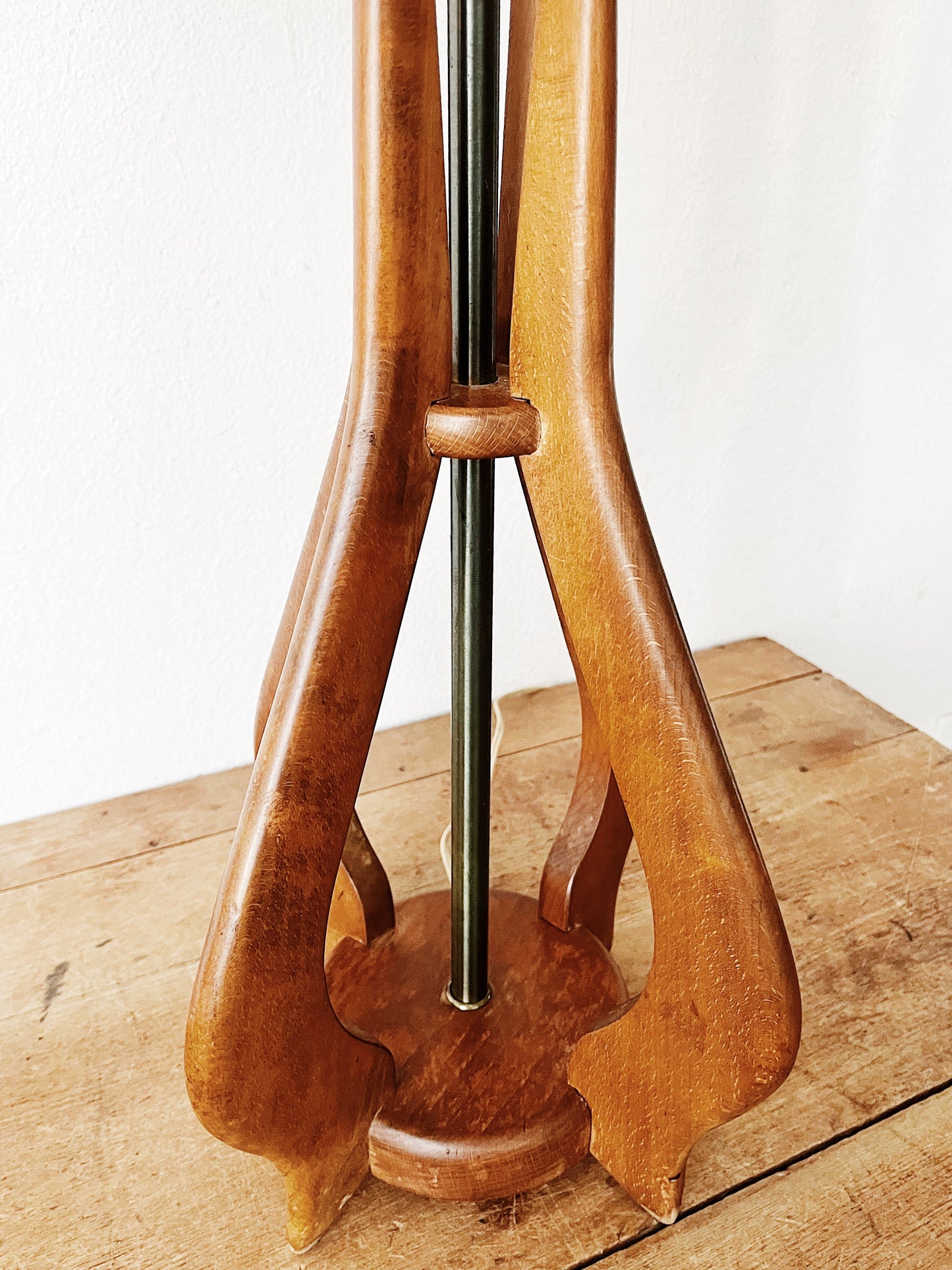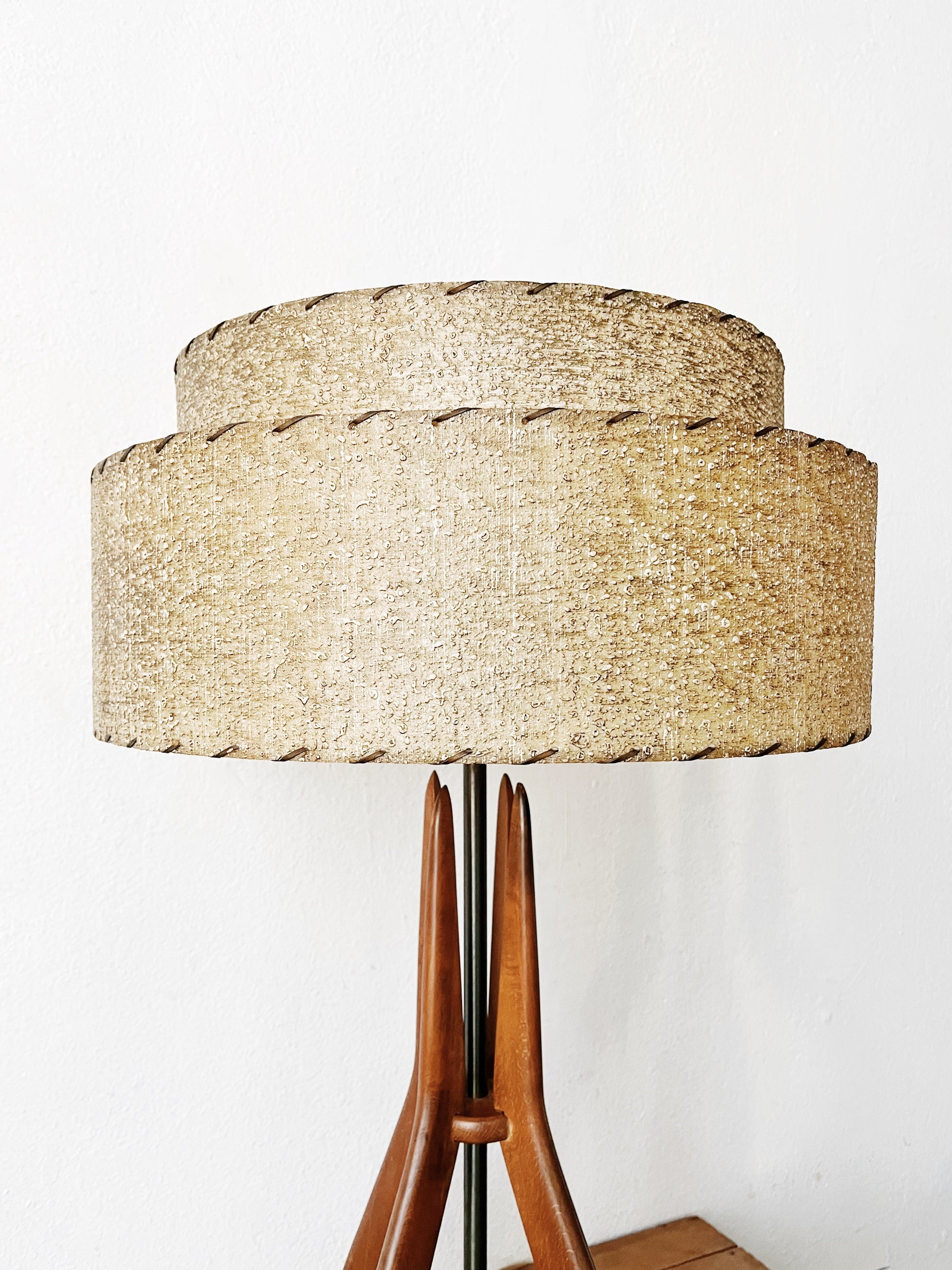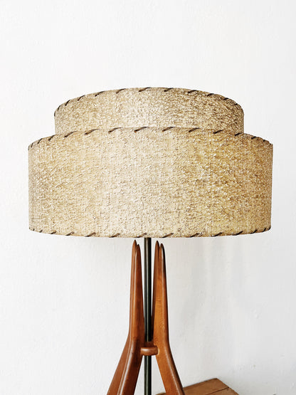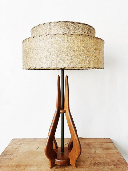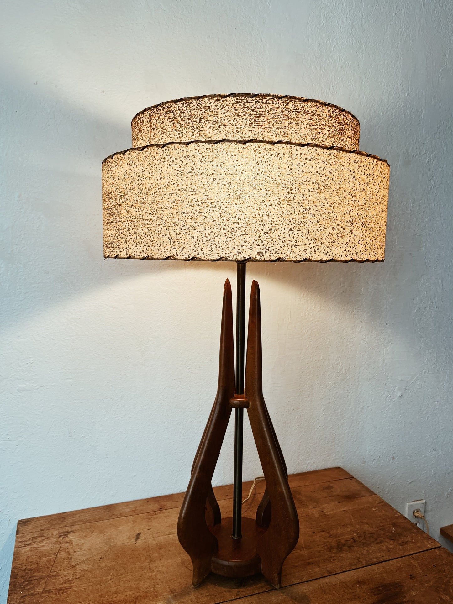 From our personal collection. Mid century modern teak lamp attributed to Adrian Pearsall and Modeline, with original fiberglass double tiered shade. Brass tubing support through the center is a nice detail. This lamp is so gorgeous. It throws a very warm light. Three-way switch and plug end. In lovely condition with just some age wear to the wood and shade but nothing that detracts whatsoever.