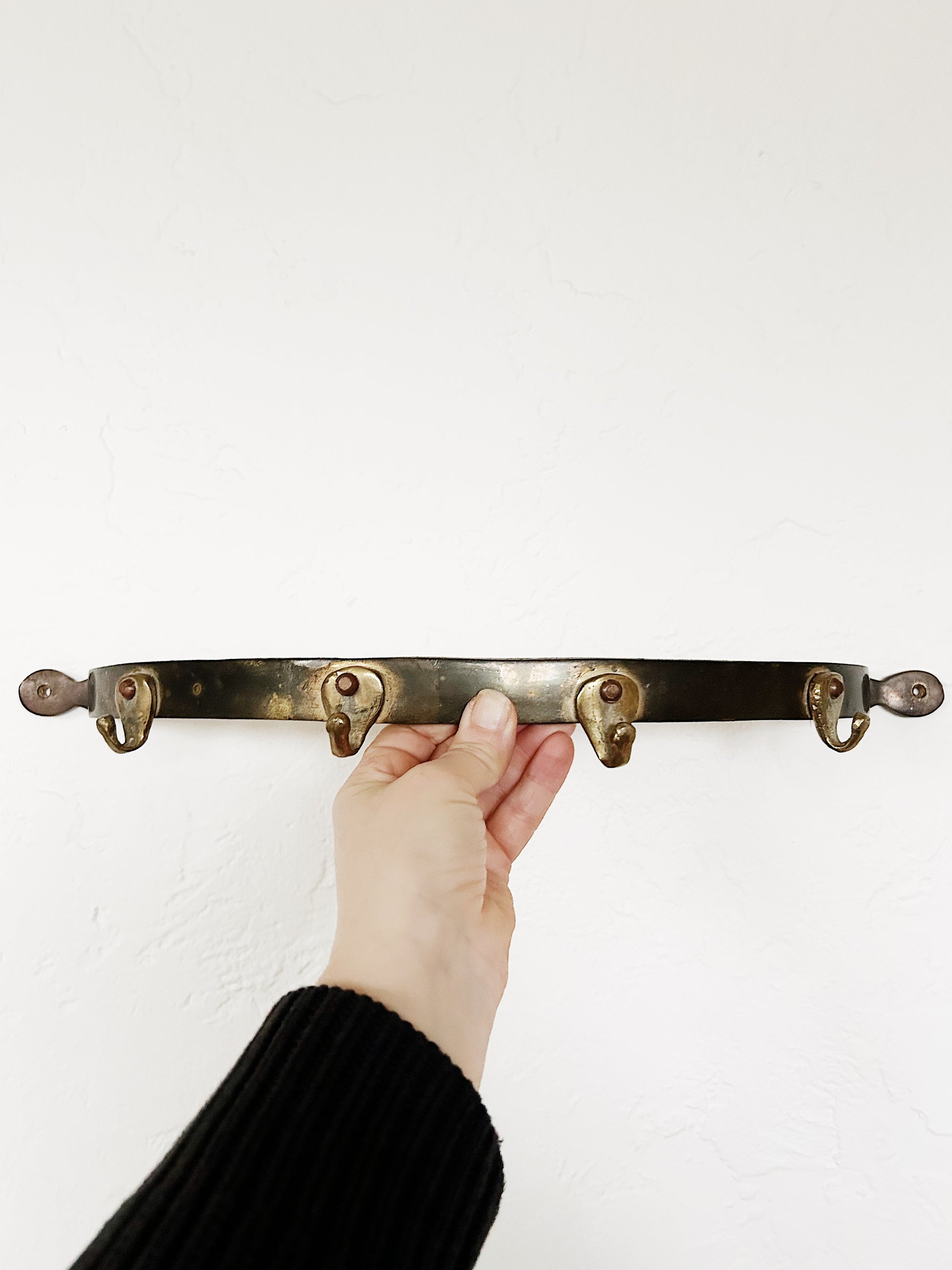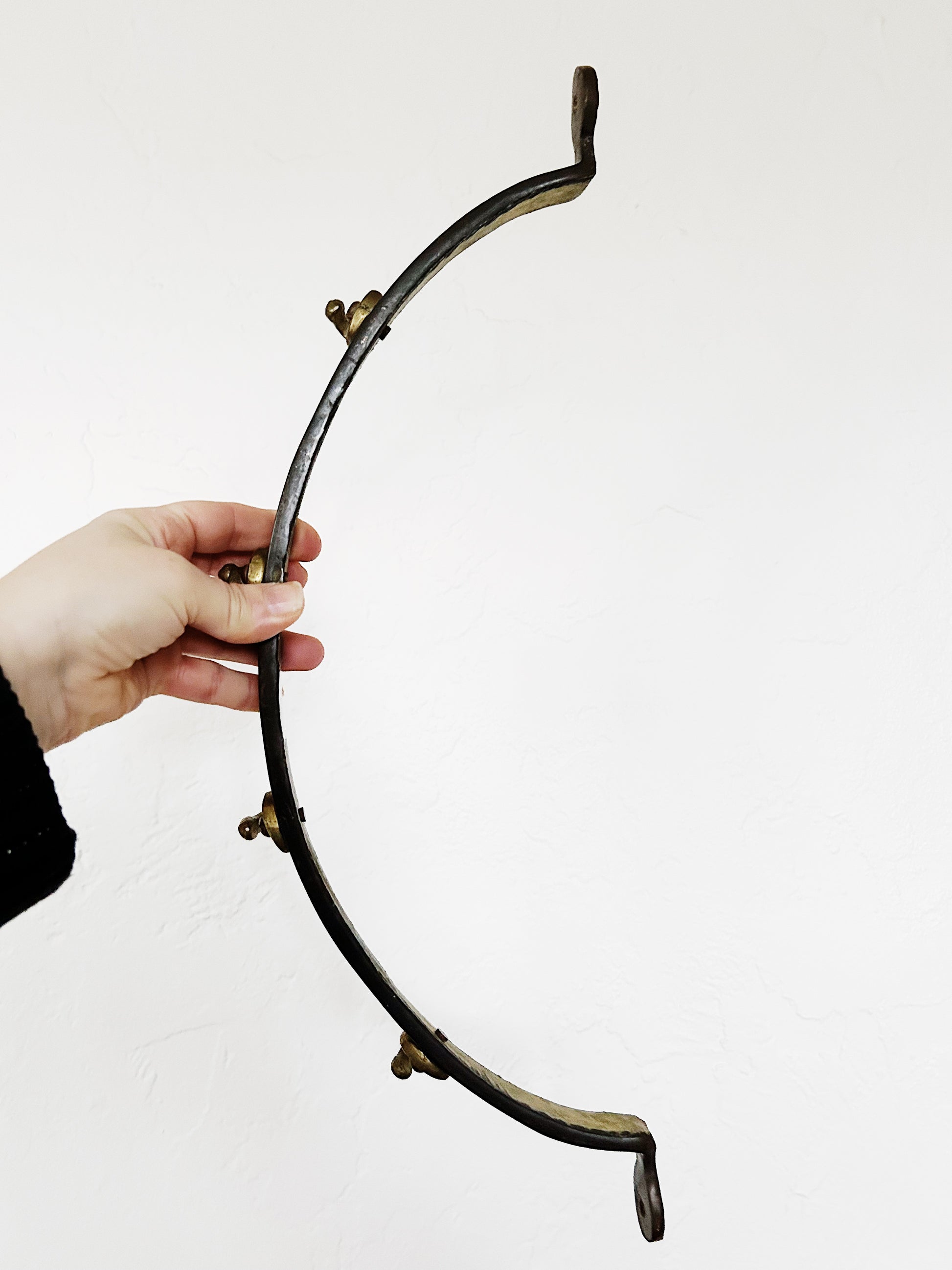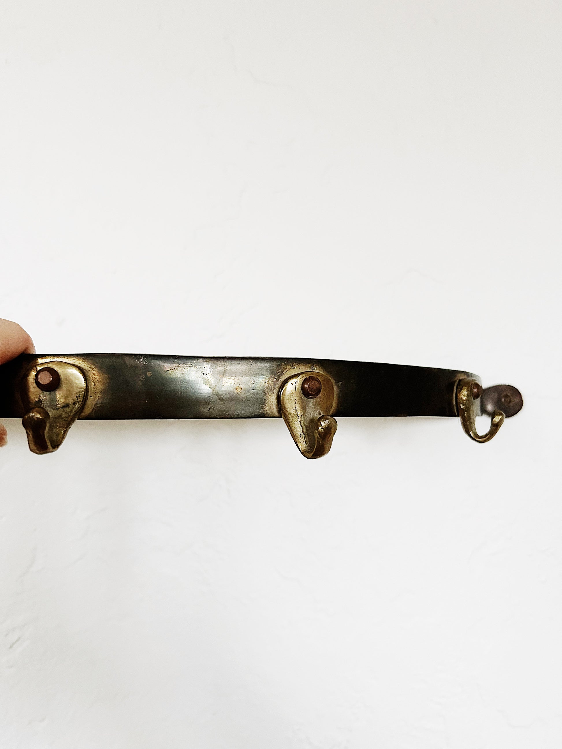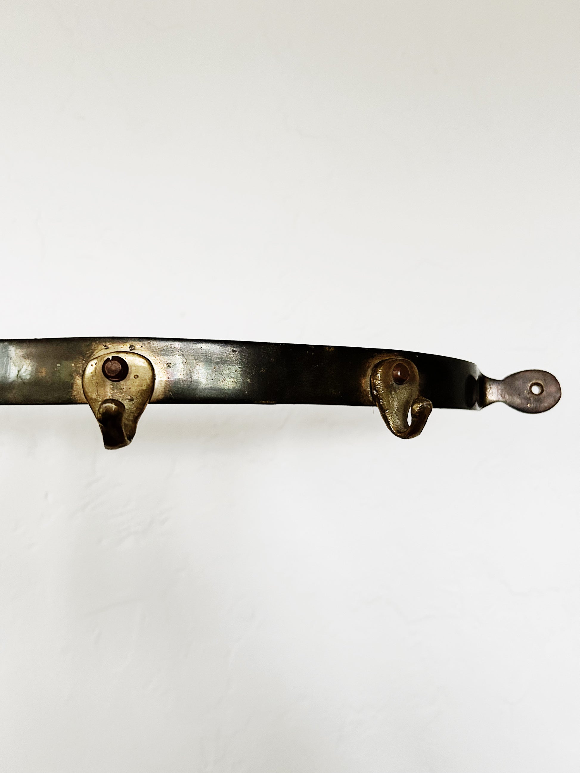 Beautiful old solid brass and bronze pot rack. Half moon shape with nice aged patina. Four heavy duty hooks. Hang pots or dry herbs