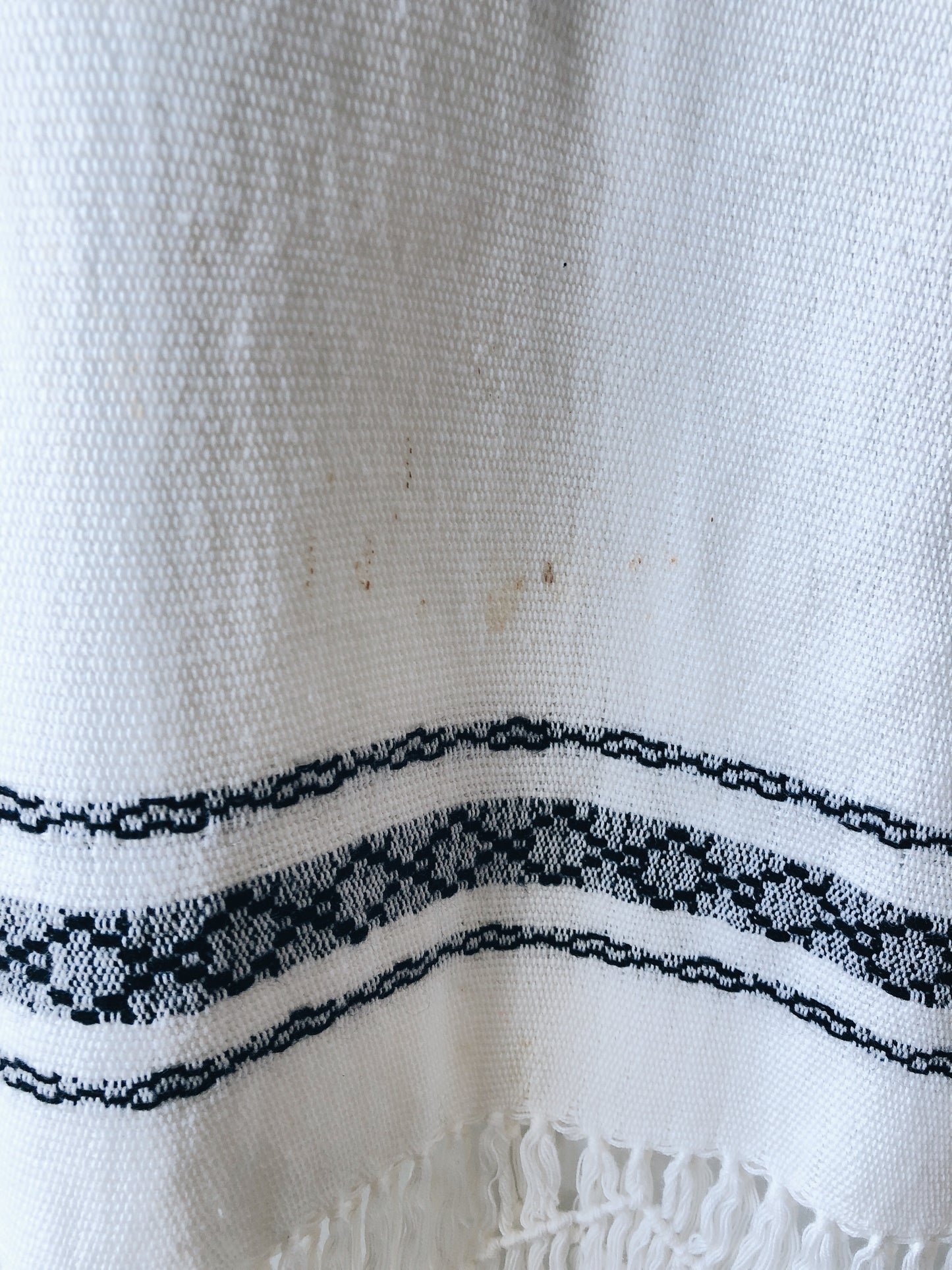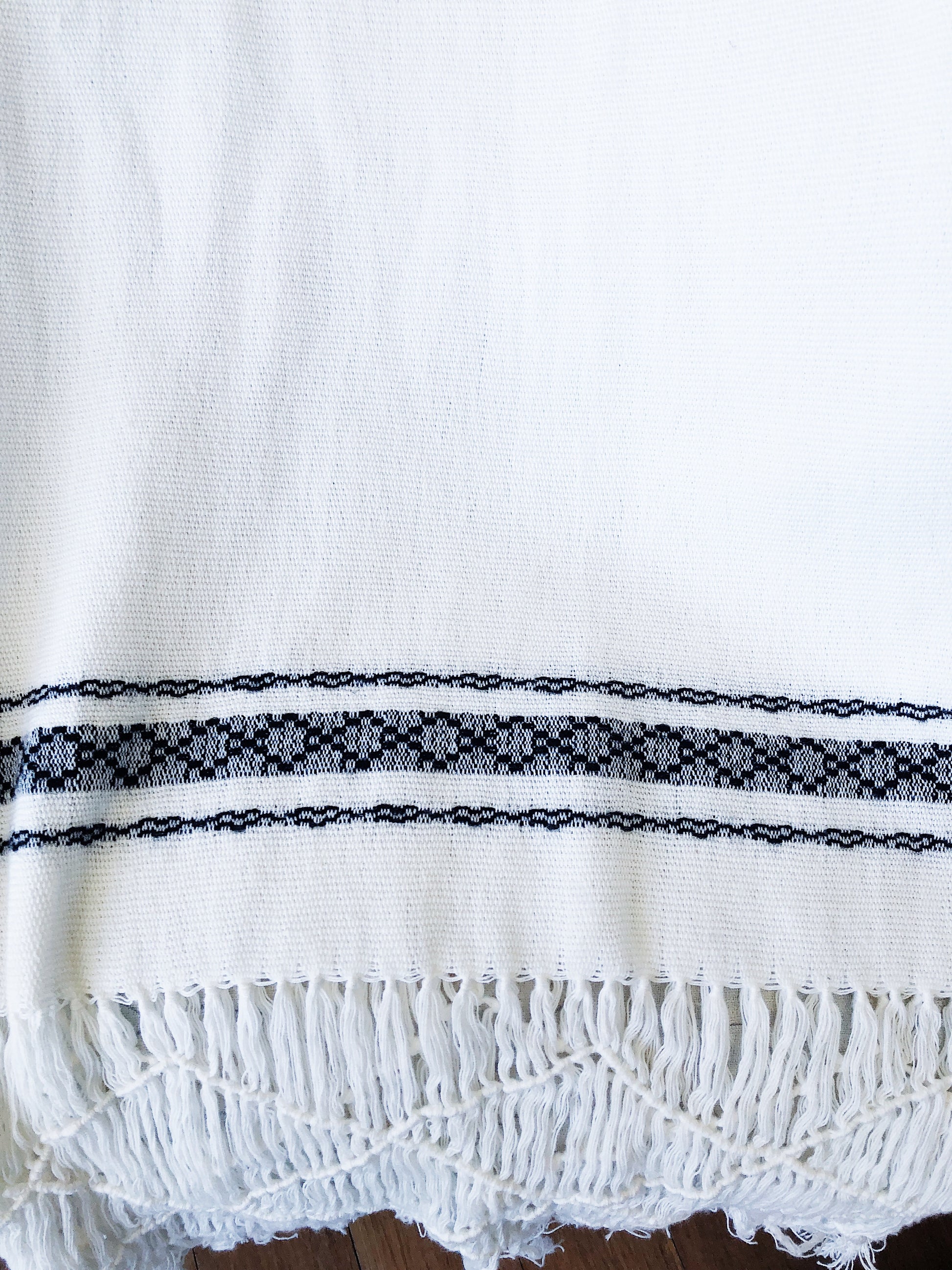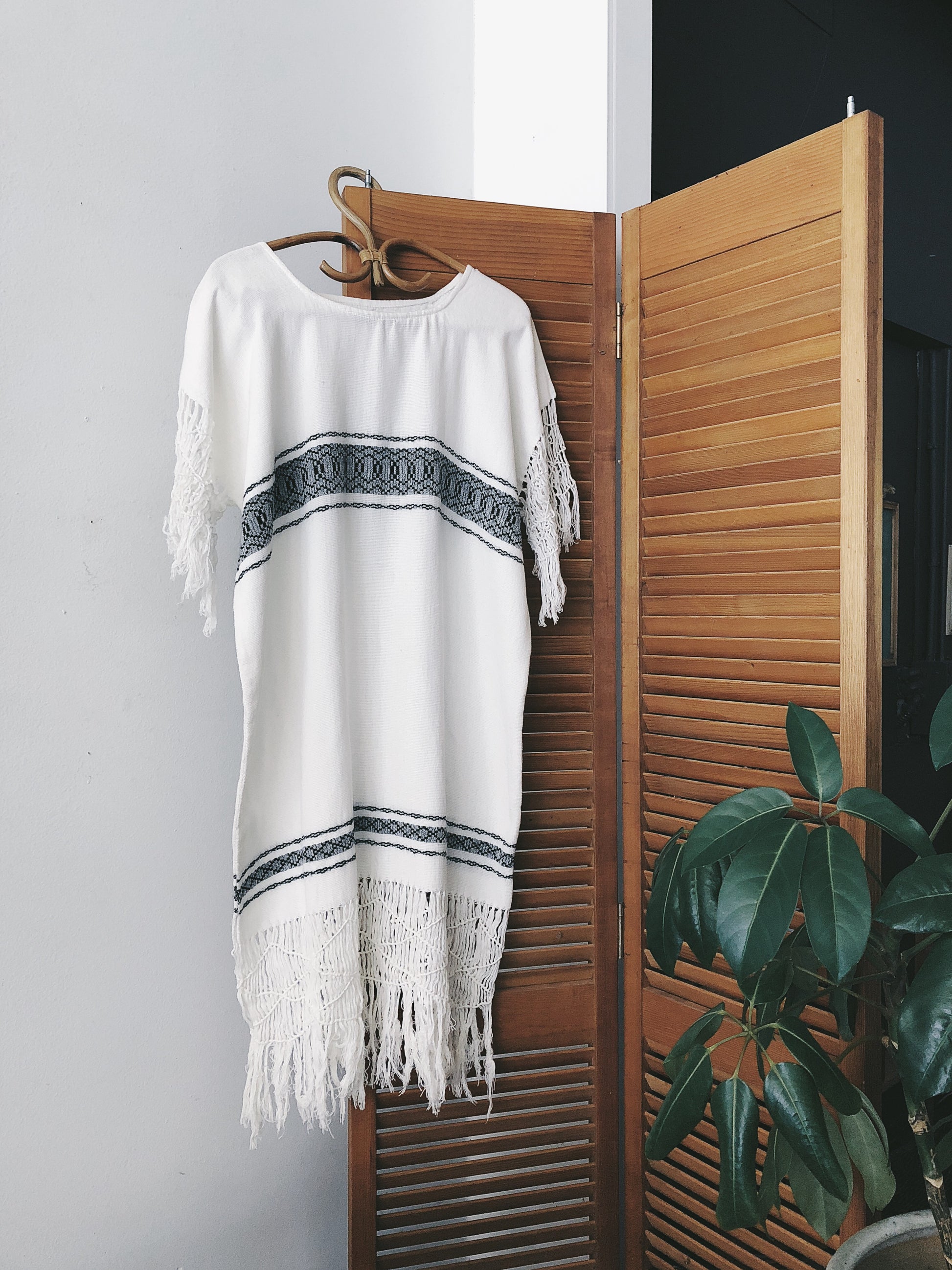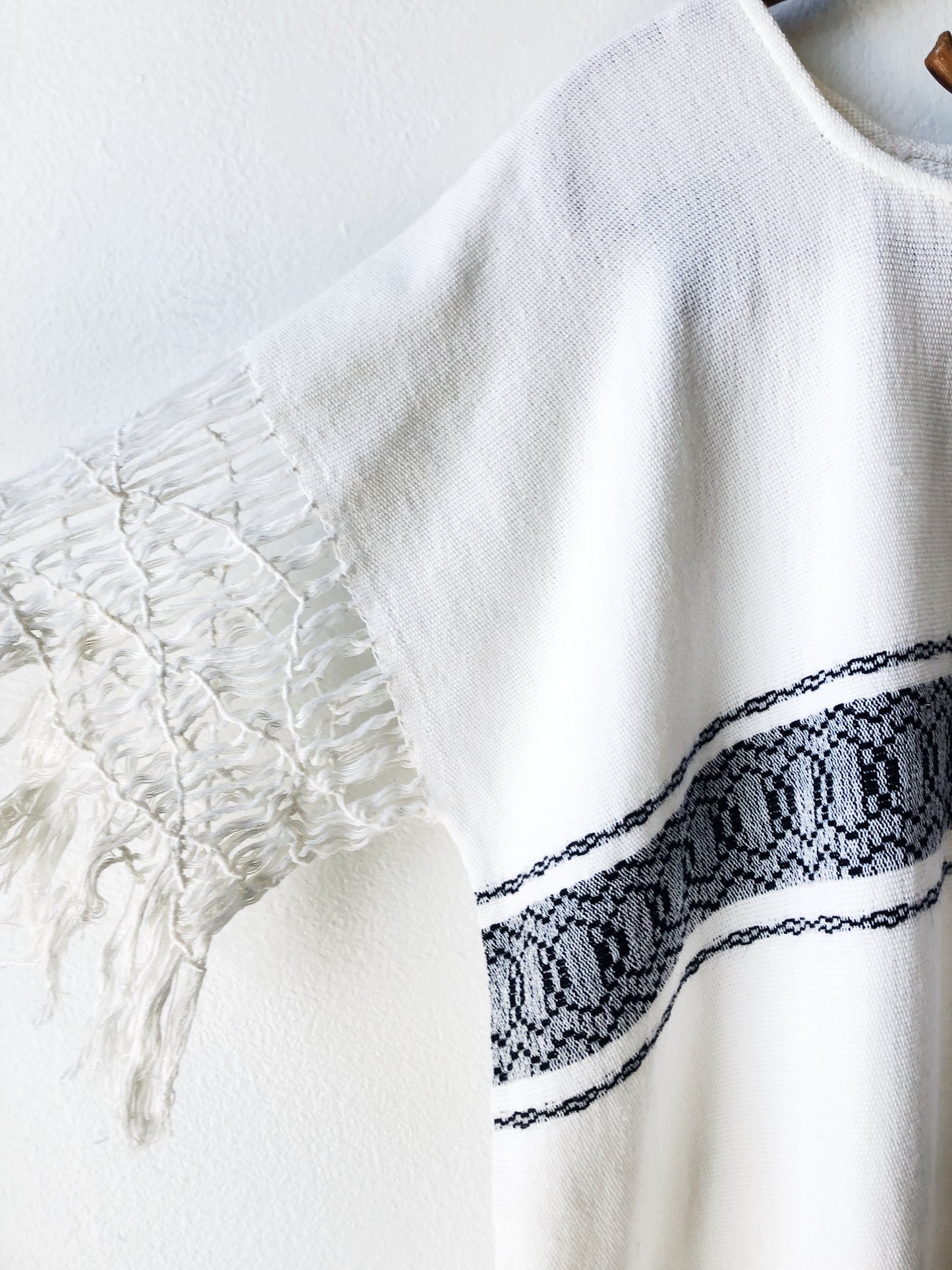 Loose and airy woven cotton poncho dress. Nice black on white design. Beautiful fringe!