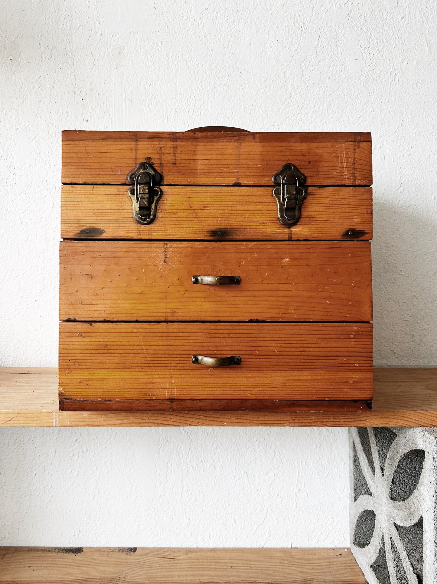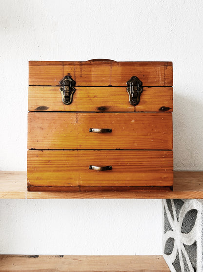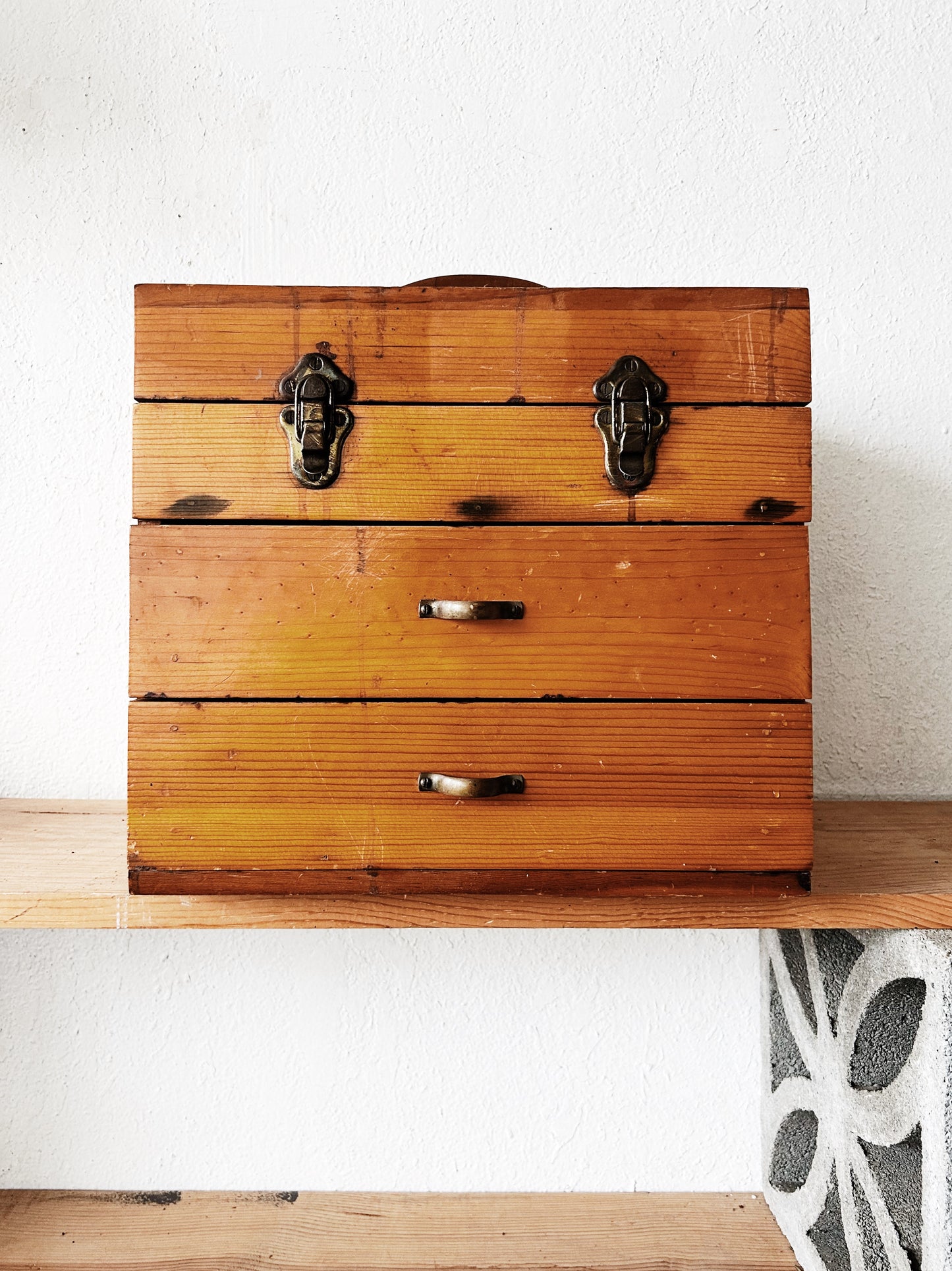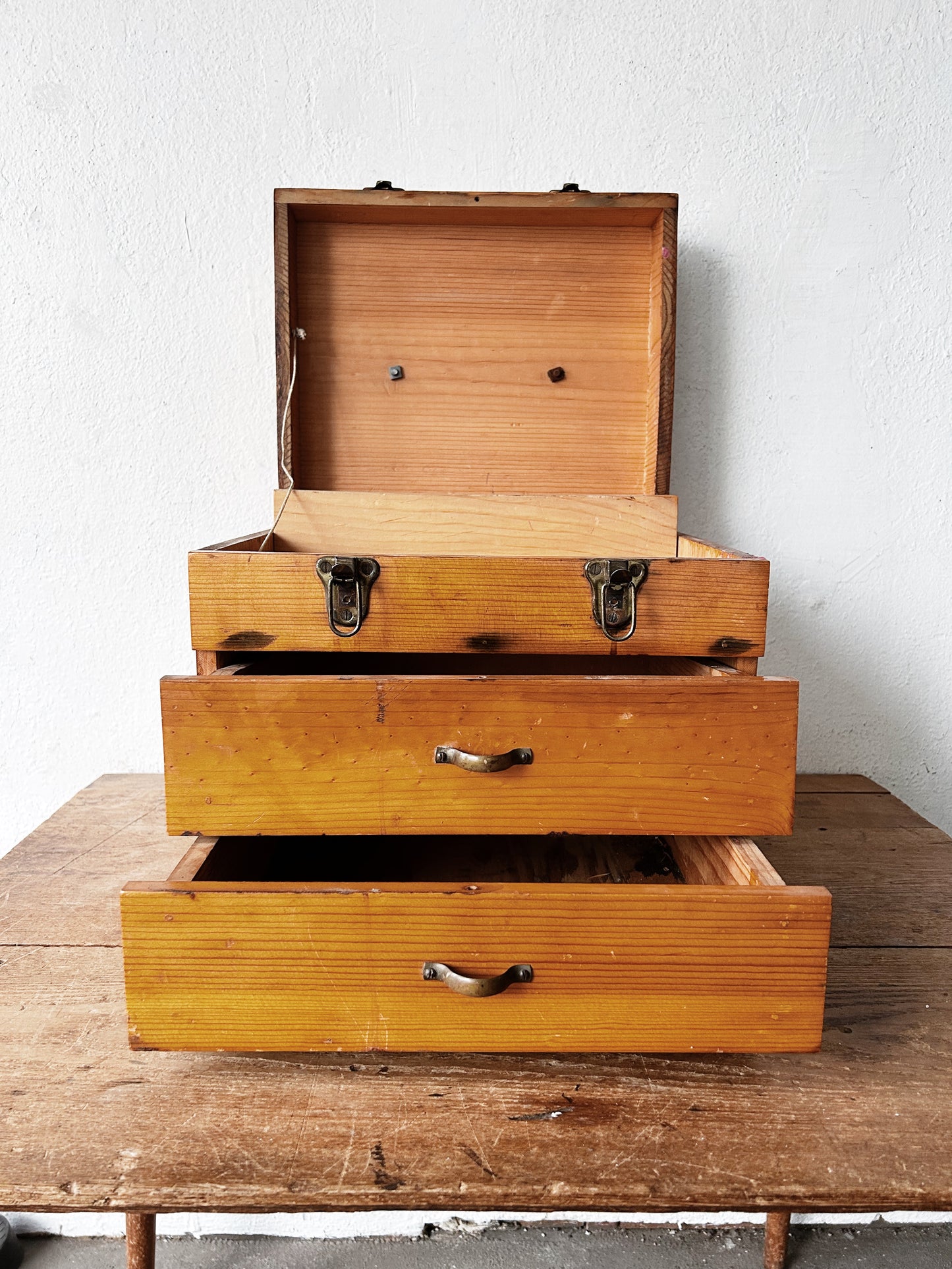 A useful and great looking old wooden chest best suited for a hobbyist. Two drawers and open top for storing smaller hand tools, bits and bobs. Great for holding art supplies too.