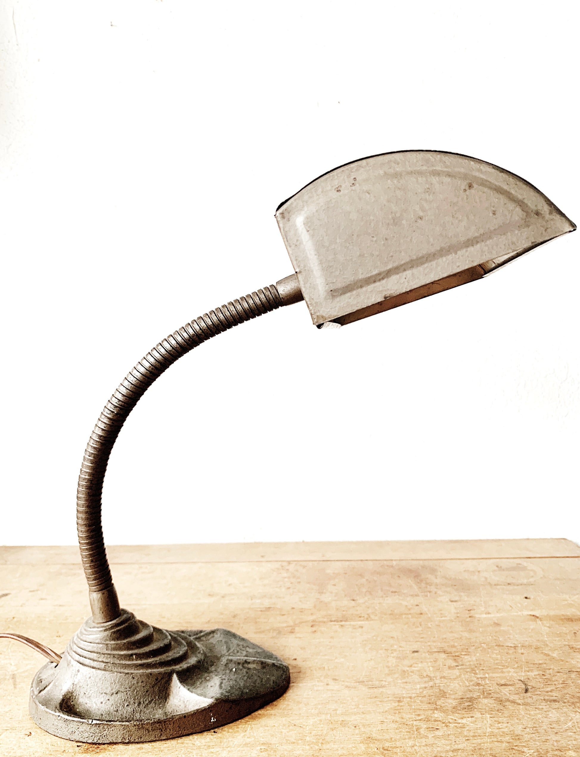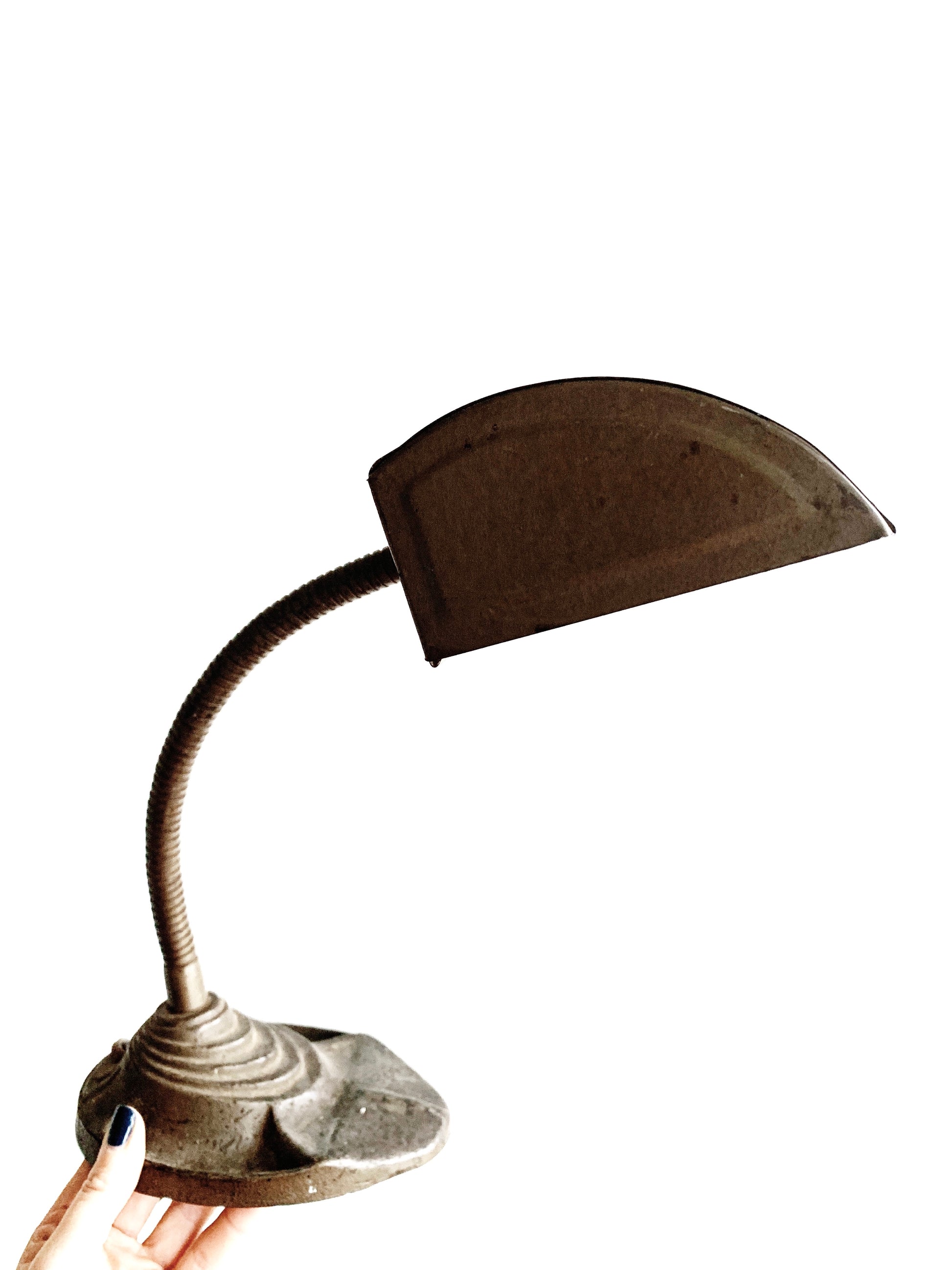 Weighty base metal antique desk lamp with movable new k. Rustic patina, on/off witch on shade.
