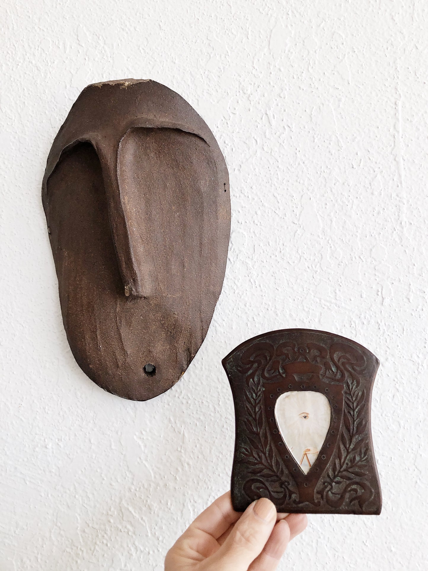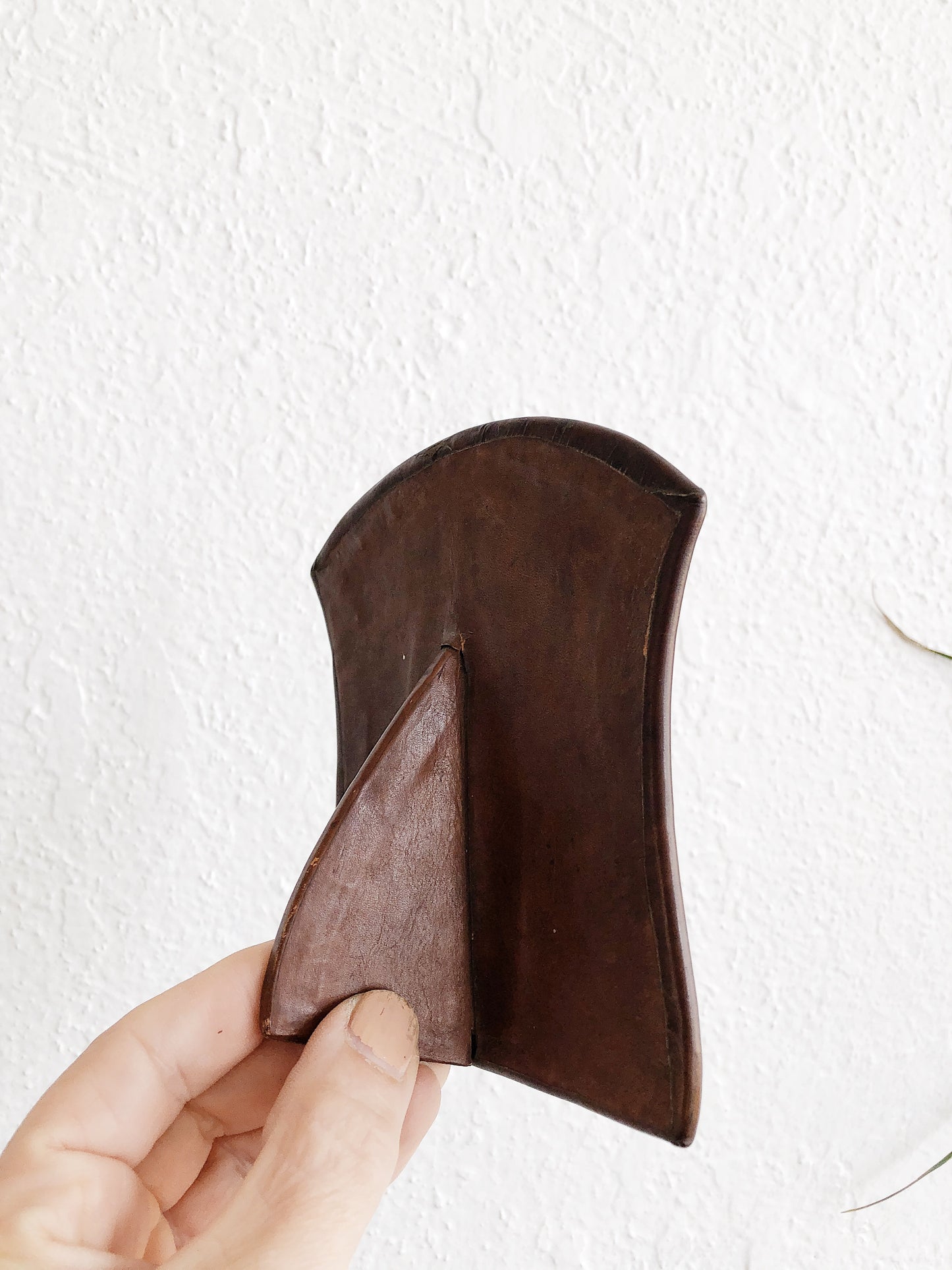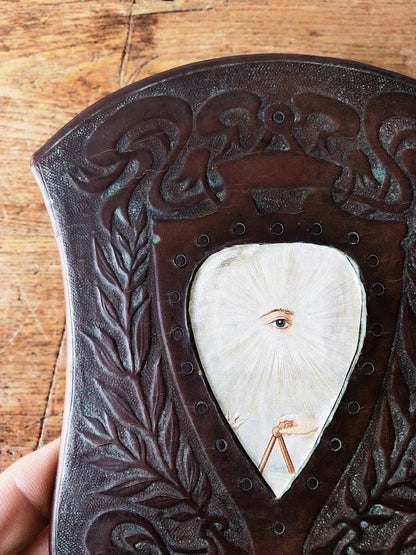 Antique all seeing eye painting on embossed leather. The painting has a built in stand. A very special piece.