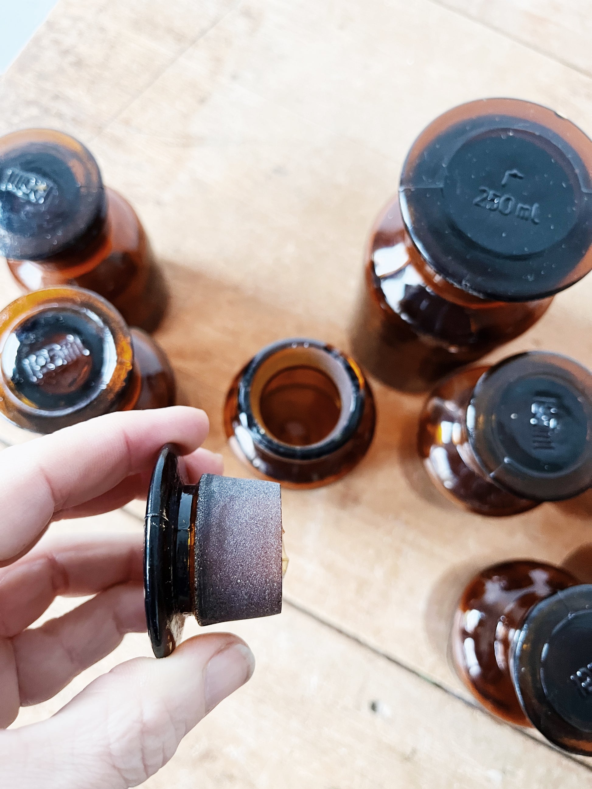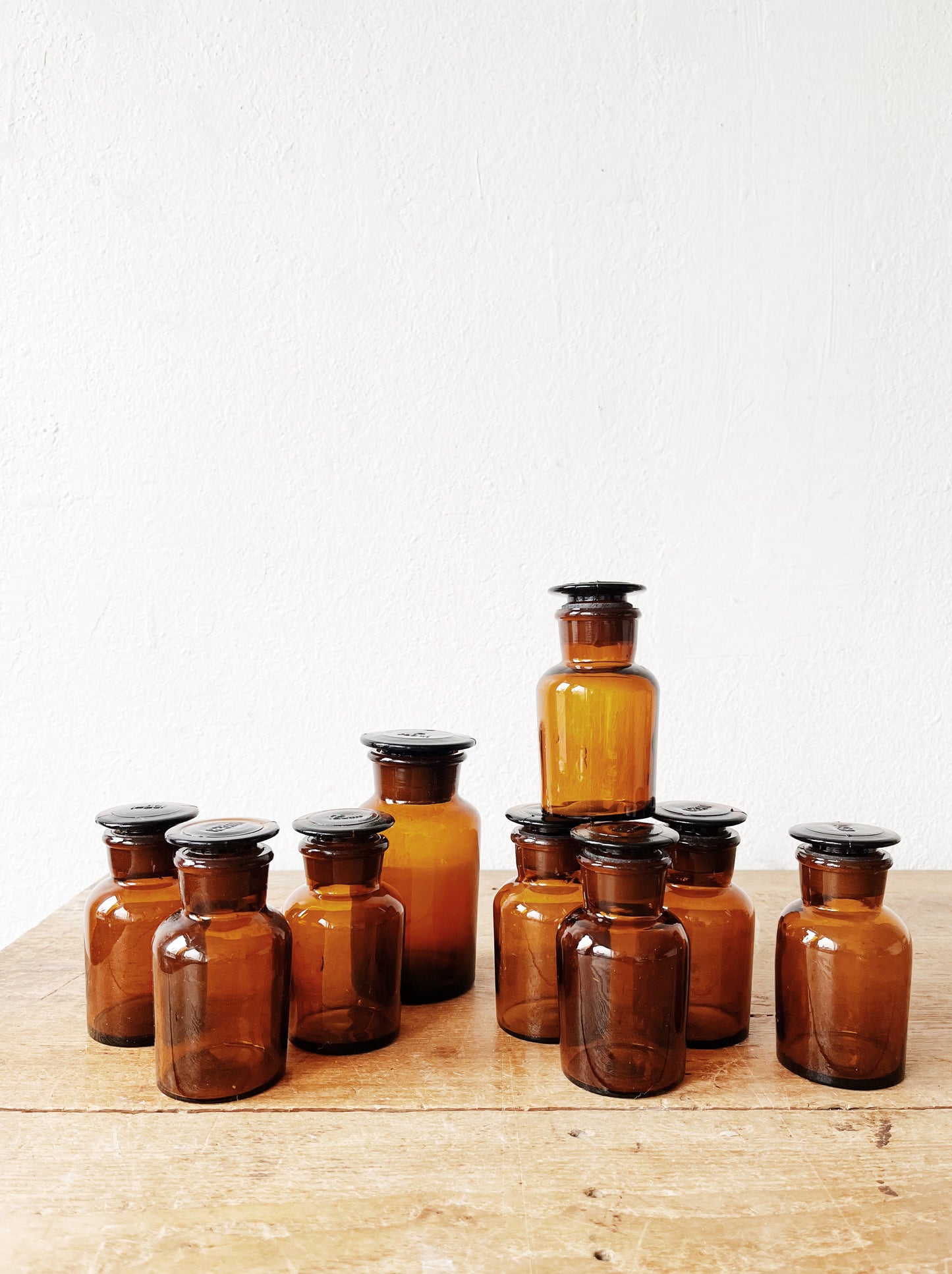 Beautiful set of nine apothecary jars. Ground stoppers are labeled with measures. Eight 125ml and one larger 250ml bottle included. Medicinal herbs, tinctures and kitchen spices will be very at home here.