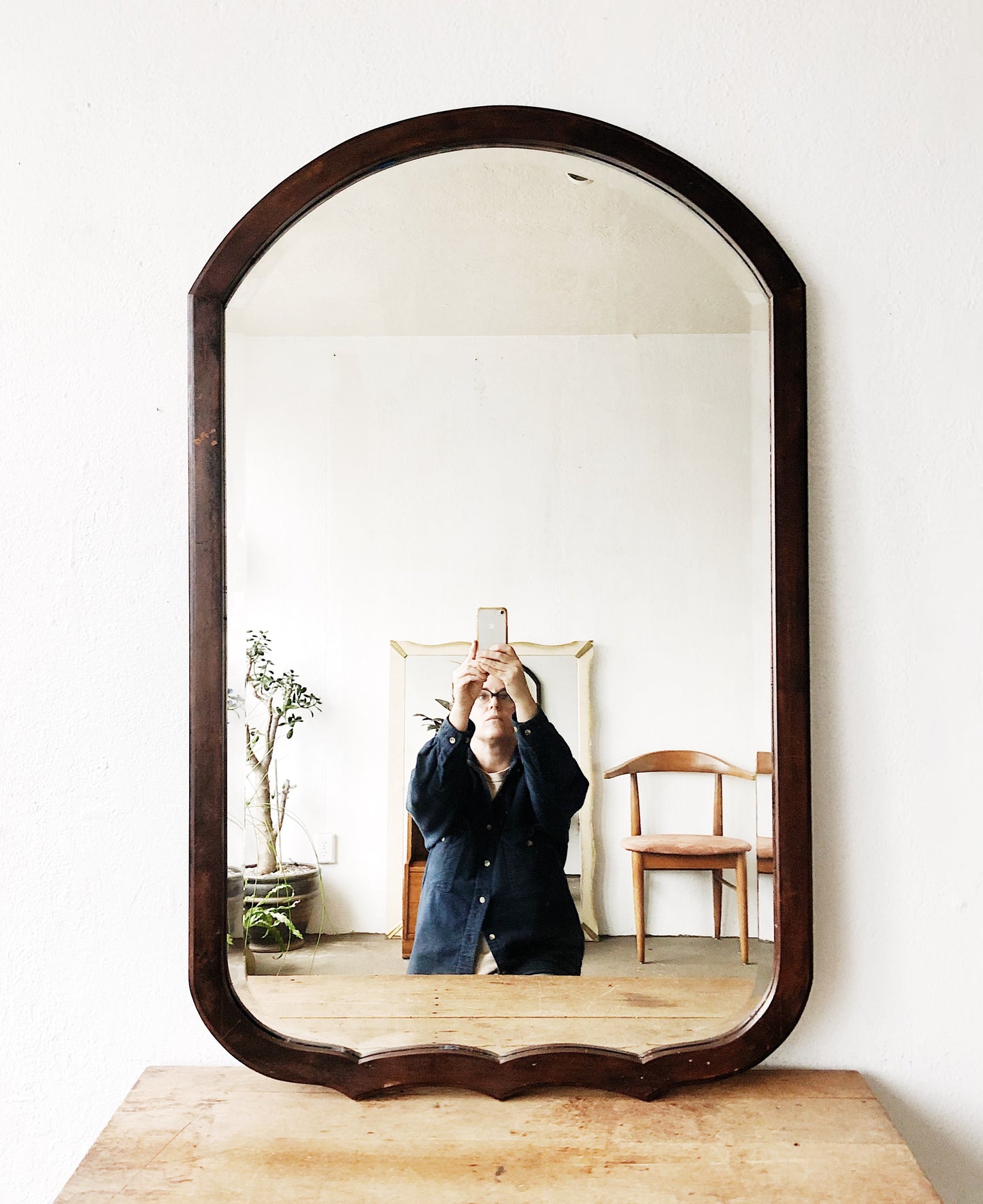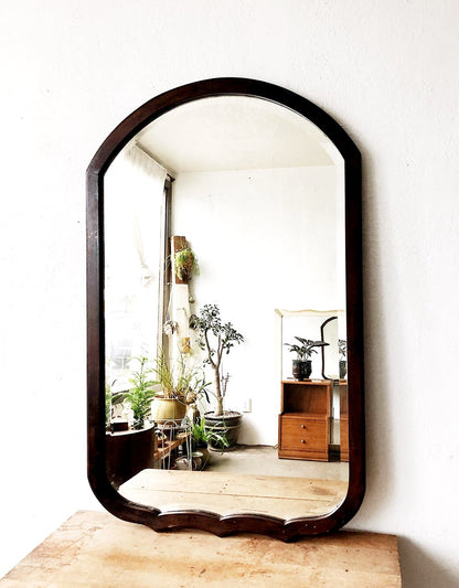 Gorgeous arched mahogany wood mirror. Glass is only slightly clouded with age but still easily clear enough to see your reflection. Nice deep bevel. Hanger on reverse