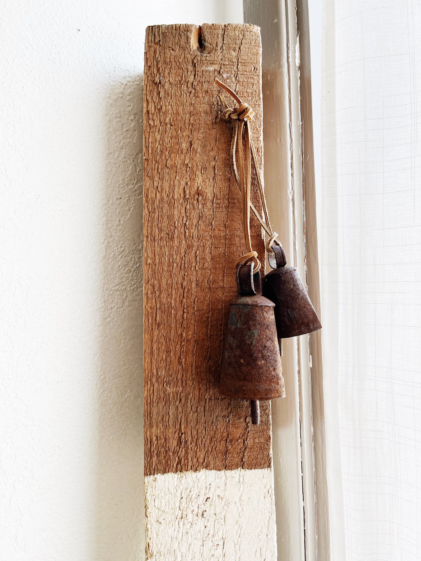 Two old metal bells with metal clappers. Bronzed and rusted with age, but in a good way. Hang from leather strapping.