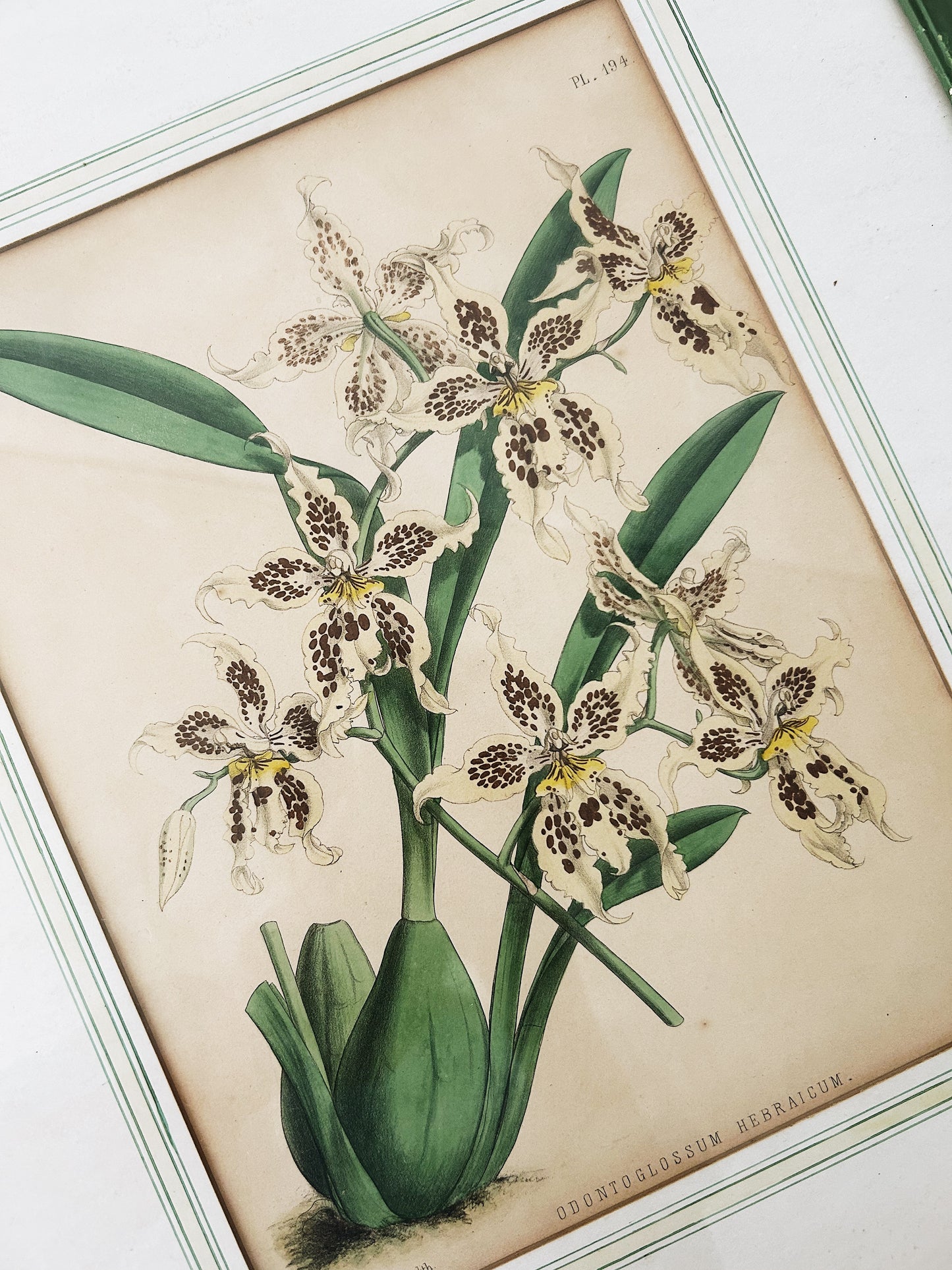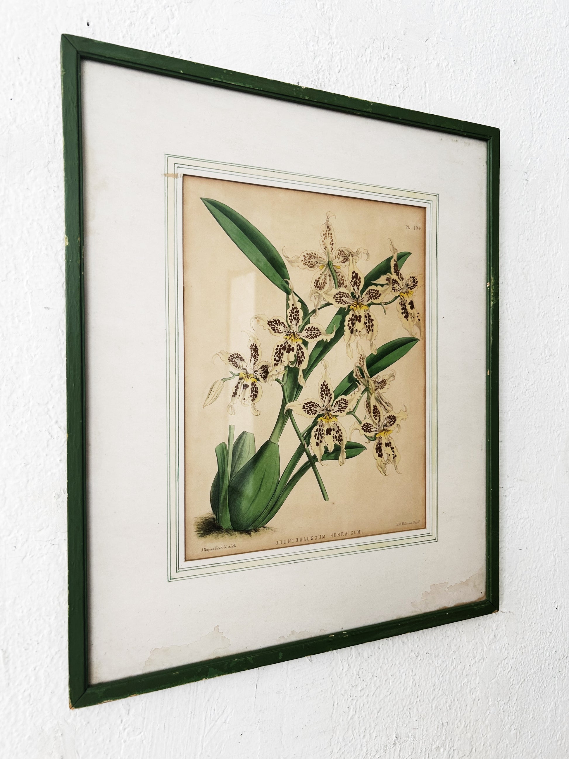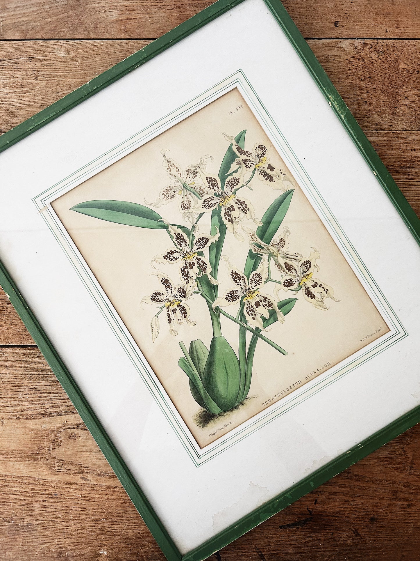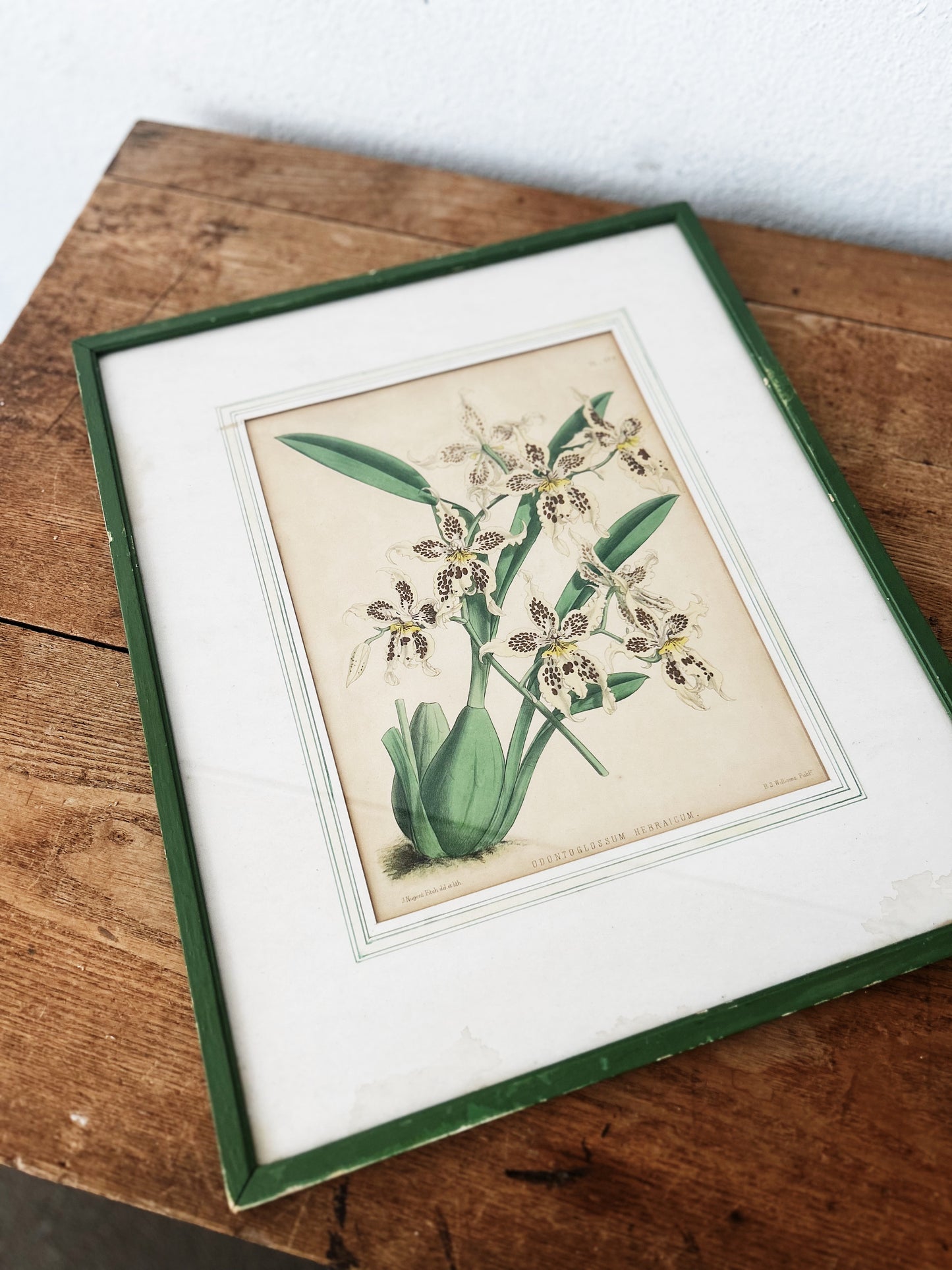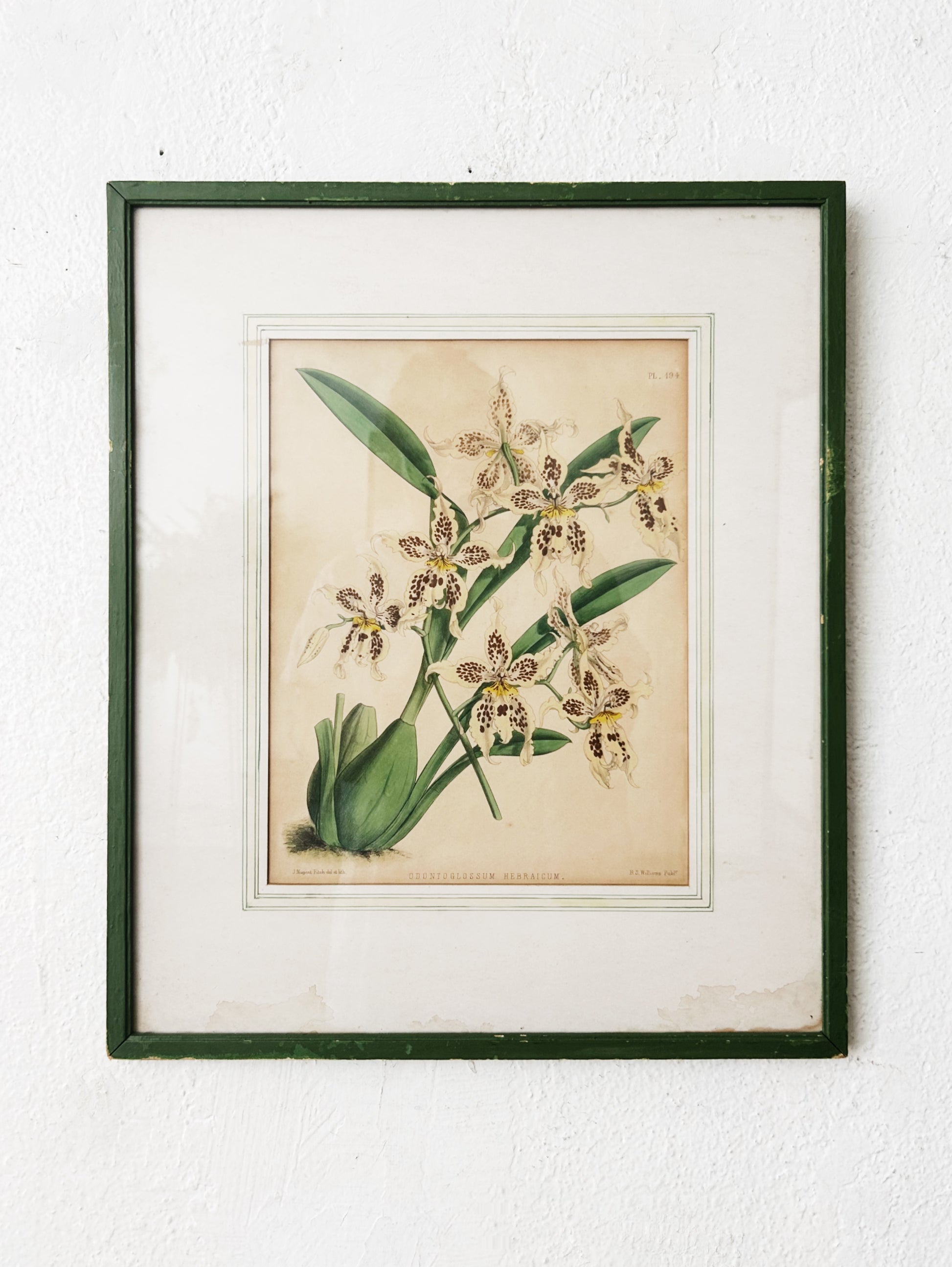 Antique plate of an epiphytic orchid, Ondontoglossum Hebraicum. Framed under glass in a pretty painted green frame and lovely mat. Plate is in great condition for its age, matting has some wear as shown.