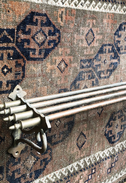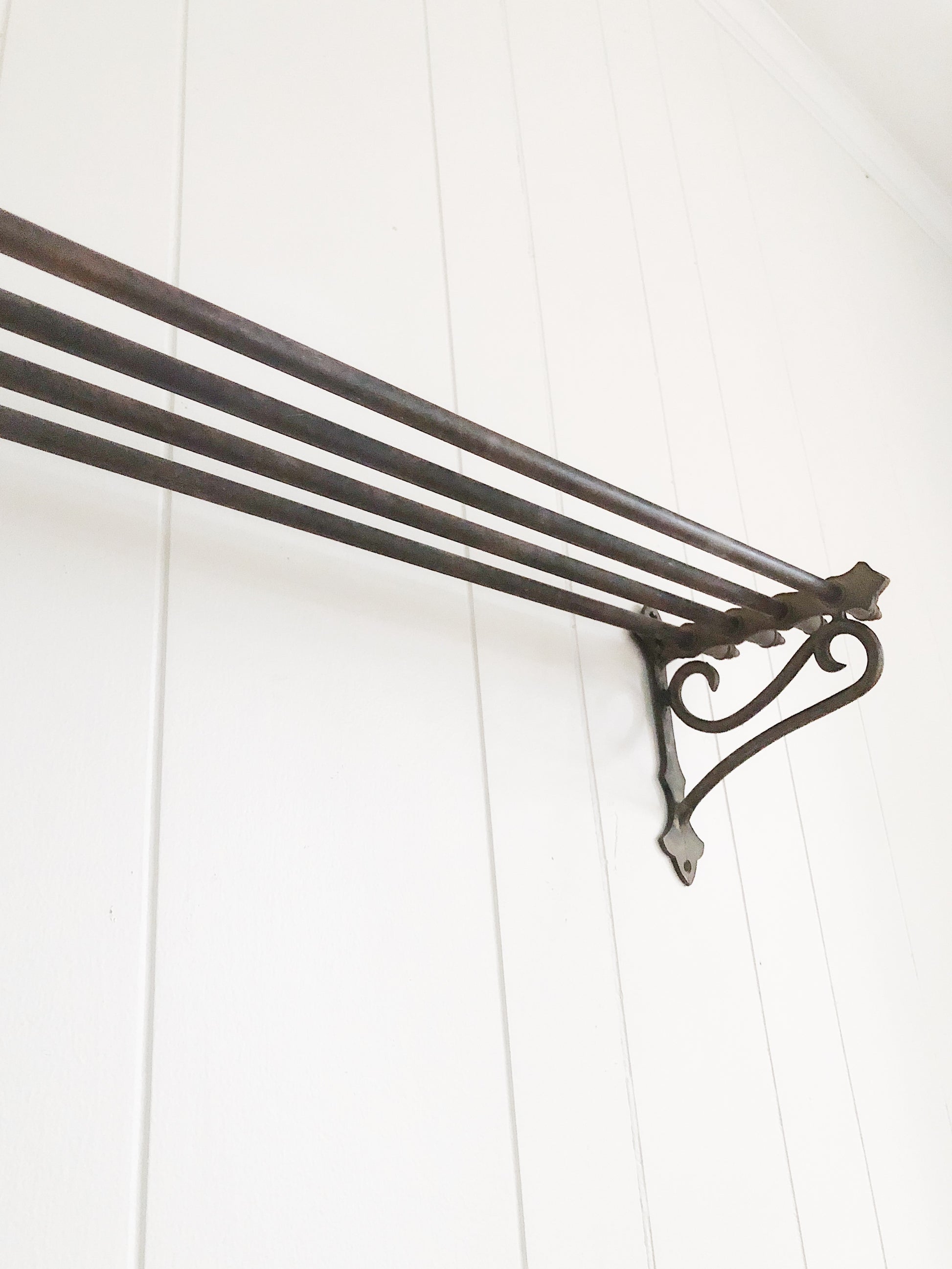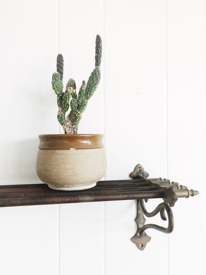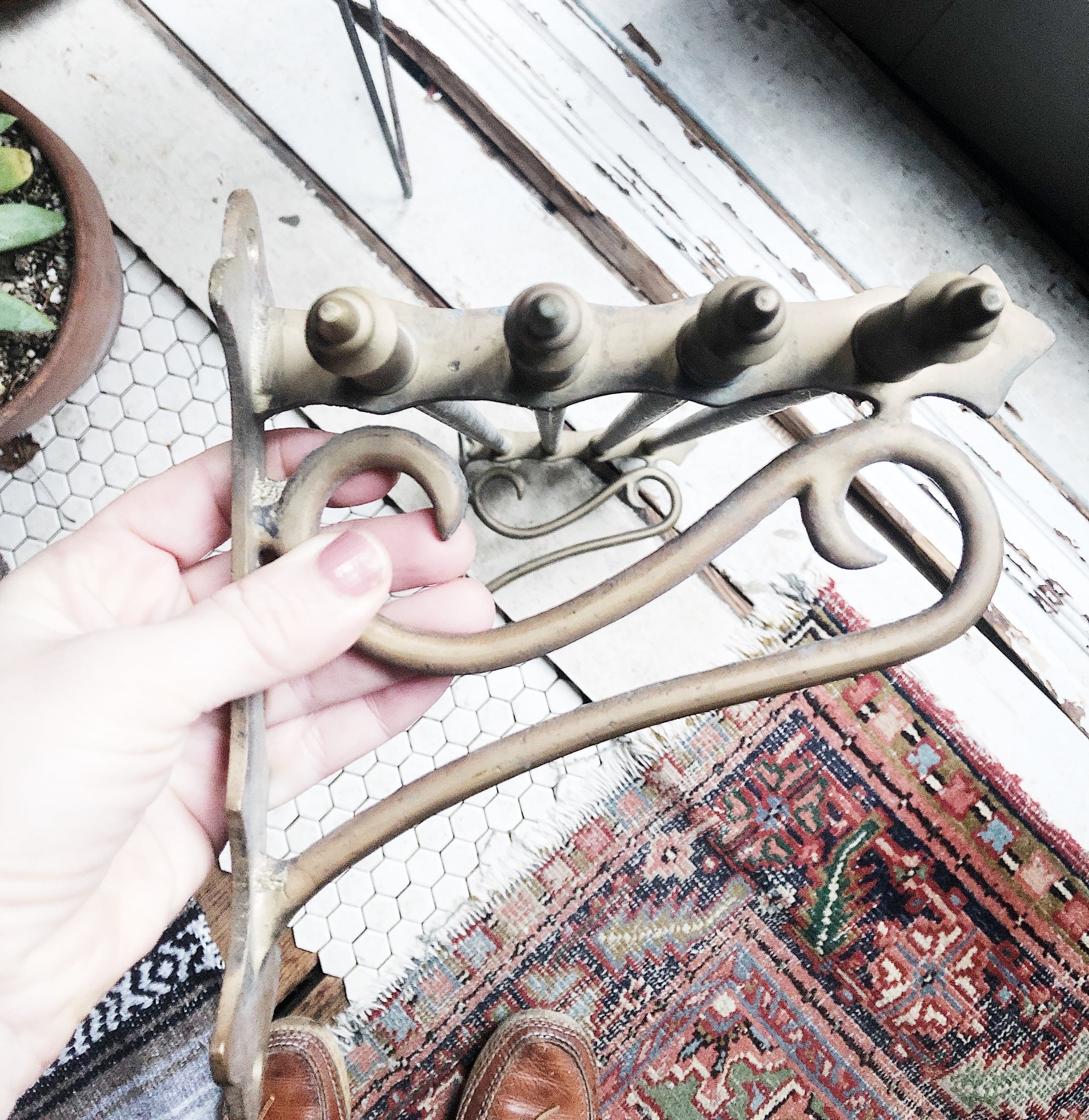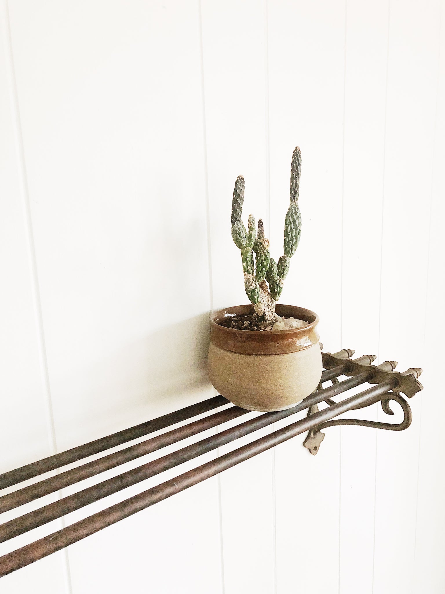 Antique brass shelf from an old passenger train car. The patina is out of this world. Weighty and solid. We see this up high...filled with trailing plants. Looks great from below too!