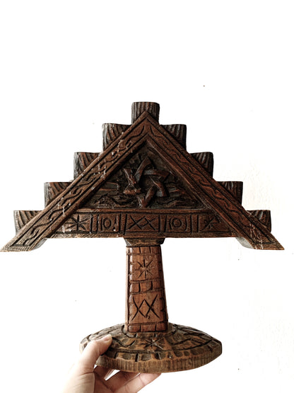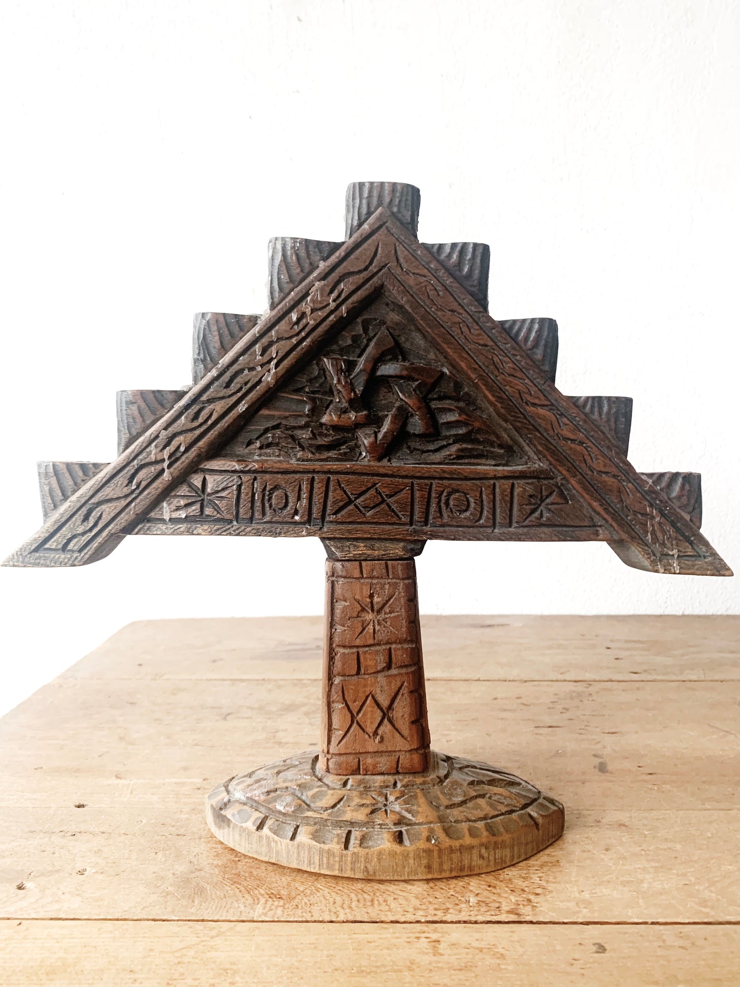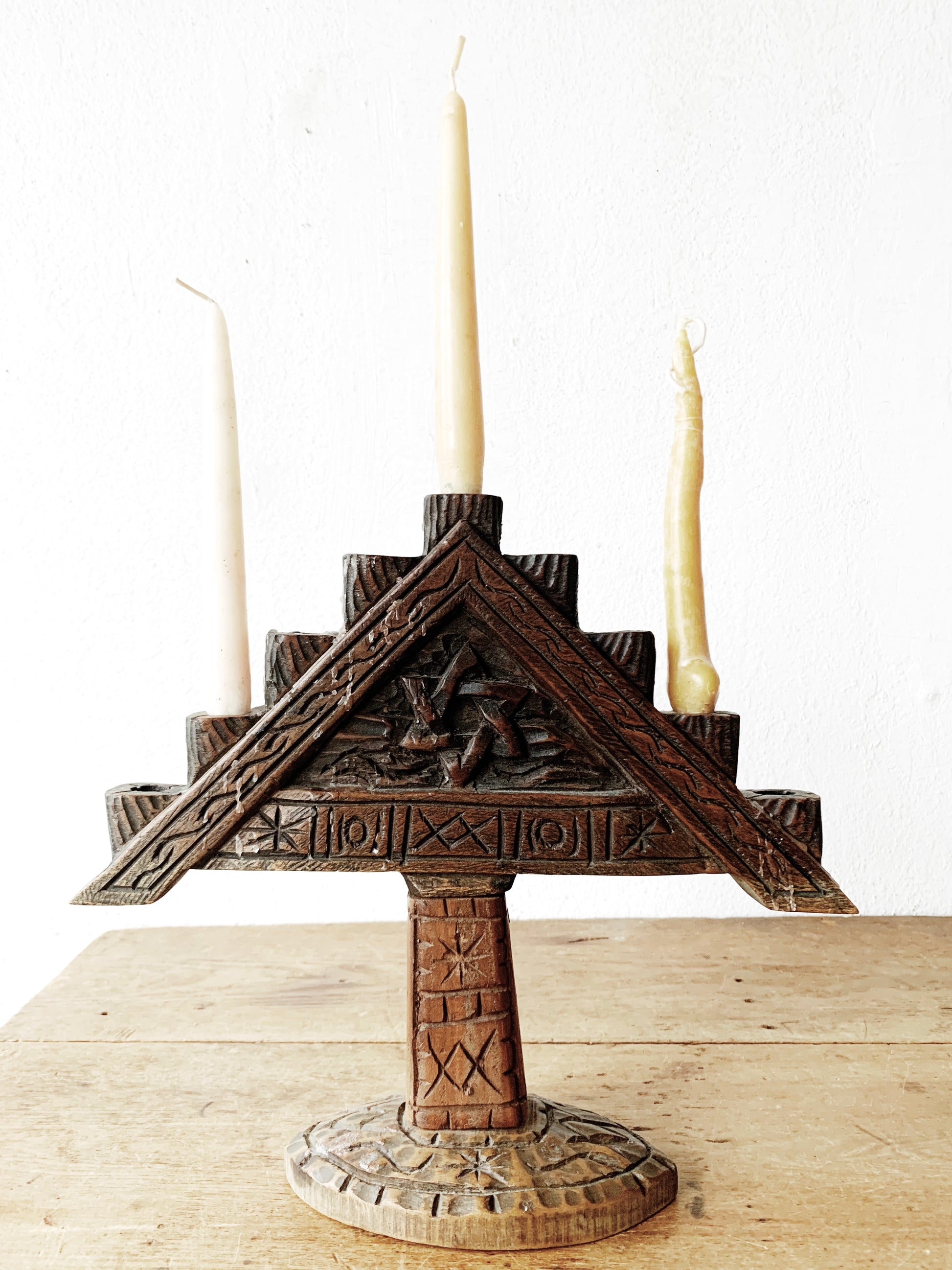 Really beautiful antique solid wood hand carved menorah. Marked RJ on the bottom.