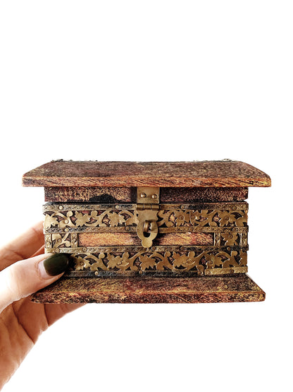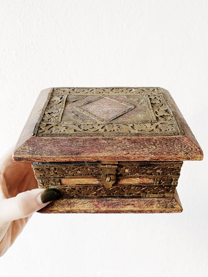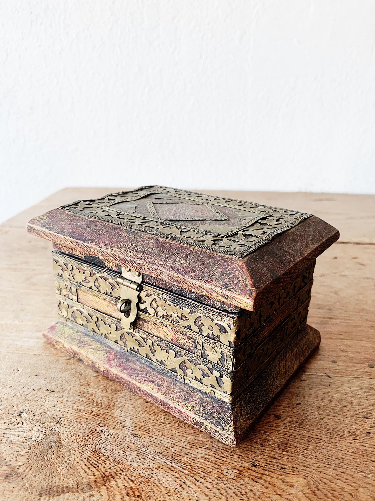 Wonderful antique wood box with decorative intricate brass detailing. The quintessential treasure box. Made in India