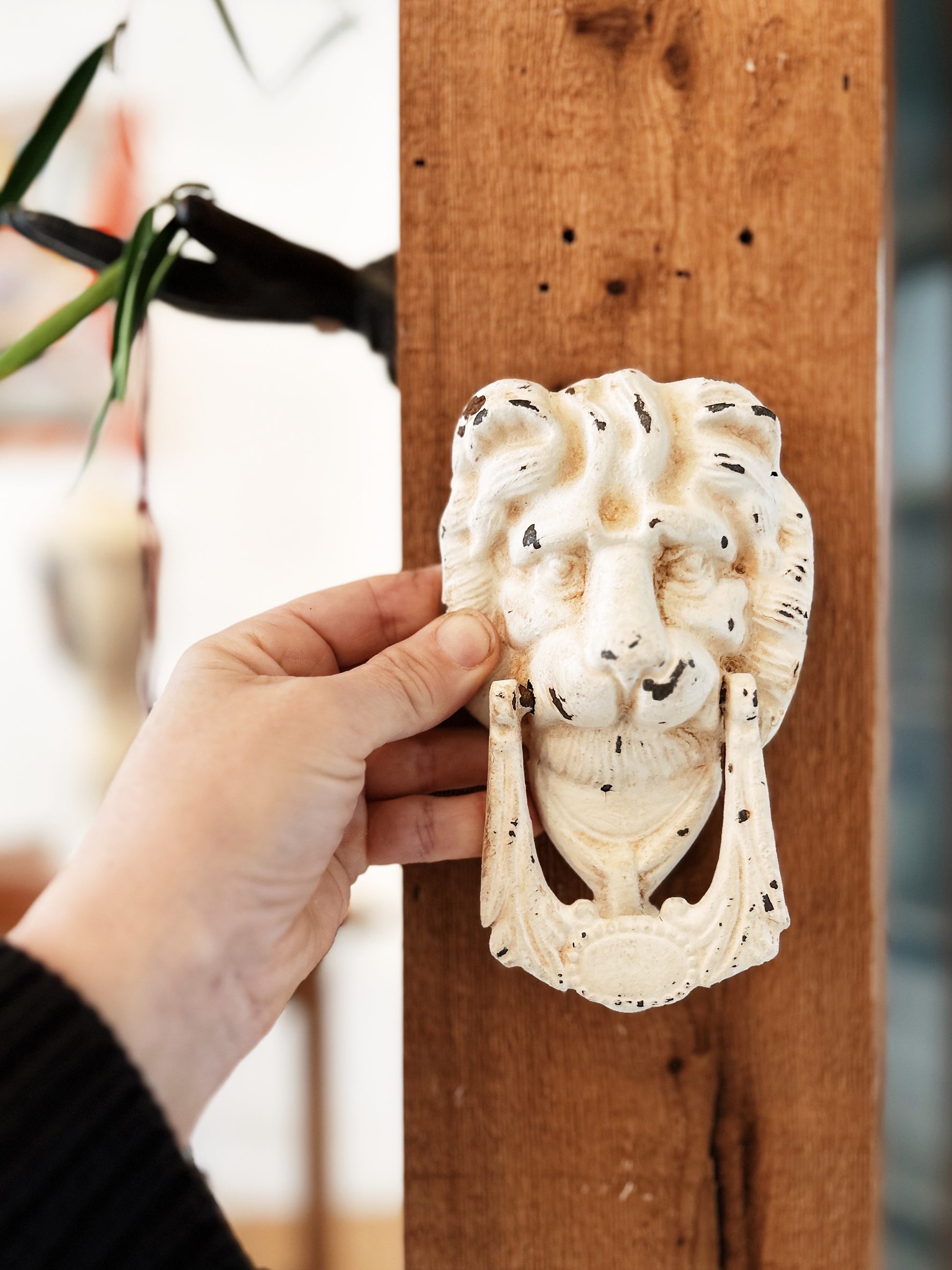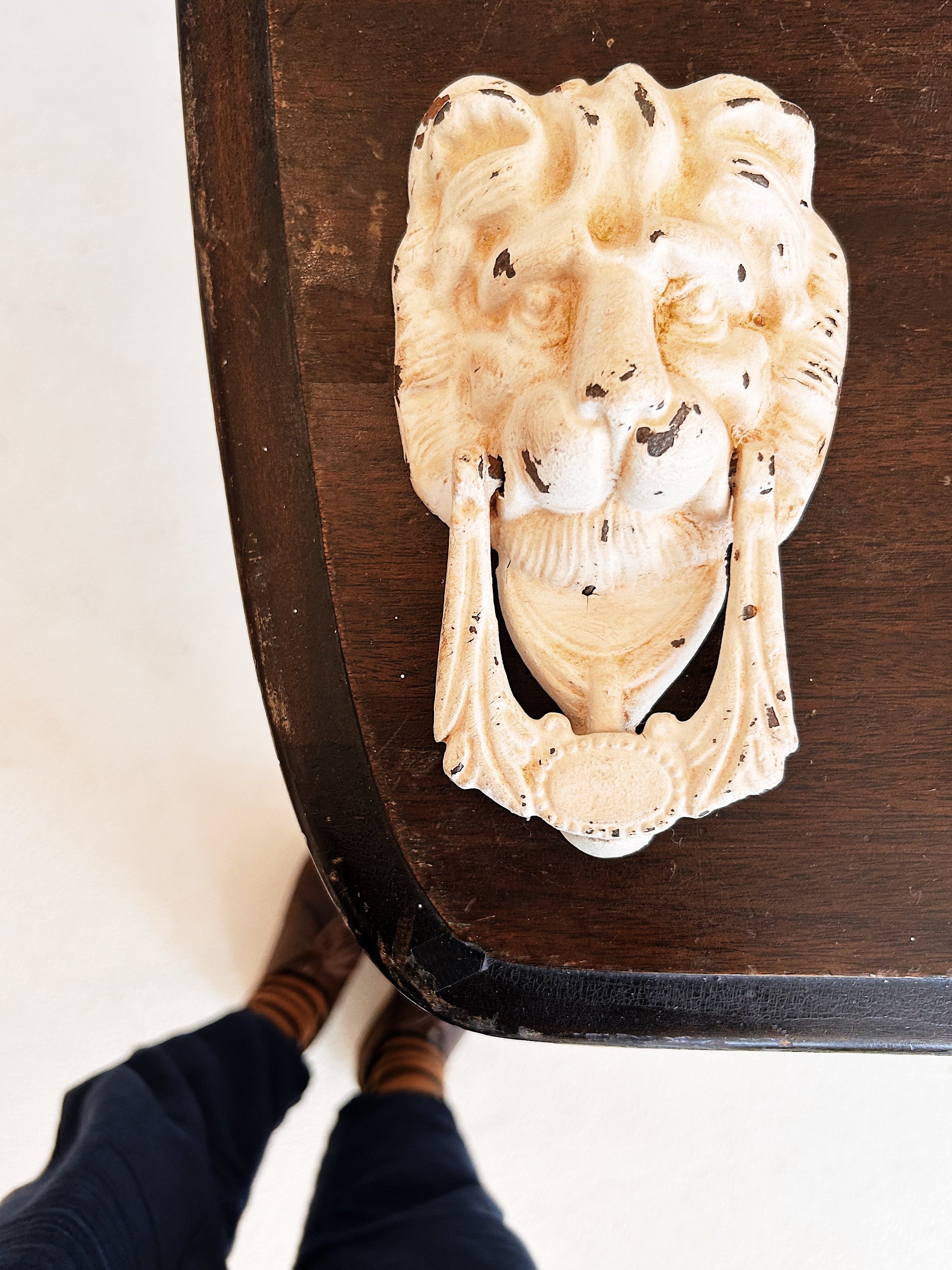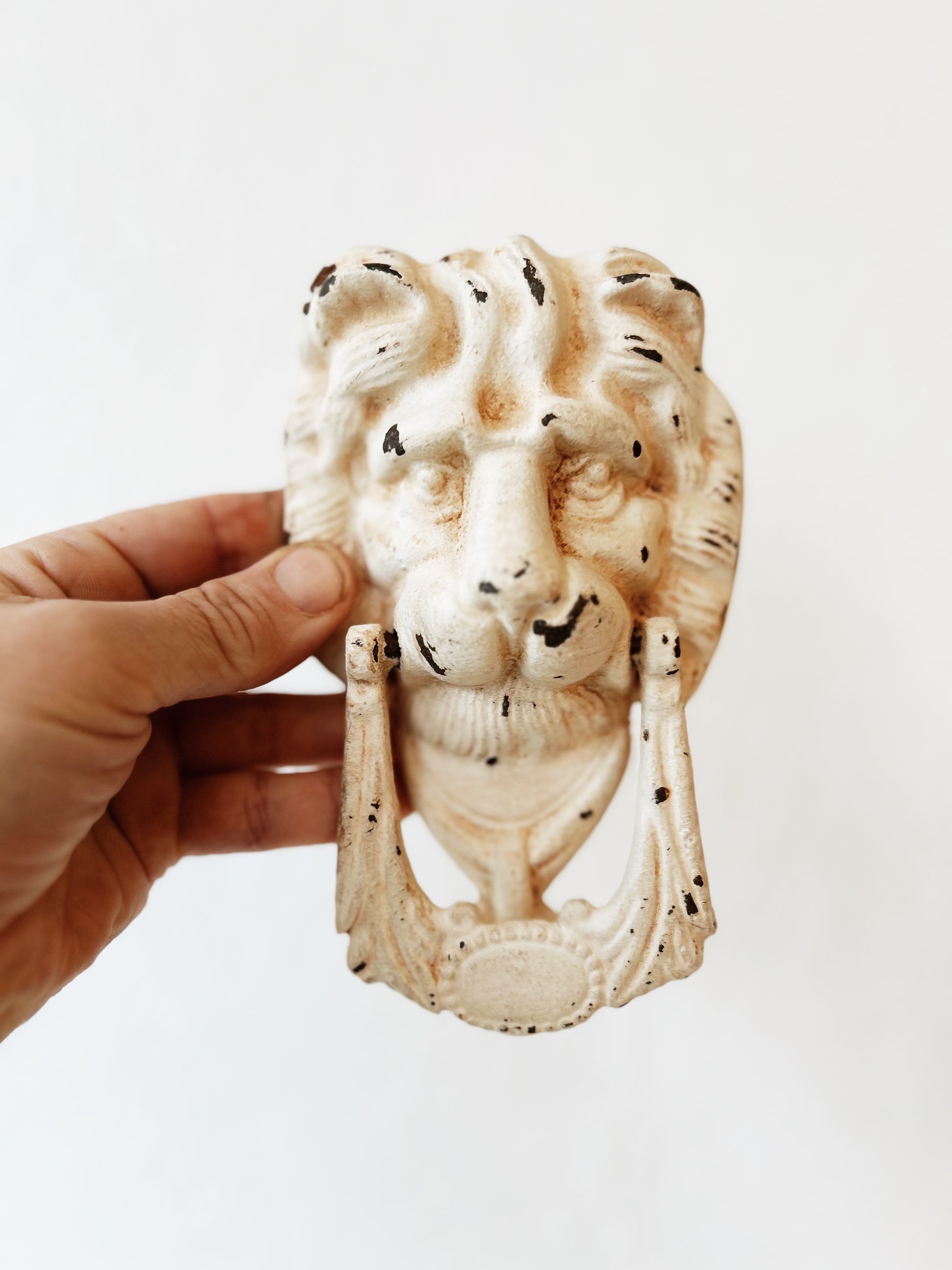 Vintage door knocker in painted cast iron. Heavy and substantial. More cowardly lion than Lion King? It won't be scaring anyone away that's for sure
