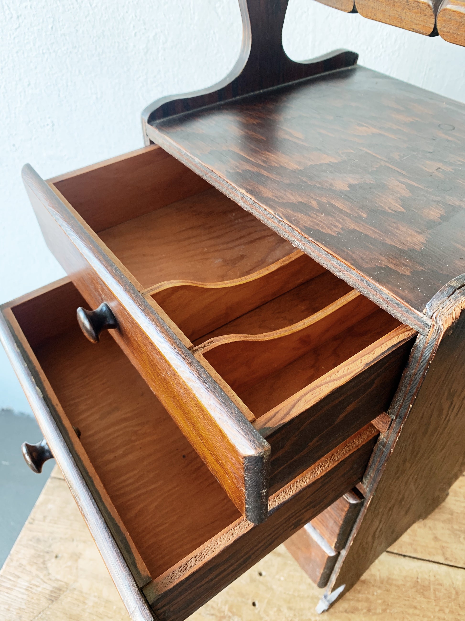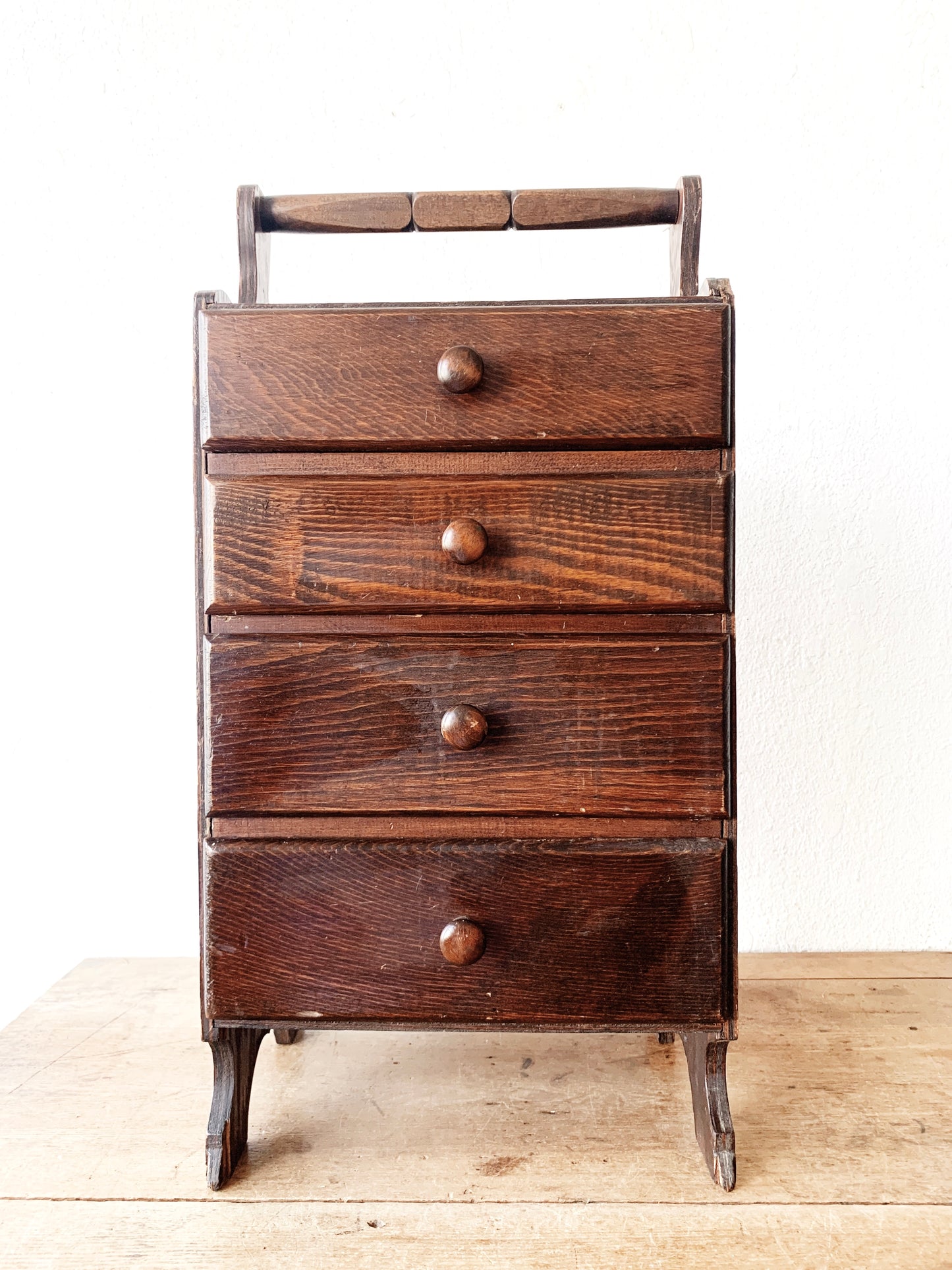Wonderful antique solid wood chest of drawers. For sewing, notions, jewelry, etc. useful and nice looking! Features four drawers, the top one with handy divider.