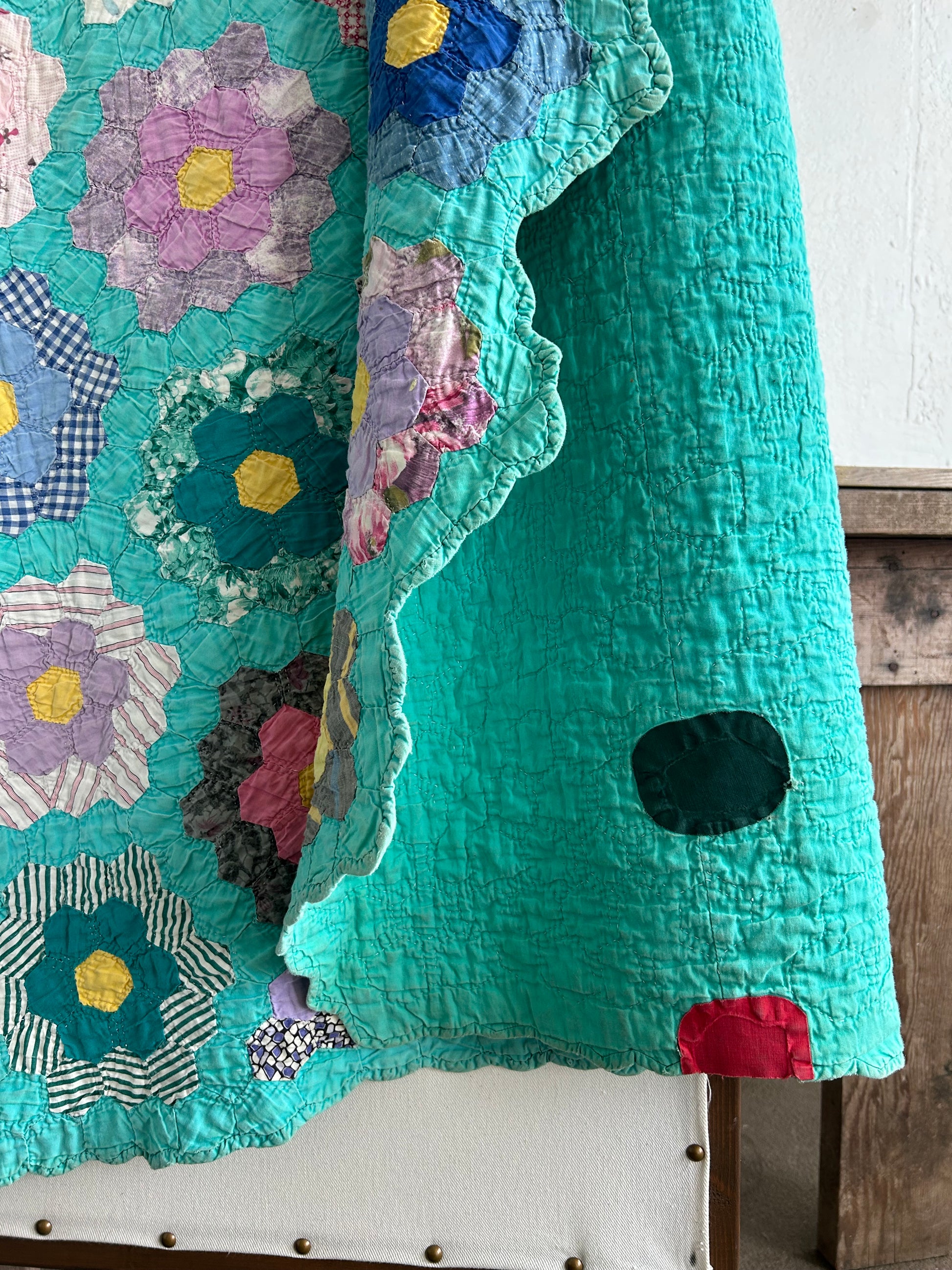Wonderful vintage all cotton quilt. Reverses to solid turquoise. It has a few little patches that add to its charm. In nice condition with minimal flaws. A few minor age spots that are hard to notice.