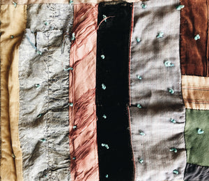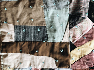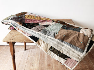 Amazing antique textile in the form of a crazy quilt. The back is old faded grey ticking, while the front is a compilation of naturally dyed cottons, wools, silks and velvets. The colors are both vibrant and faded. This is being sold as is, due to the common ailment of determination of the silks and some separation to the seams. It’s not bad at all though for displaying on a bed or wall... or even over a stair railing