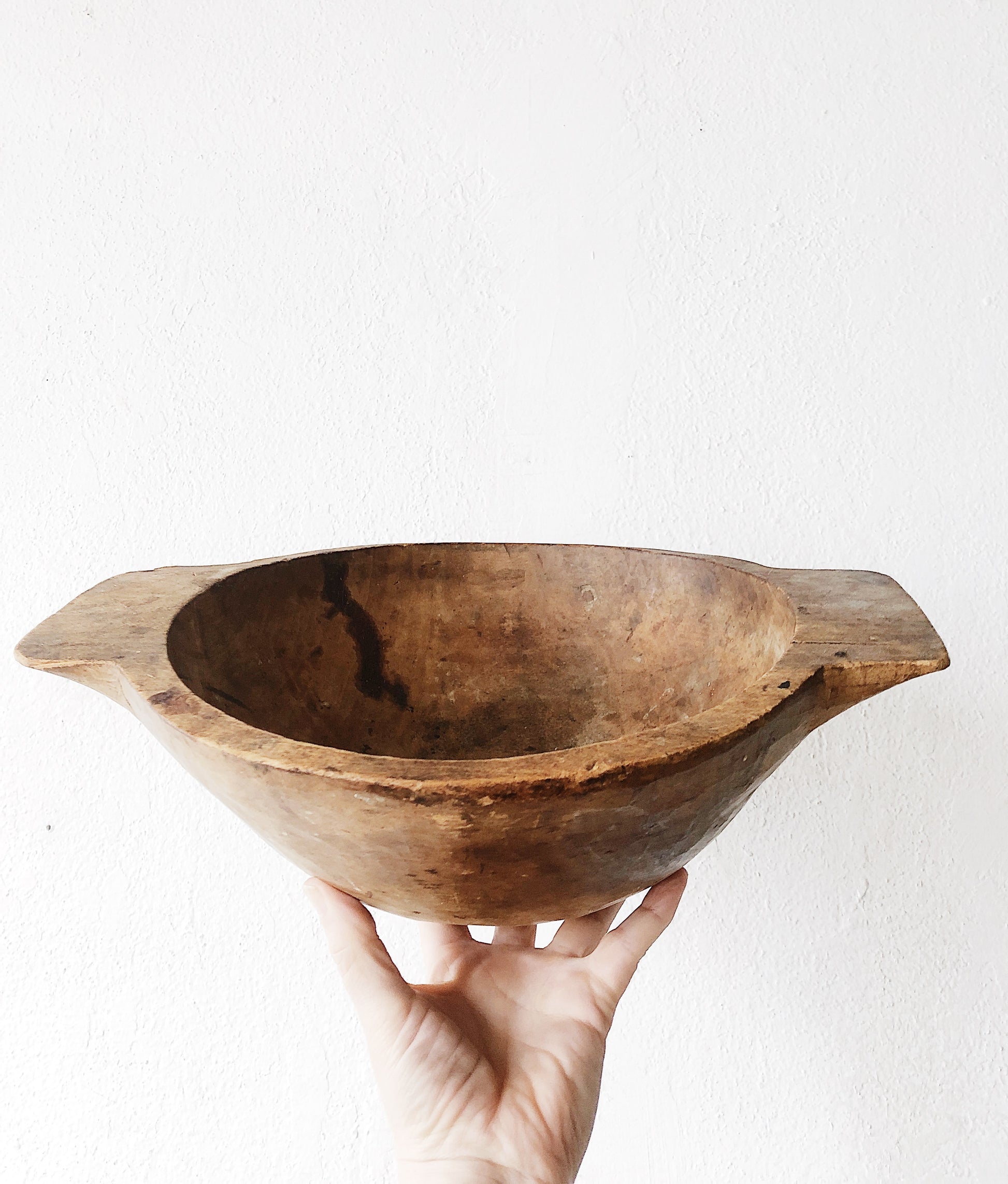 Antique dough bowl originally for rising those picture perfect round loaves we all love. This one has handles. Carve marks are evident and make a lovely patina