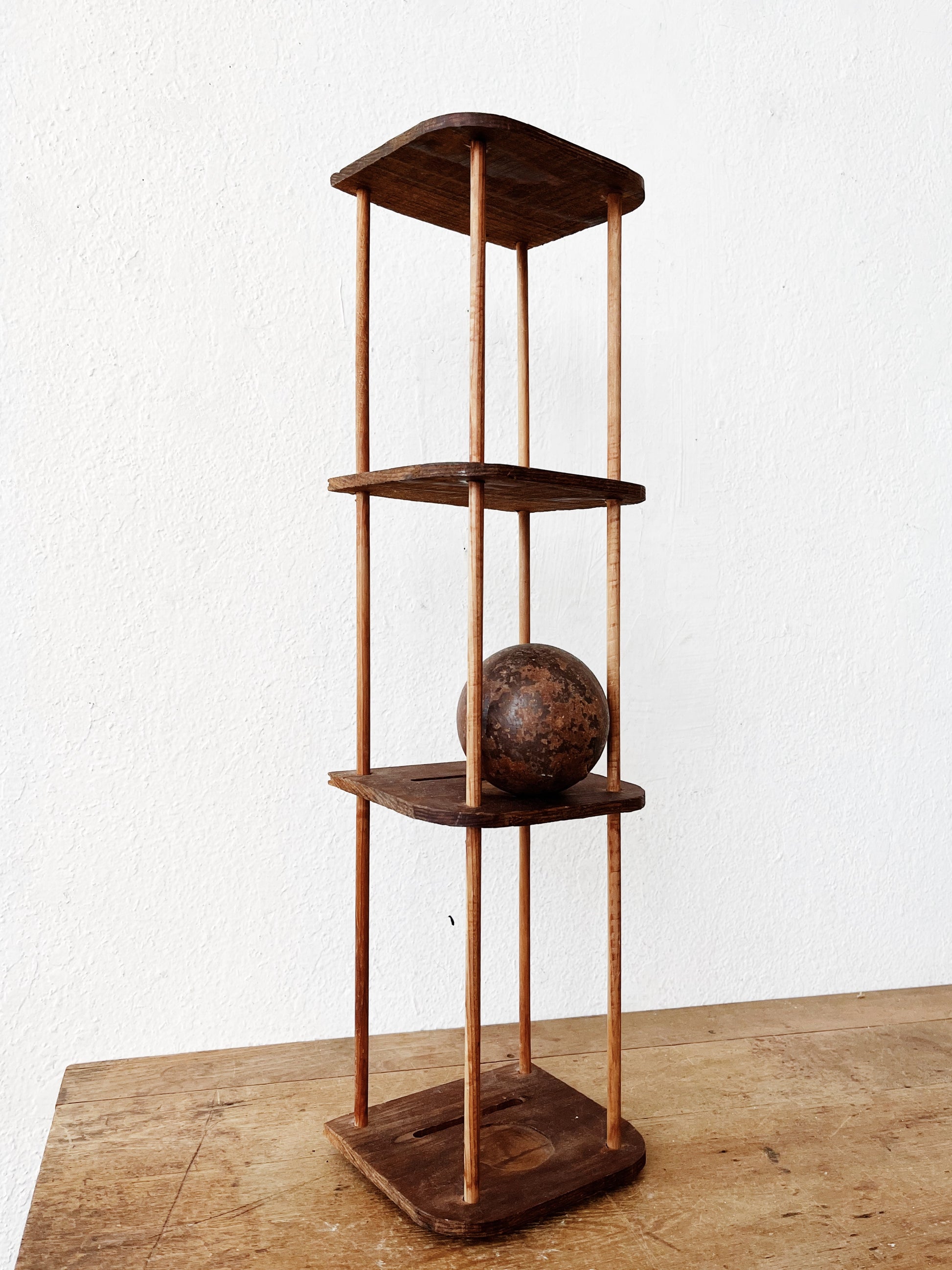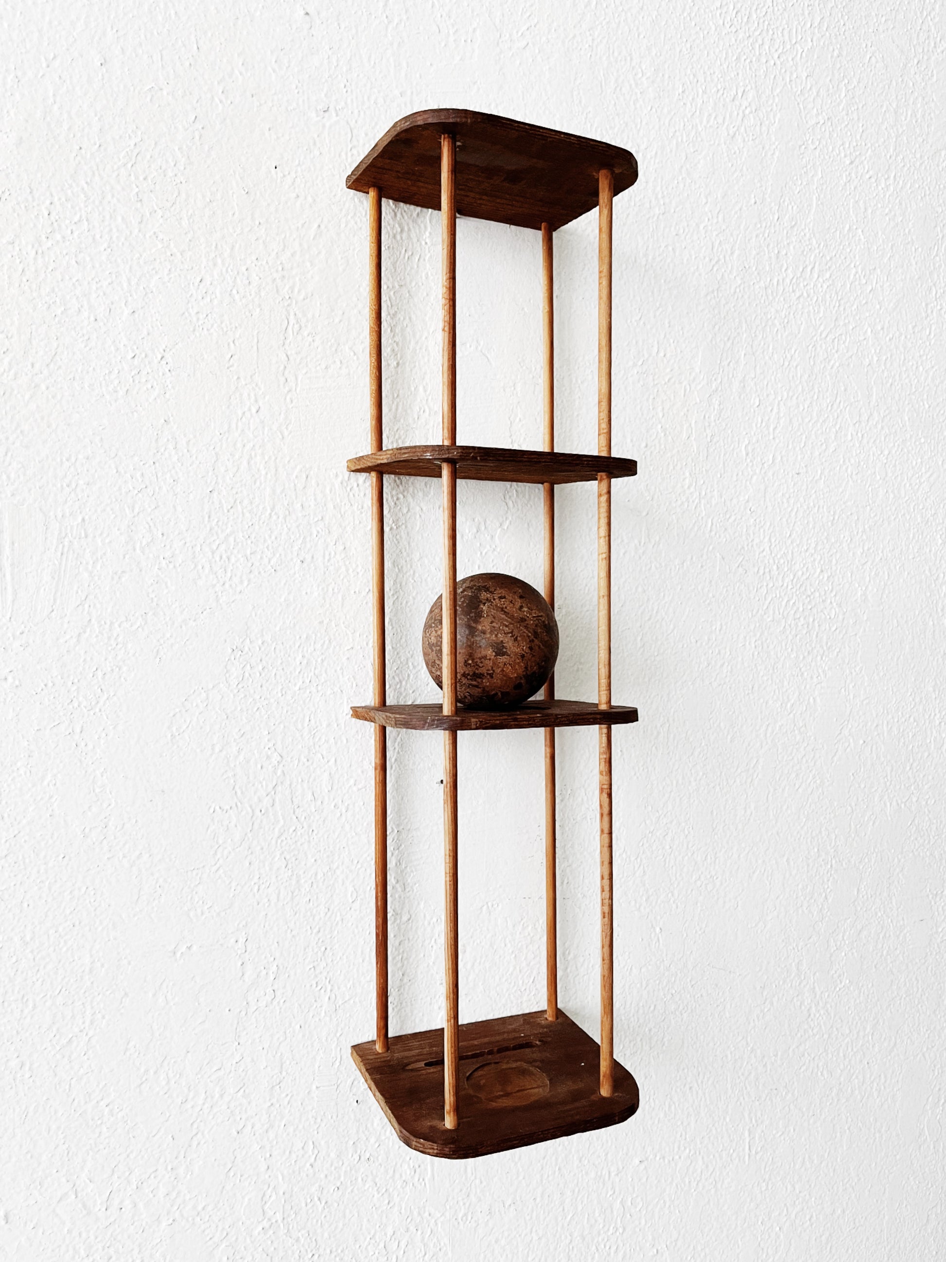 A delicate wood shelf made of wood with dowel supports and curved shelves. The shelves will move to adjust space between them. Therefore, we suggest lighter weight objects for display. Will hang or sit