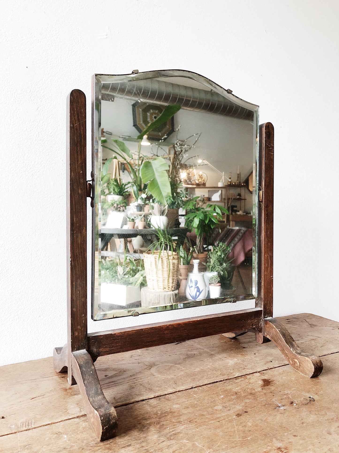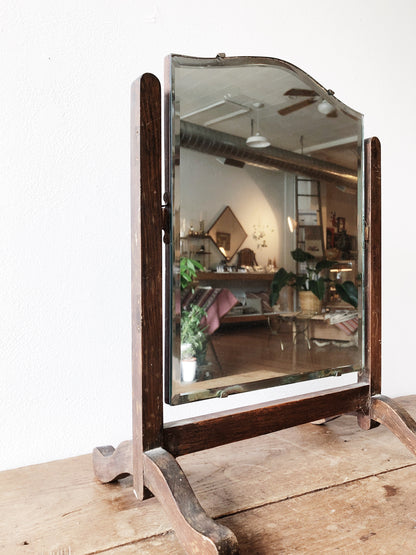 A simple wood framed antique dressing or vanity mirror. Beveled glass that slips into the frame with old brass hardwares and tilts.