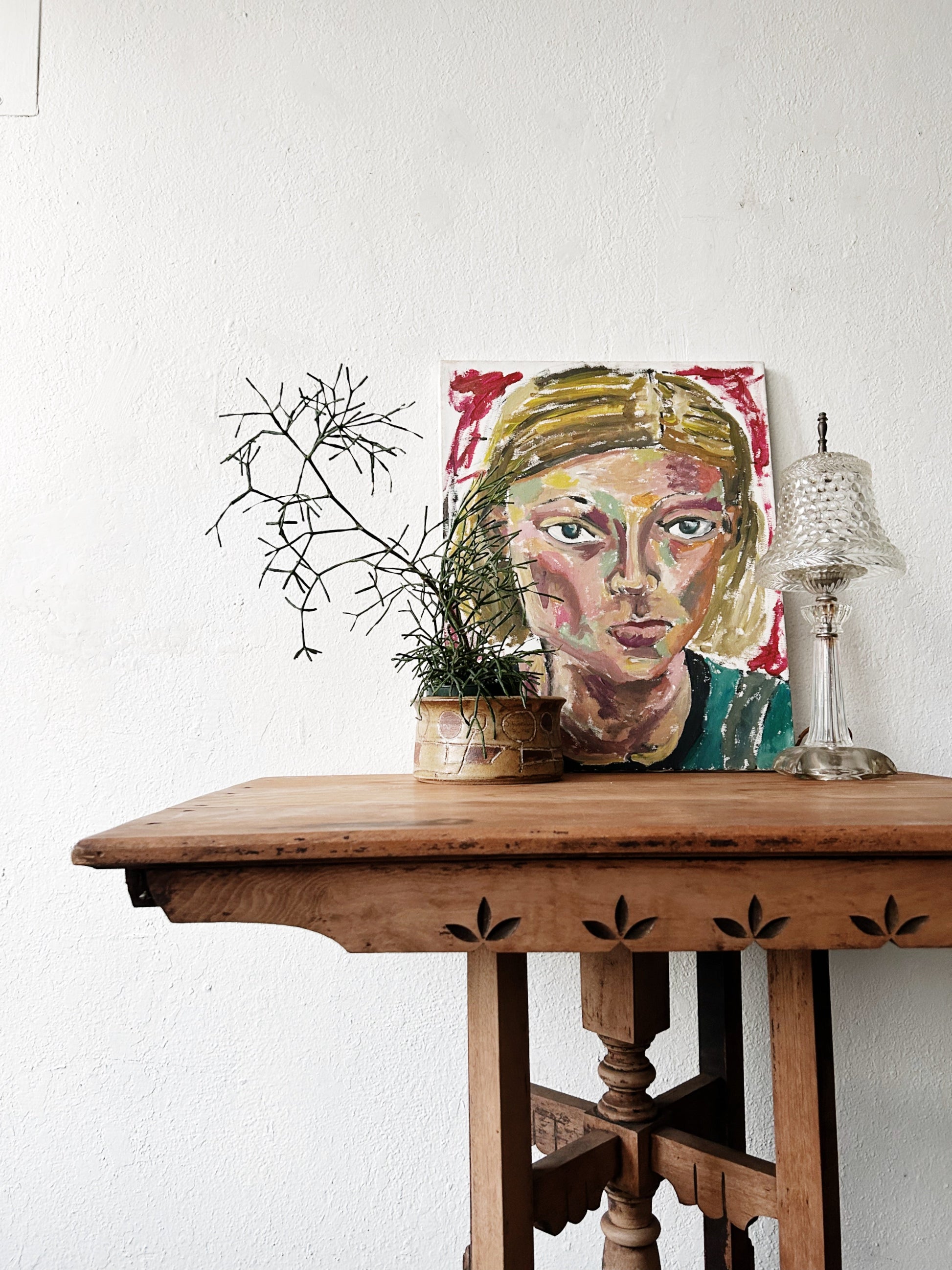 What a beauty. Rare Eastlake find! Natural wood with intricately carved base and side floral motif. Hard to let this one go. Great in the entry or breakfast for two.