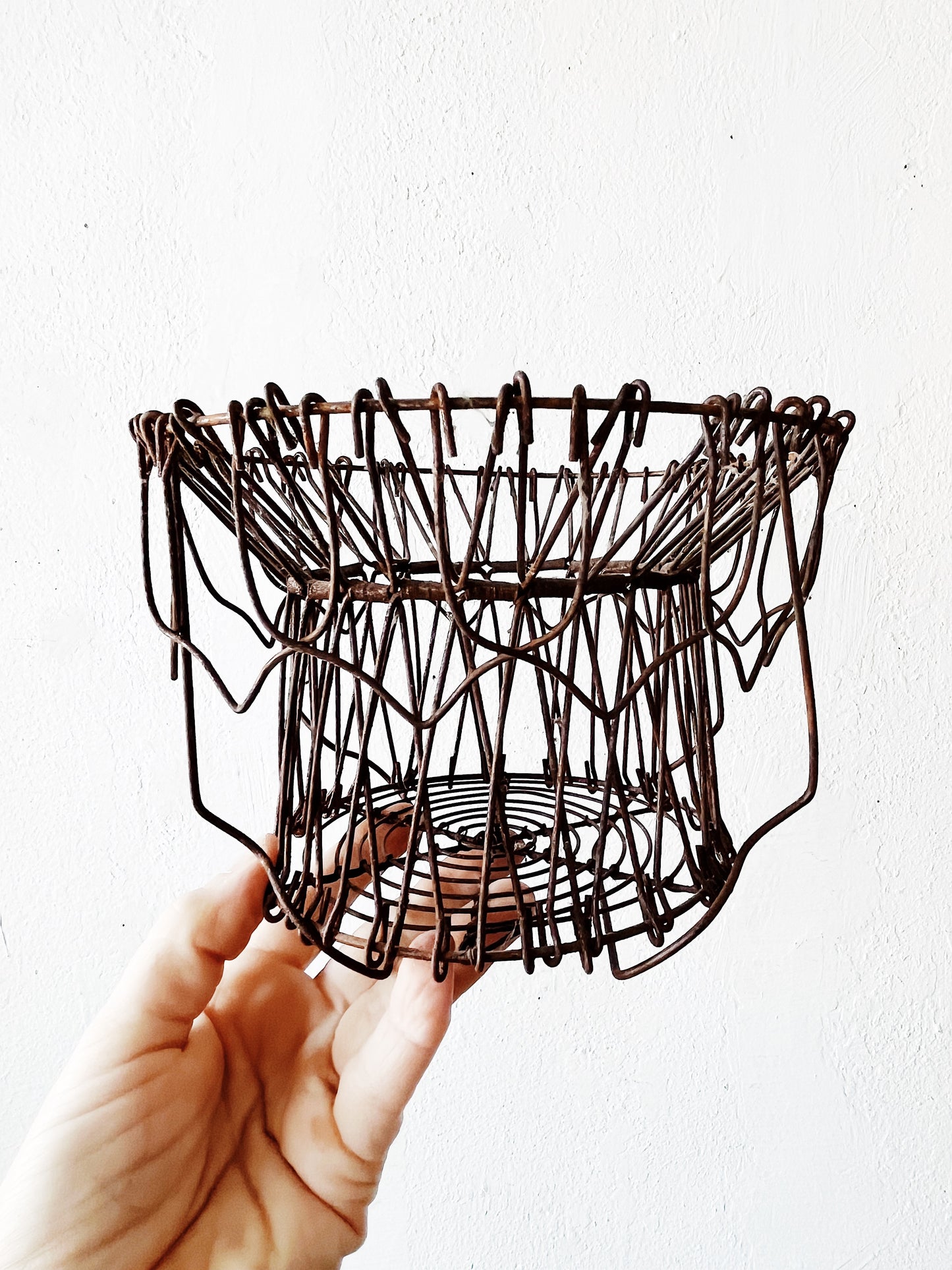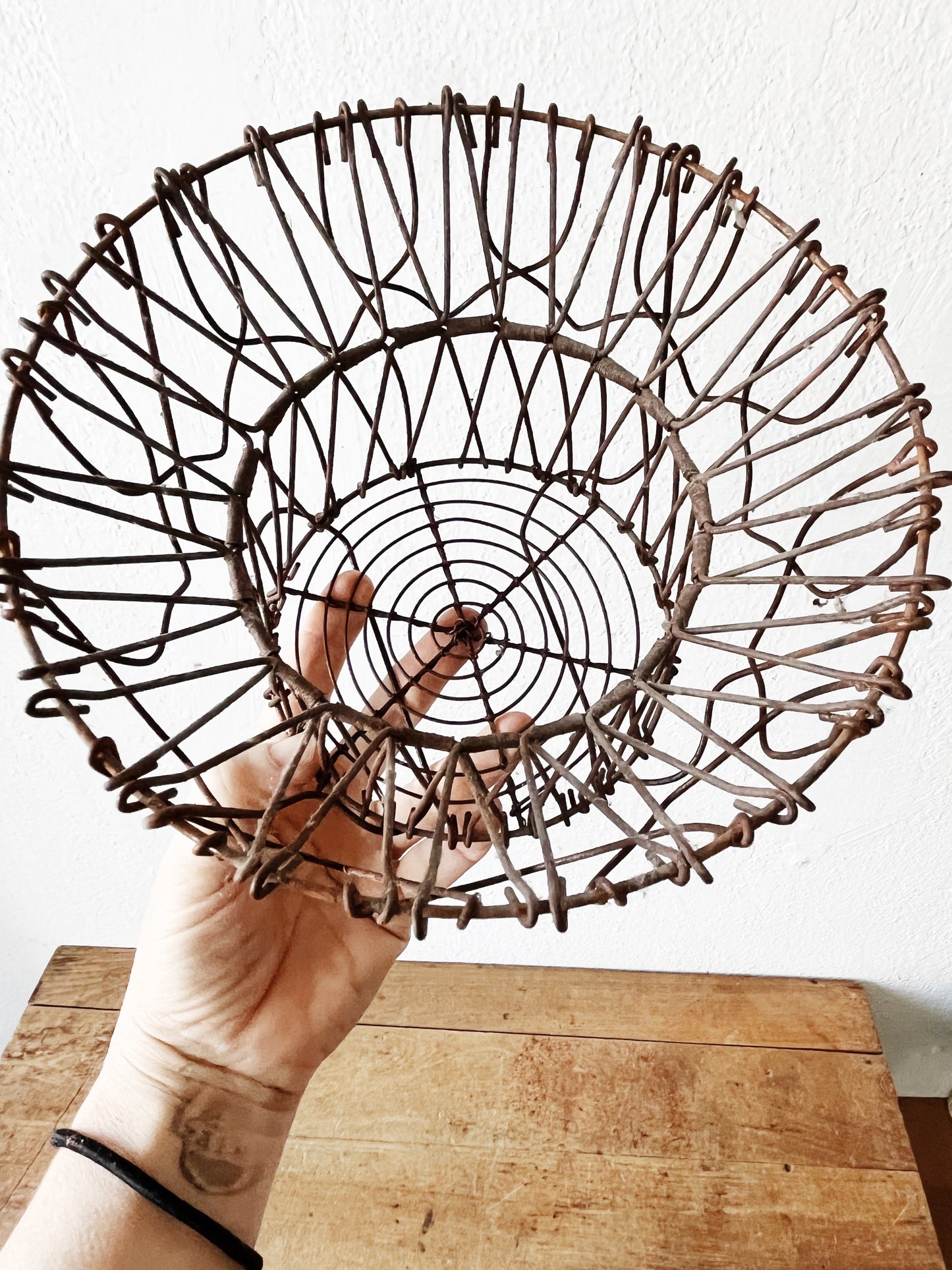 Antique egg basket. Gather and store all in one. And not only eggs…produce from the garden too. Thinnest wire is sculptural and delicate. Expands and contracts for different looks.