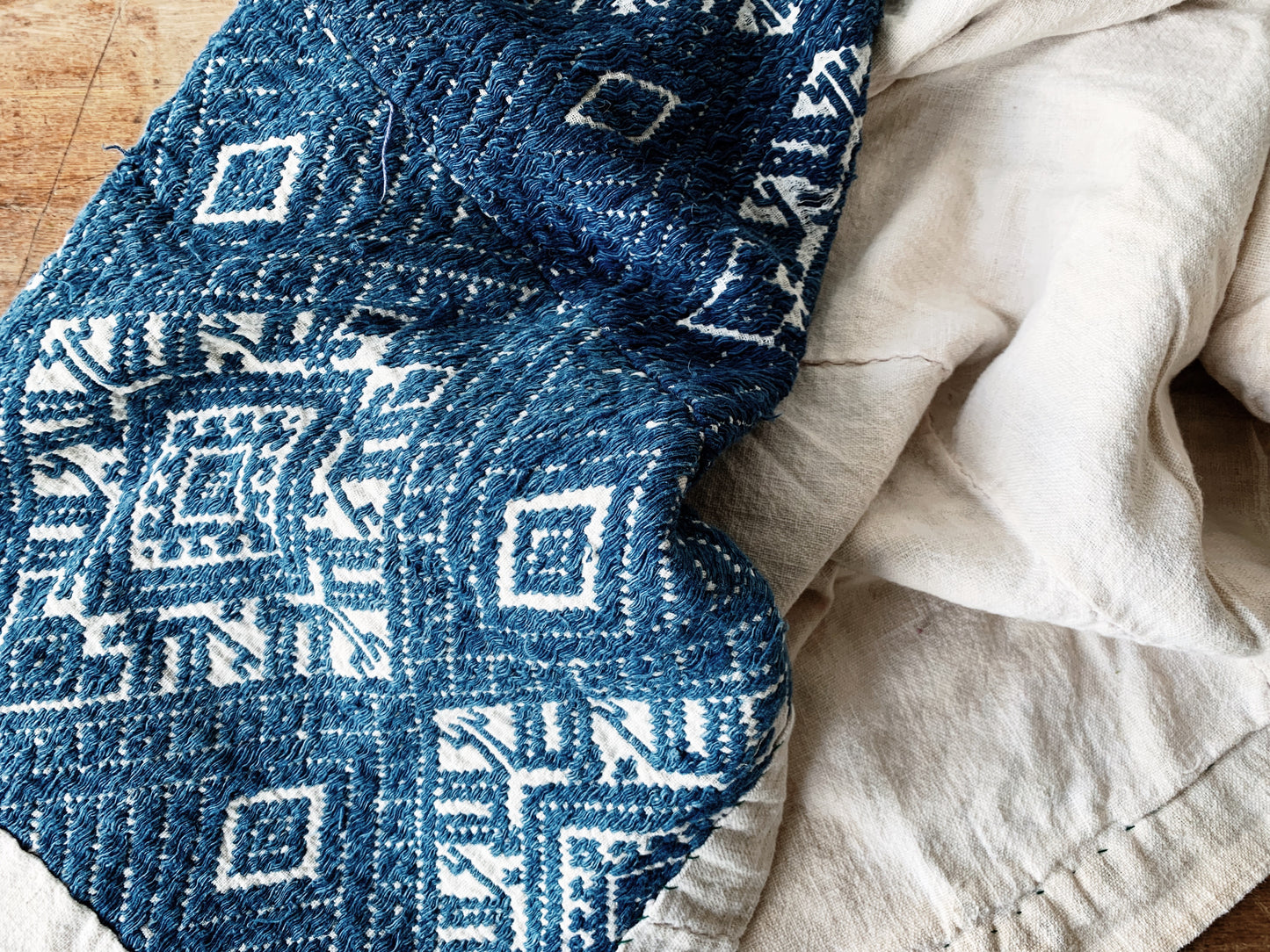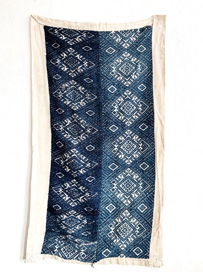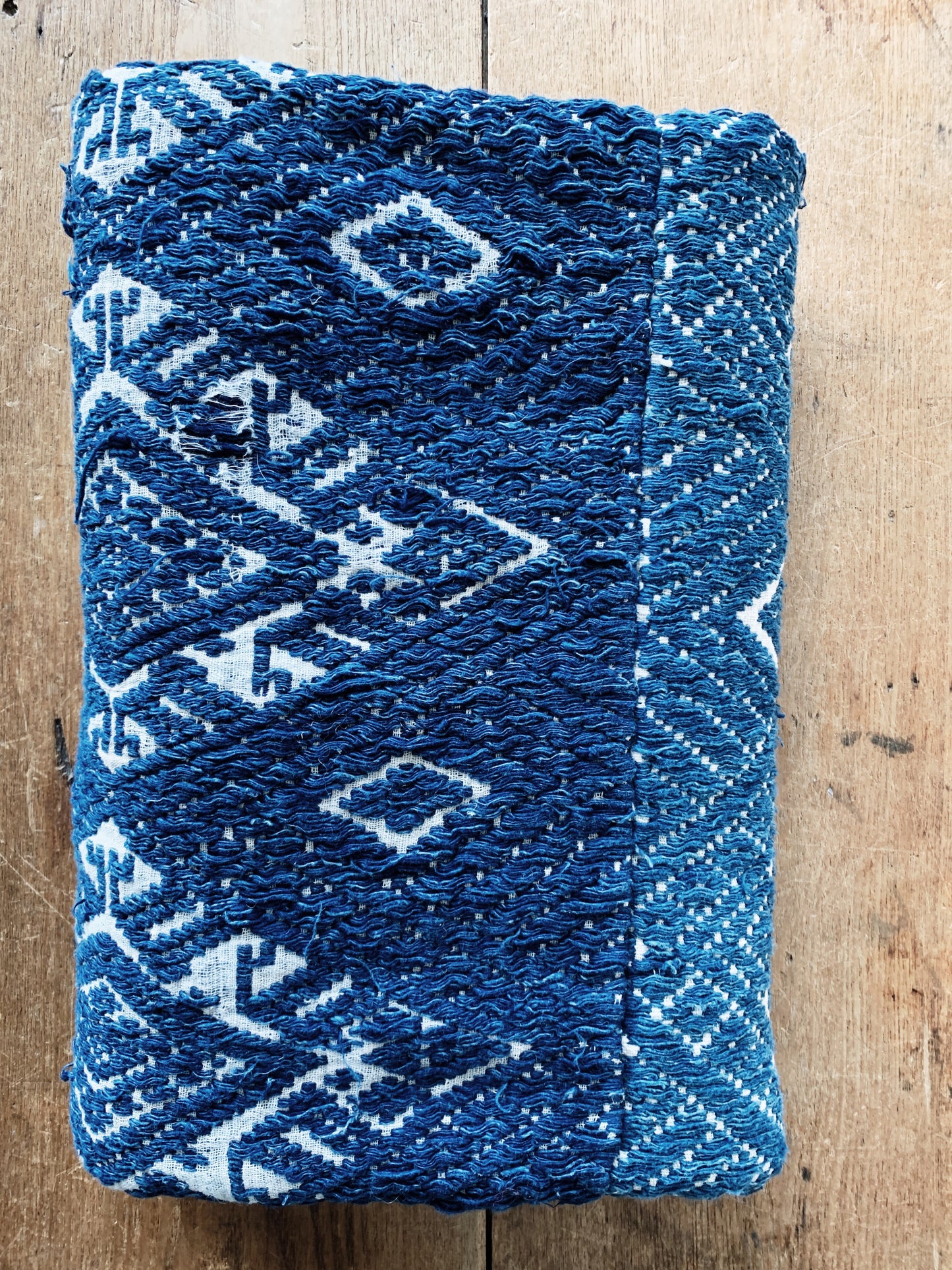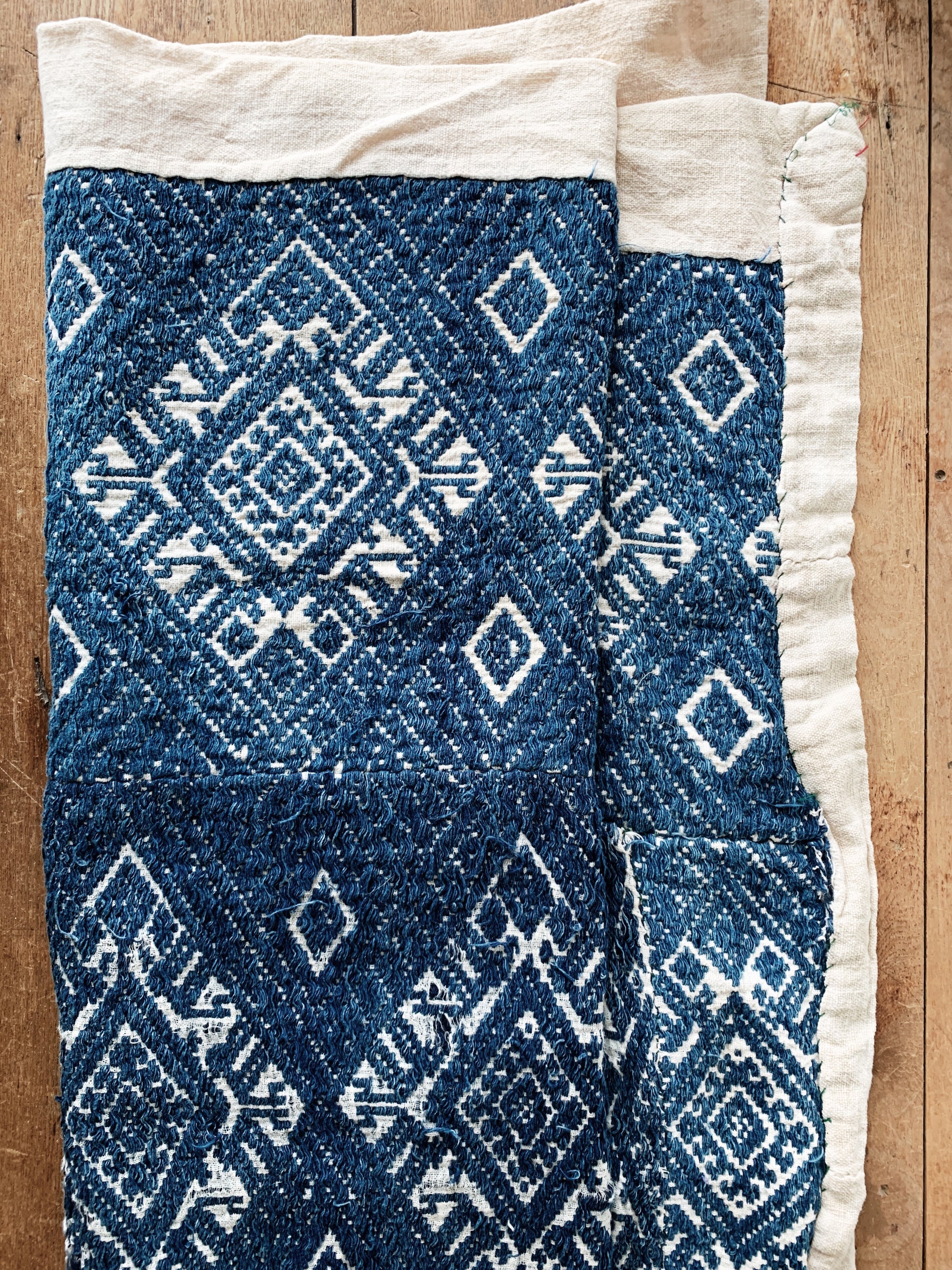 Gorgeous hand embroidered cotton textile that we love hung as art. Would be beautiful hung above the bed. It’s an oldie and has some areas of pulled yarn and sections where the hand stitching around the border has come undone. We love it just the same.