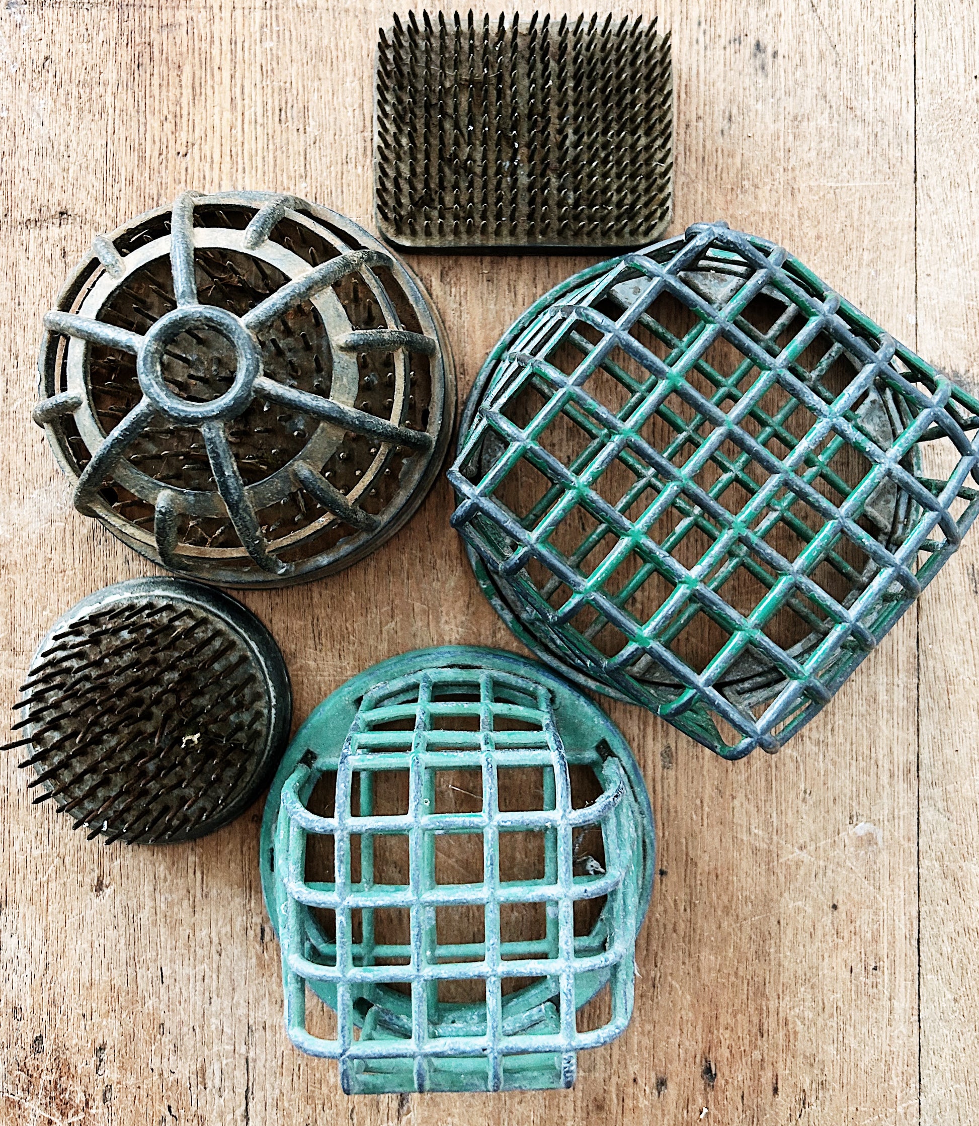 Five weighty antique metal floral frogs in varying sizes and shapes. A nice collection!