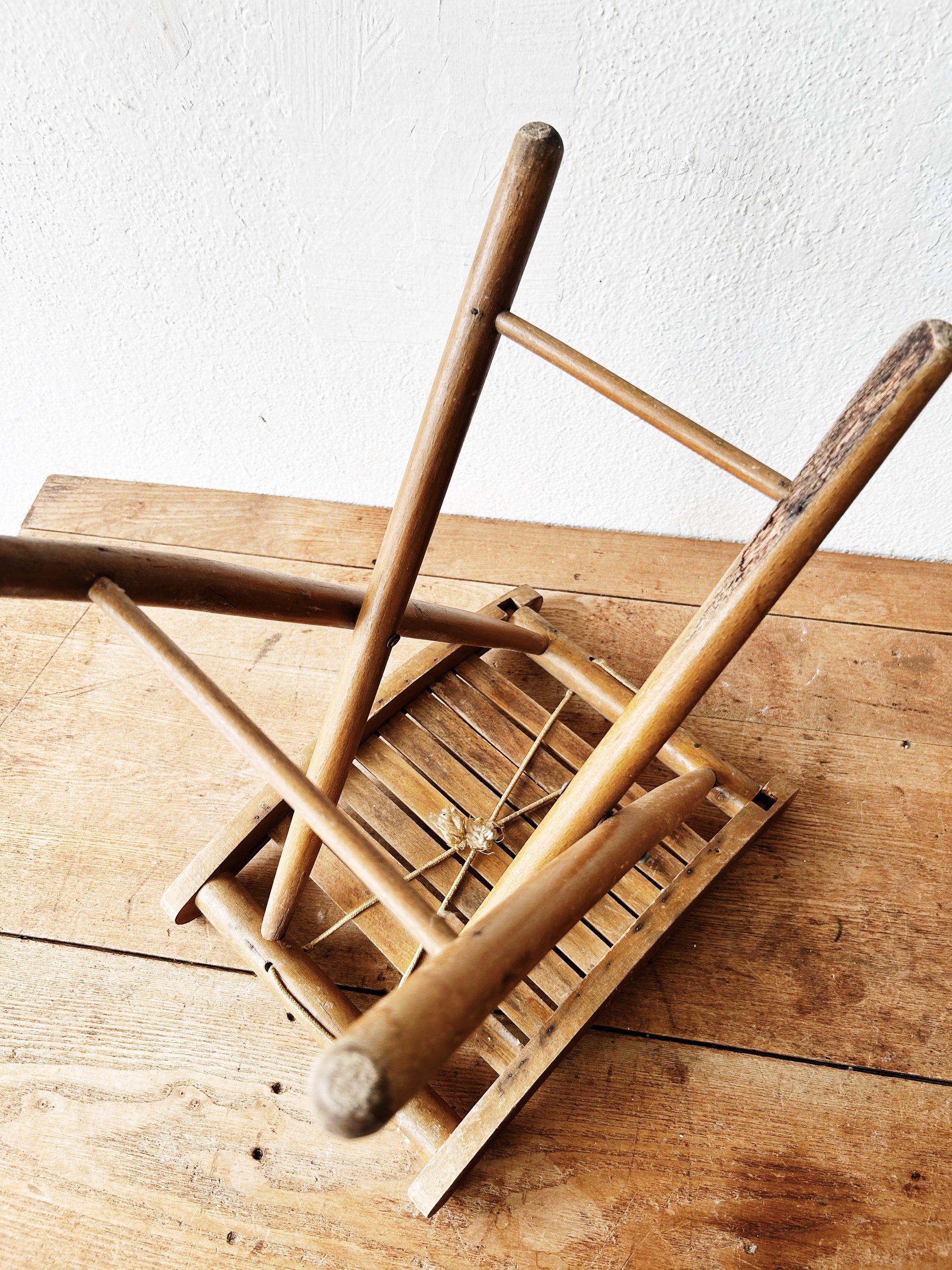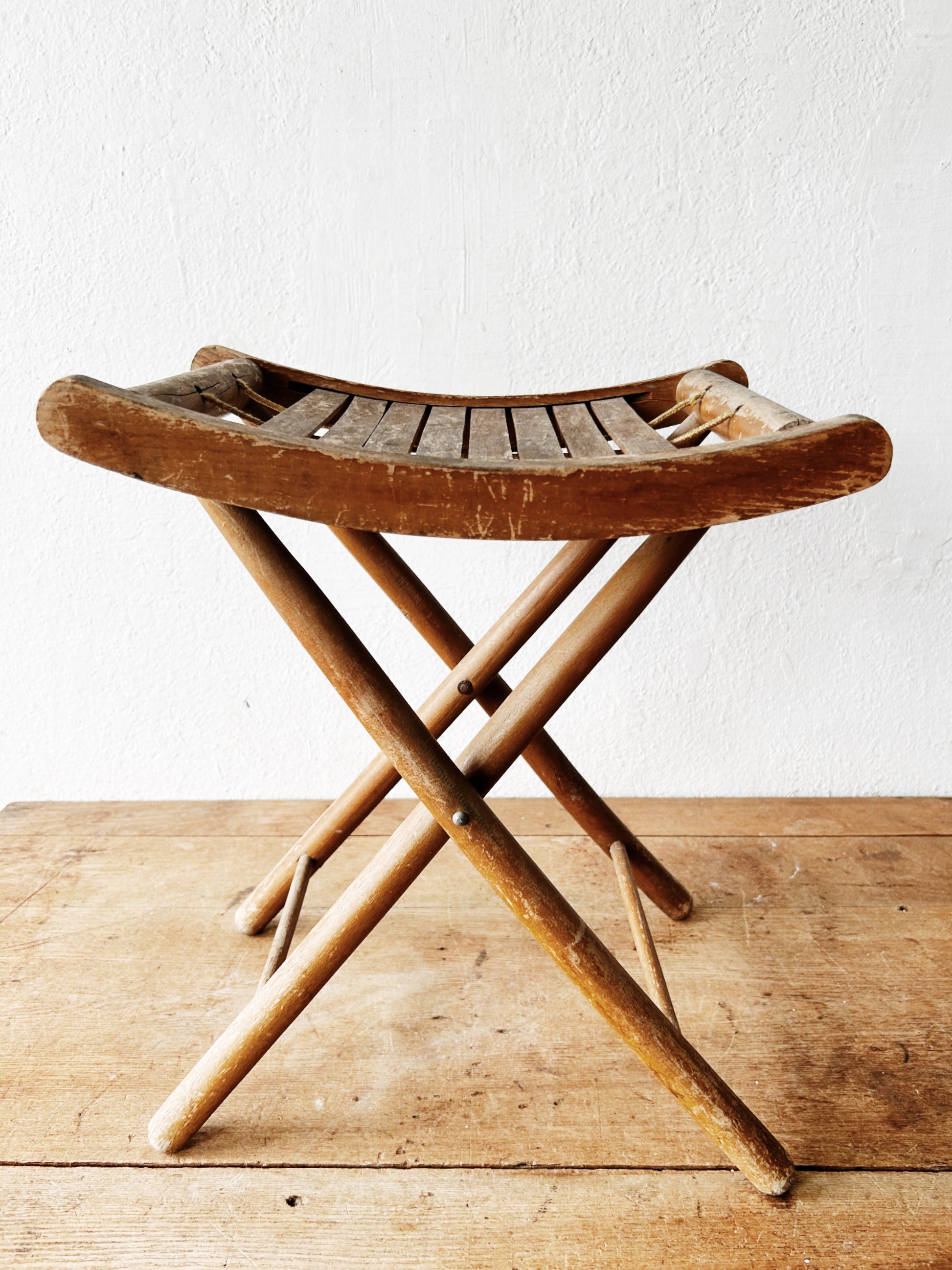 Faded old wood camp stool with slatted seat. Folds down with old string carry handle. Overall wear but sturdy