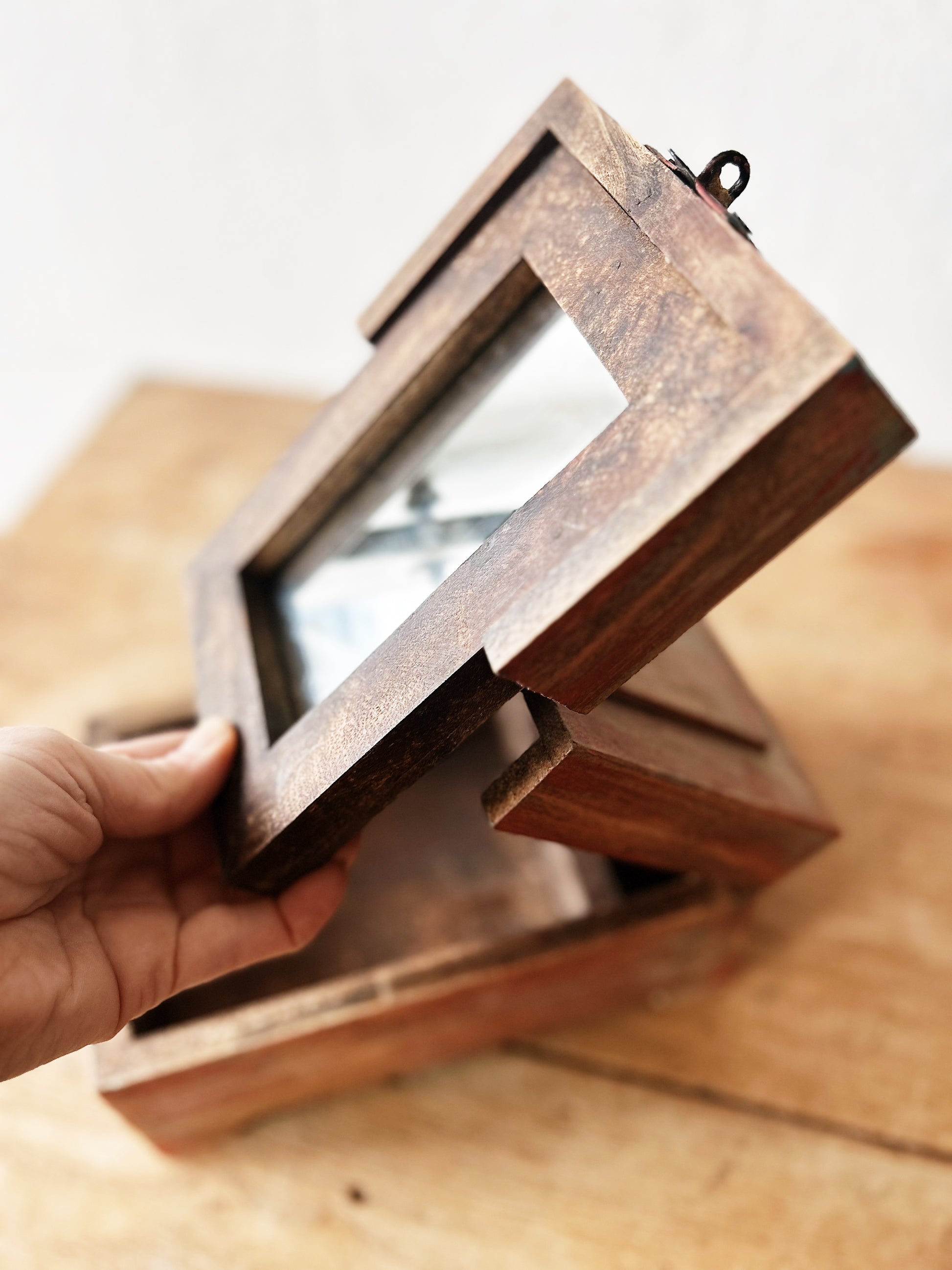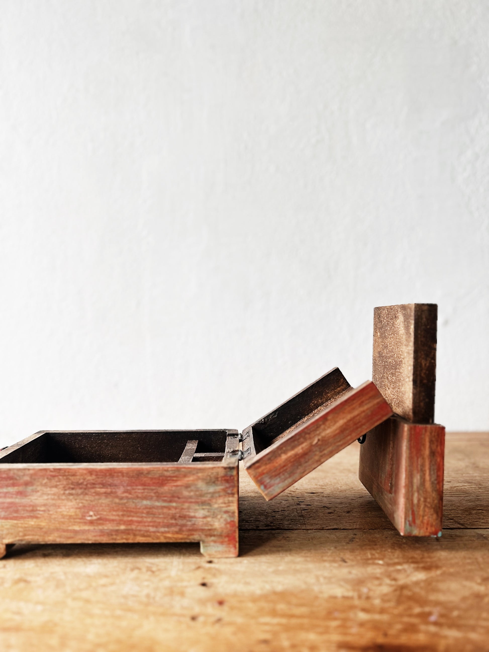 Folk art/primitive wood box with folding mirror. Painted with original hardware. Very charming and unique