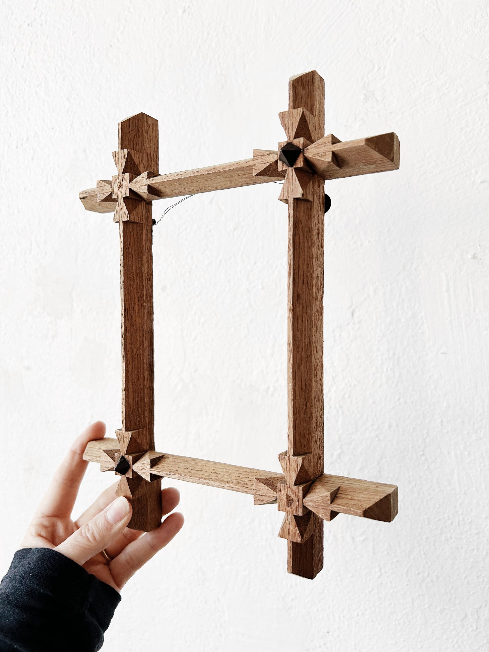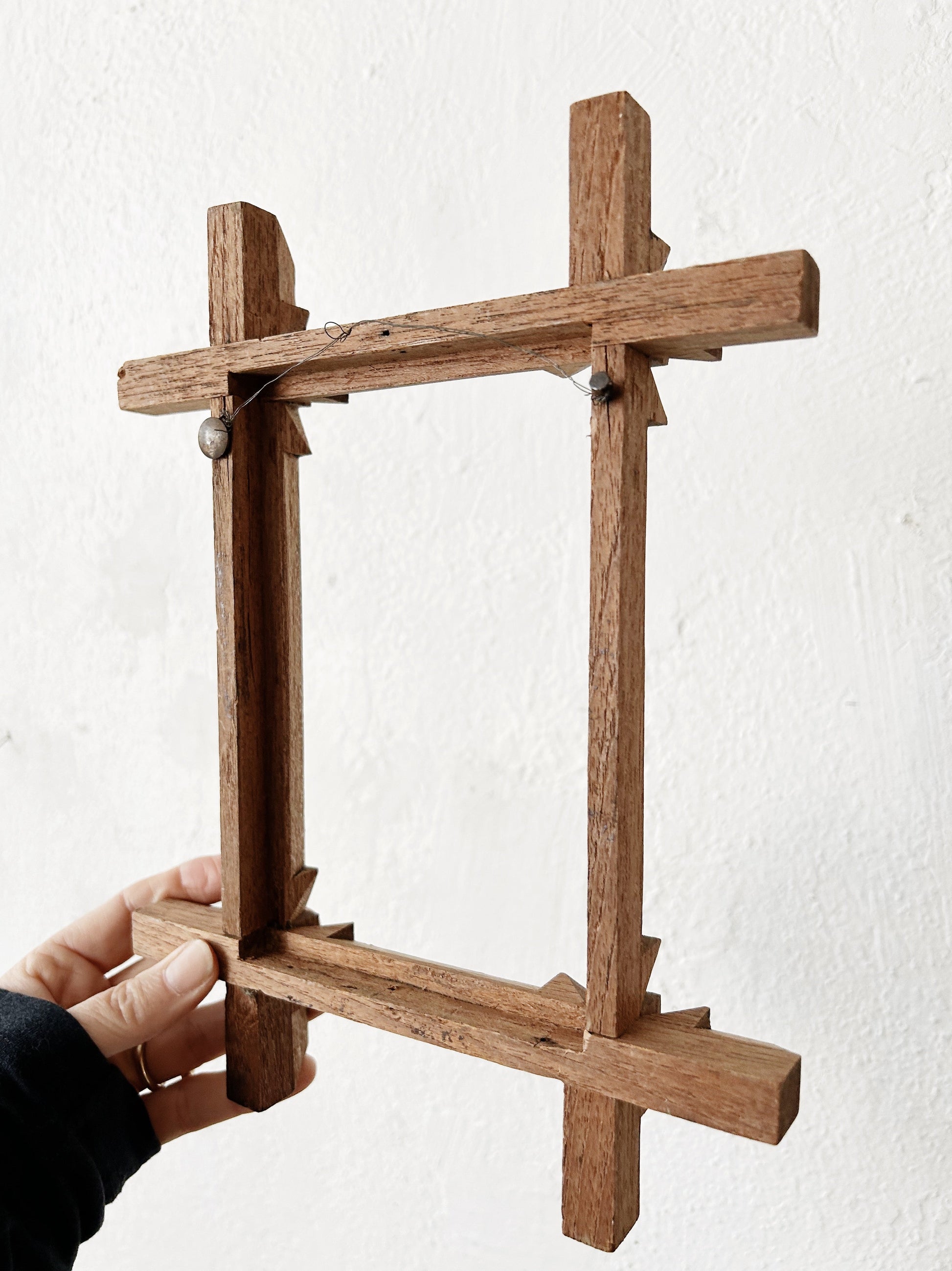 charming wood frame with carved wood flower corner details. Wire hanger on back. No glass