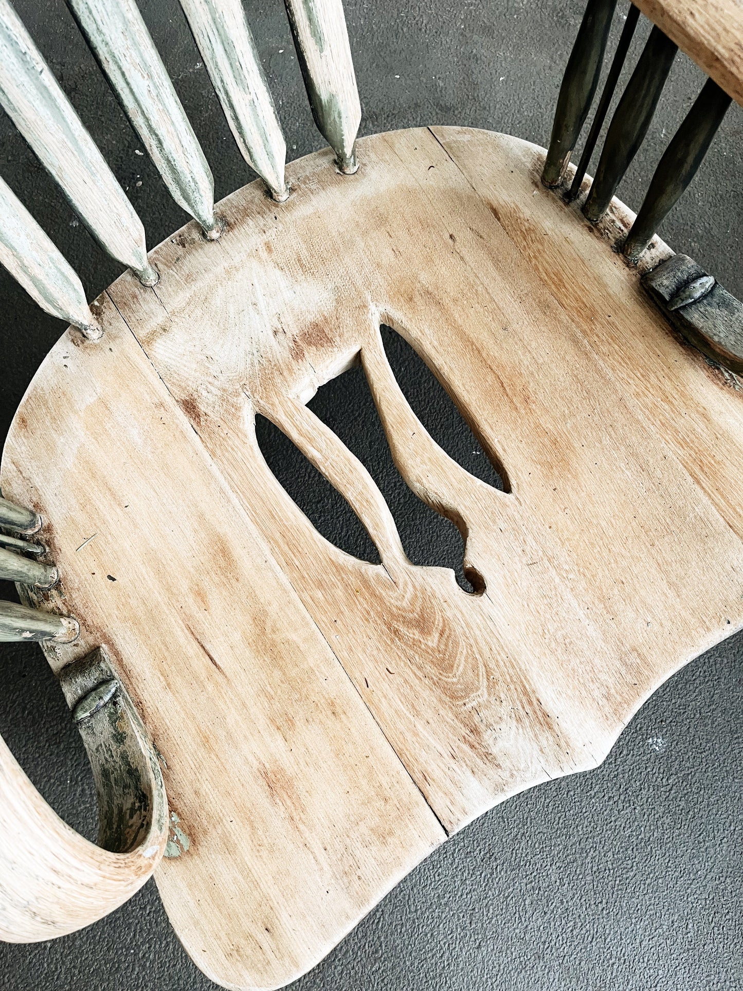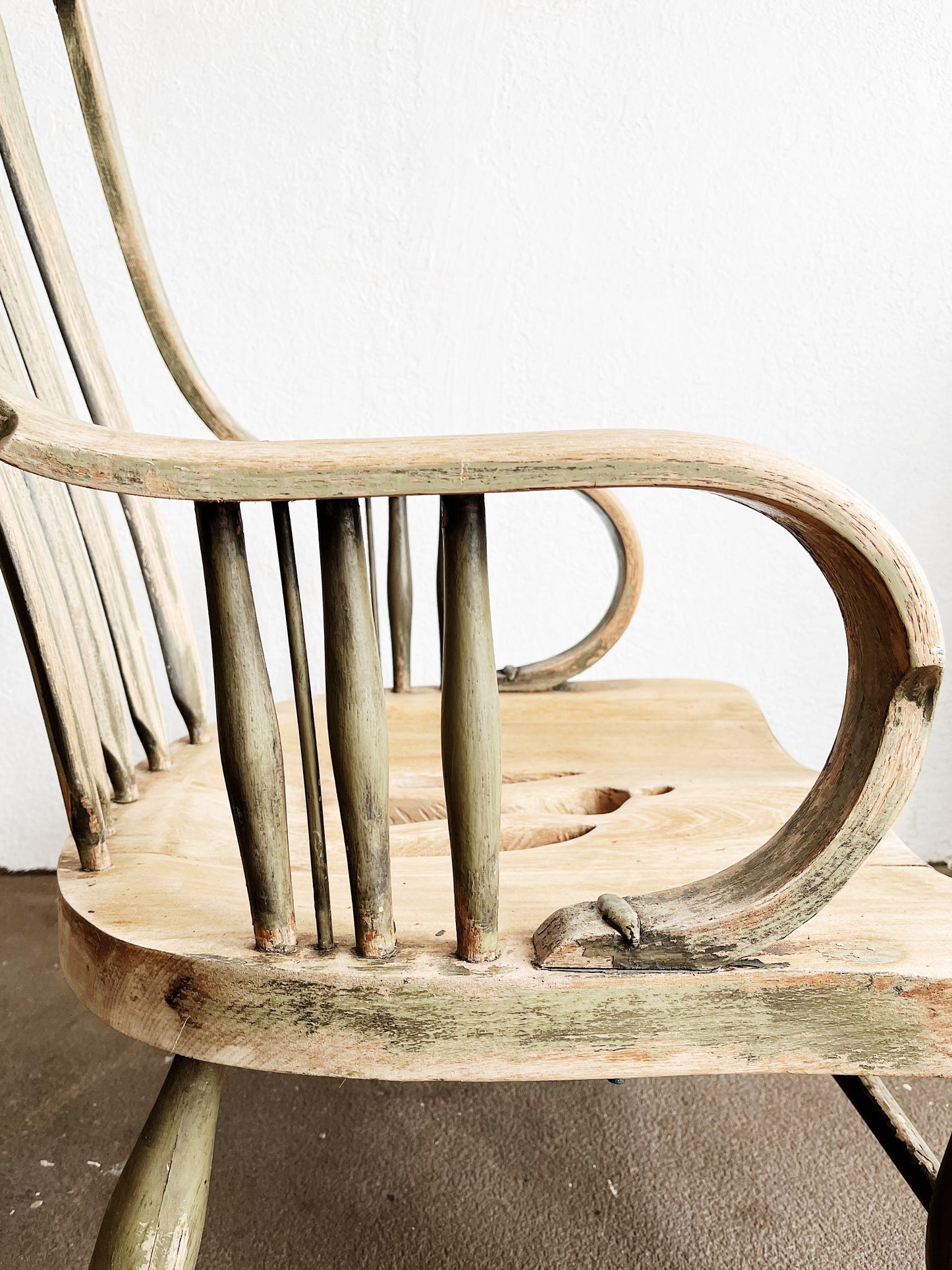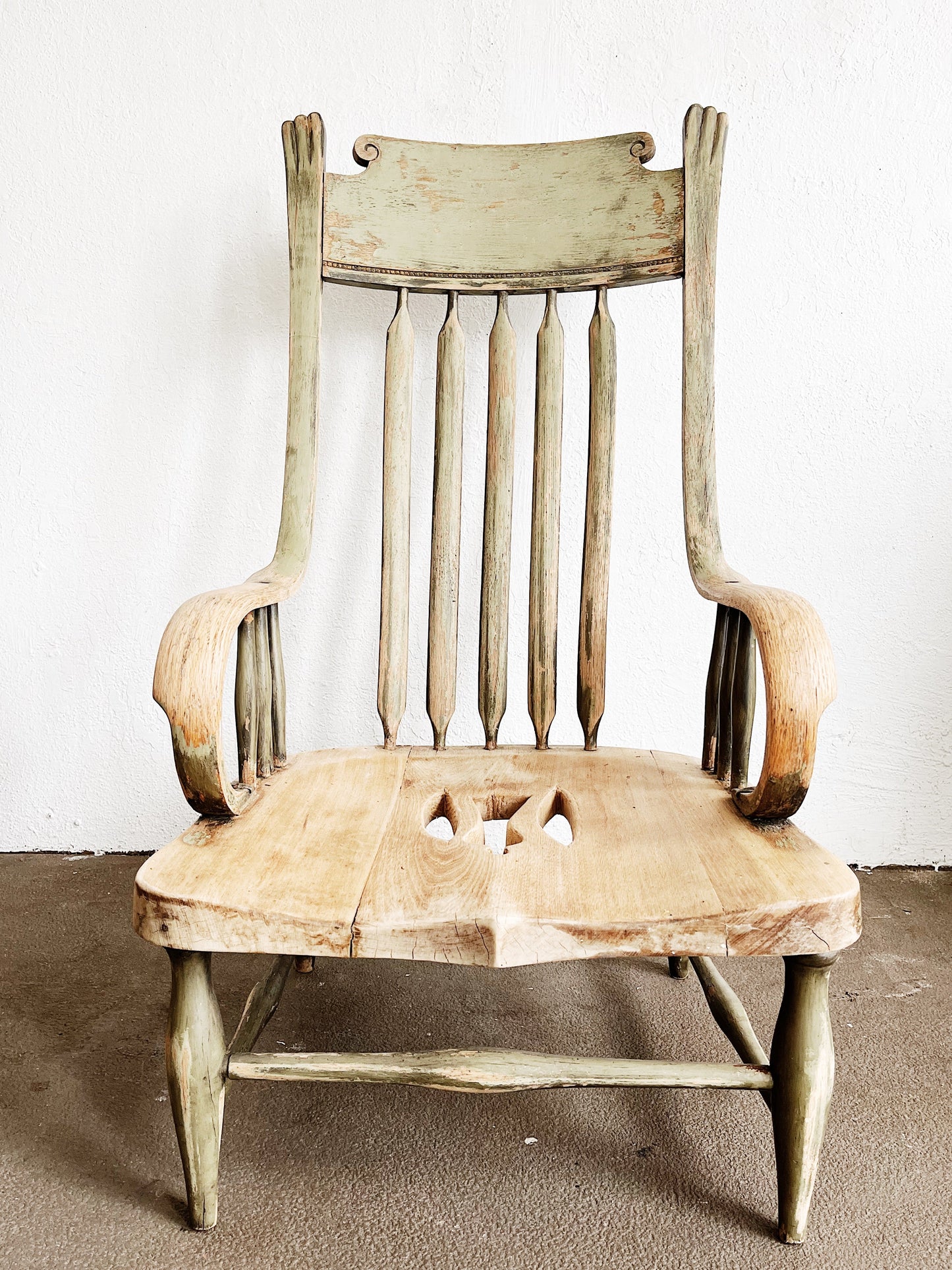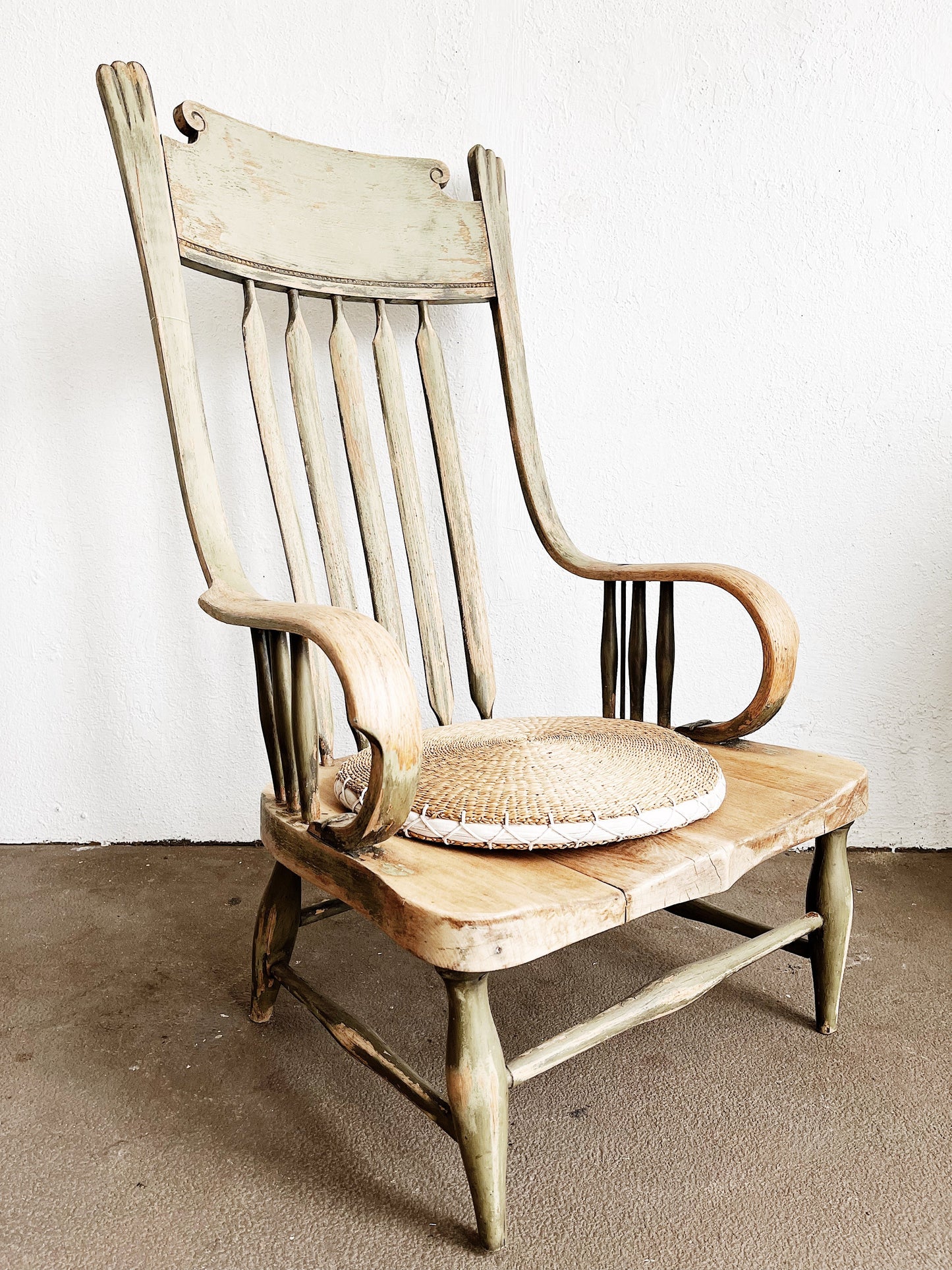 Really fabulous old chair. Low seated and tall backed. Stripped to the natural wood with bits of original pale green paint coming through. Bentwood arms with metal supports. Comes with the seat cushion. Surprisingly comfortable and probably even moreso if you add some padding but we like seeing the details. Sturdy but old so use with care.