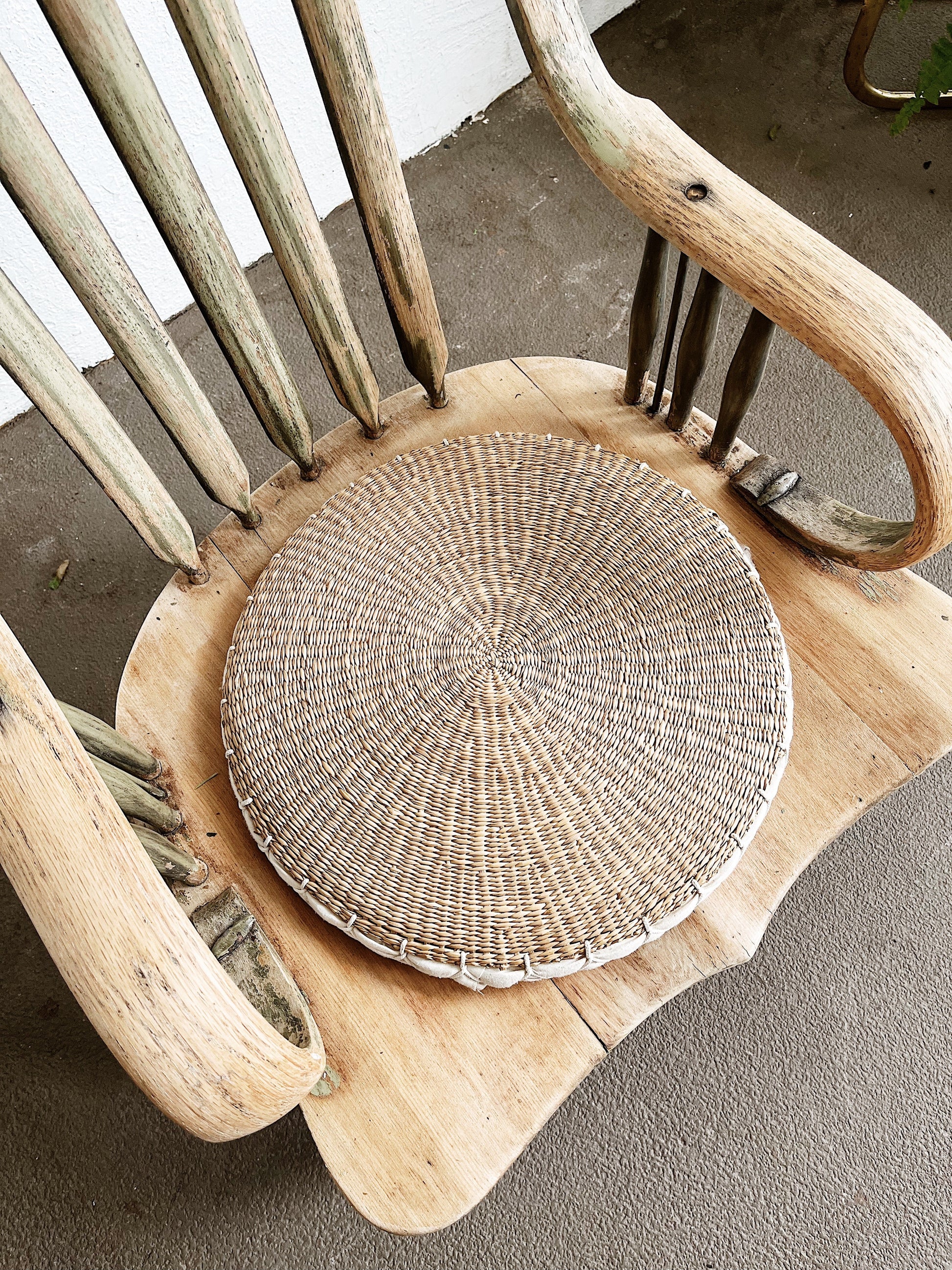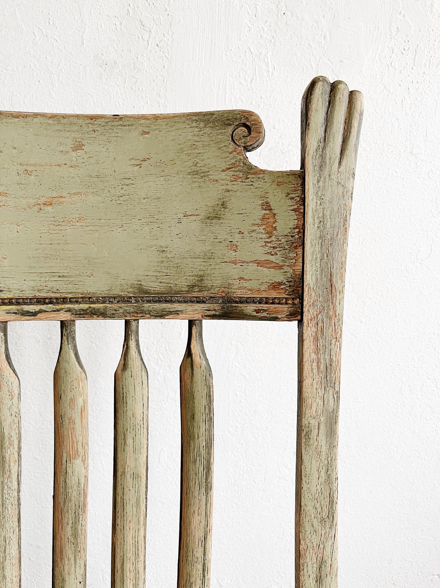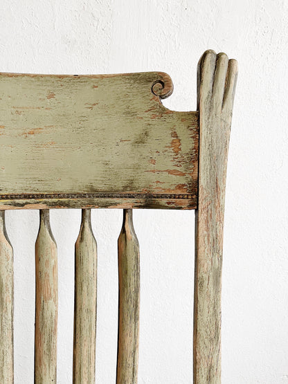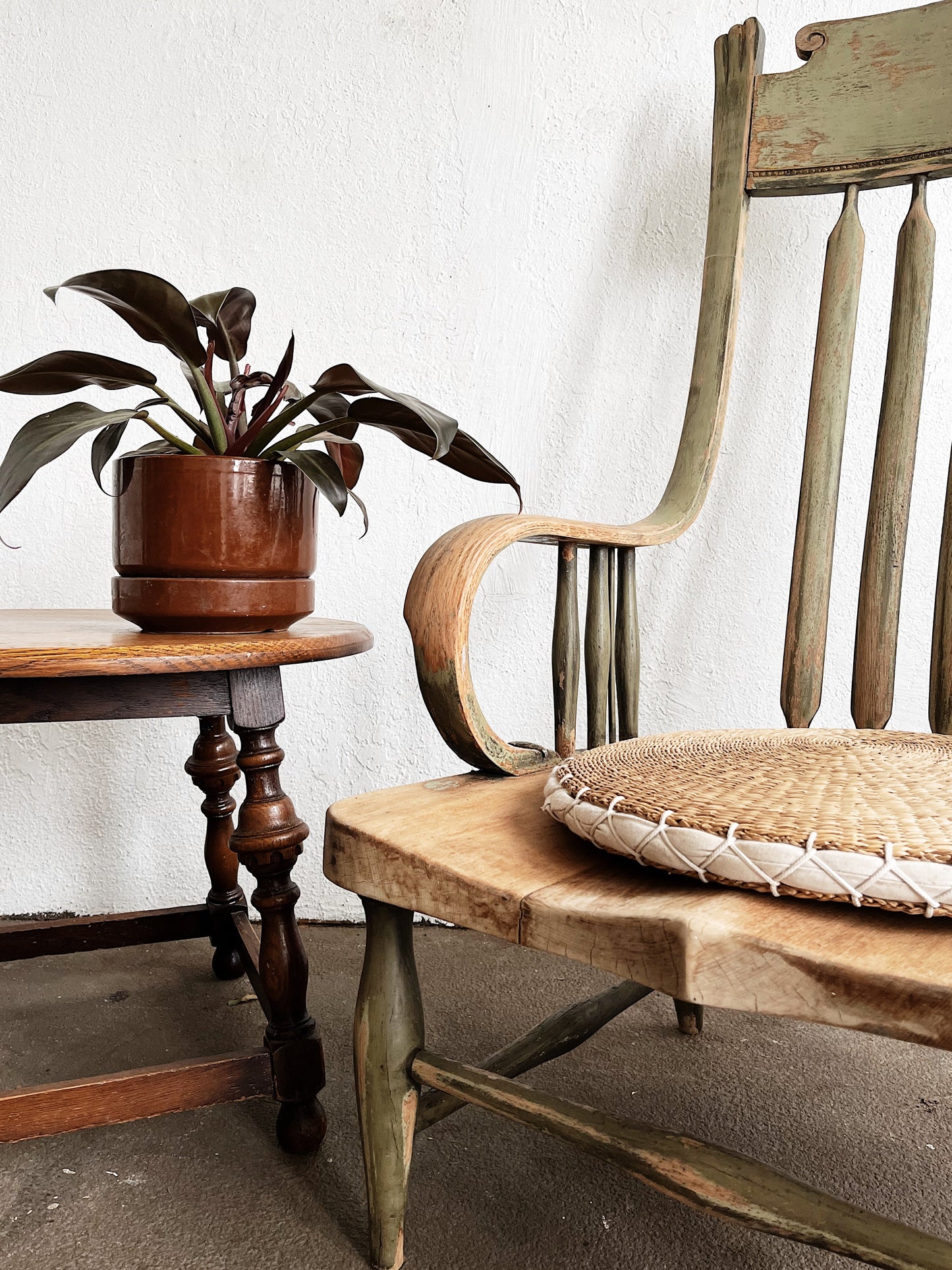 Really fabulous old chair. Low seated and tall backed. Stripped to the natural wood with bits of original pale green paint coming through. Bentwood arms with metal supports. Comes with the seat cushion. Surprisingly comfortable and probably even moreso if you add some padding but we like seeing the details. Sturdy but old so use with care.