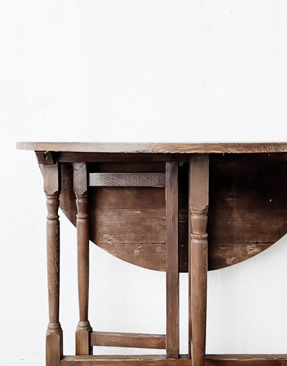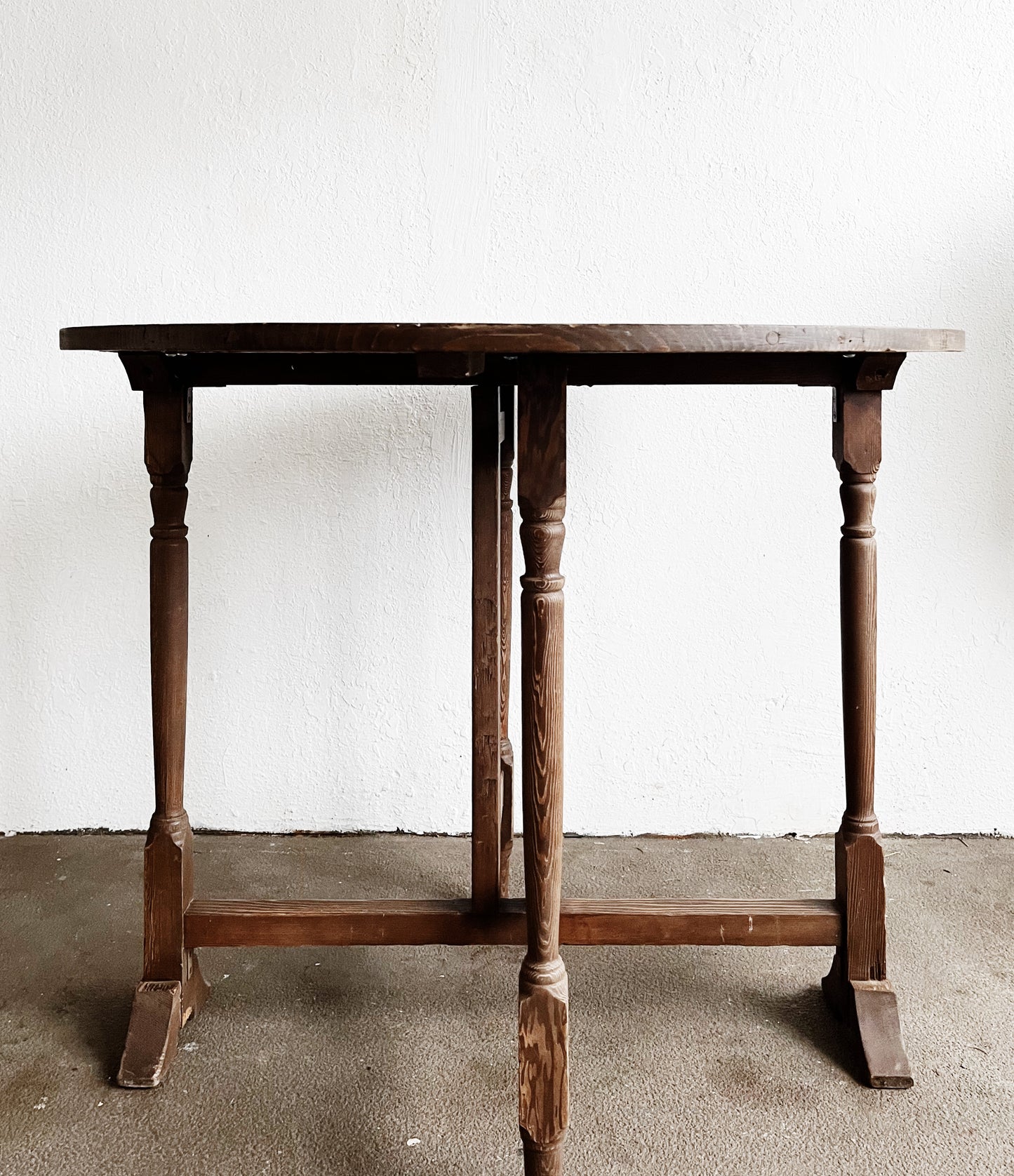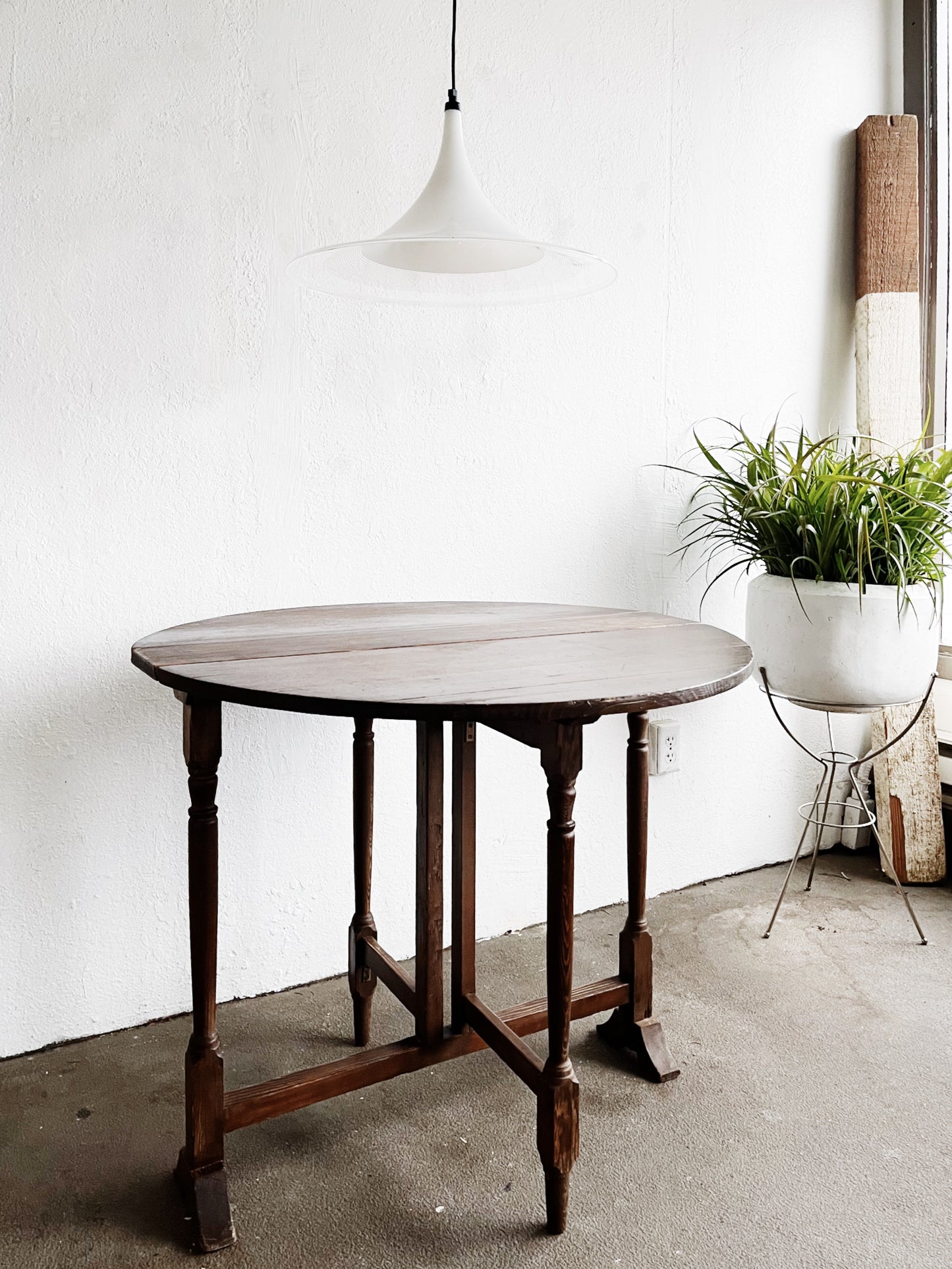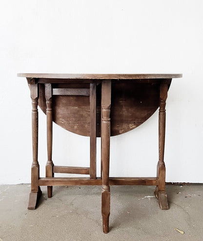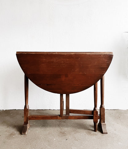 Lovely old round table with two drop leaves with gateleg supports. Opens to a round with variegated wood planks. One side alone can lower to create a demilune that makes a great desk for a small space. This table is very sturdy despite it’s age